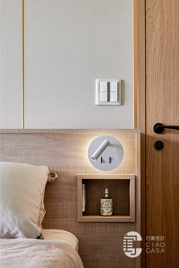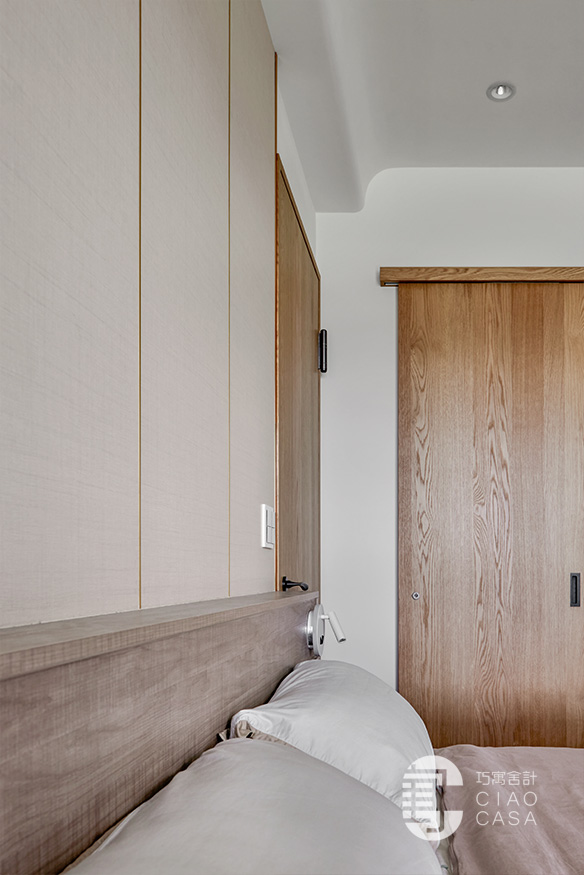 因應空間前後皆橫亙著梁體,一側遂以優雅的曲弧修潤邊角,減輕量體壓迫感,另一側則借助間接燈柔和的光源,平添舒心雅致的睡眠氣氛。