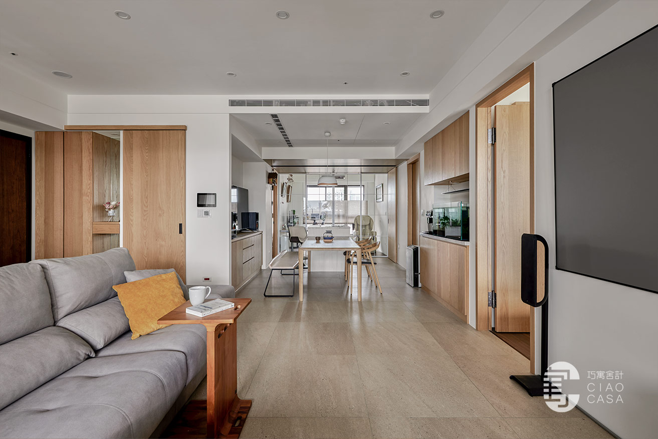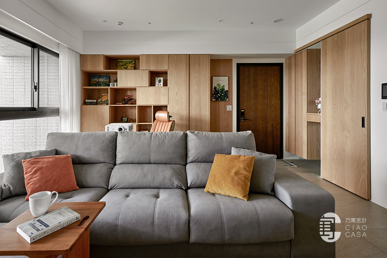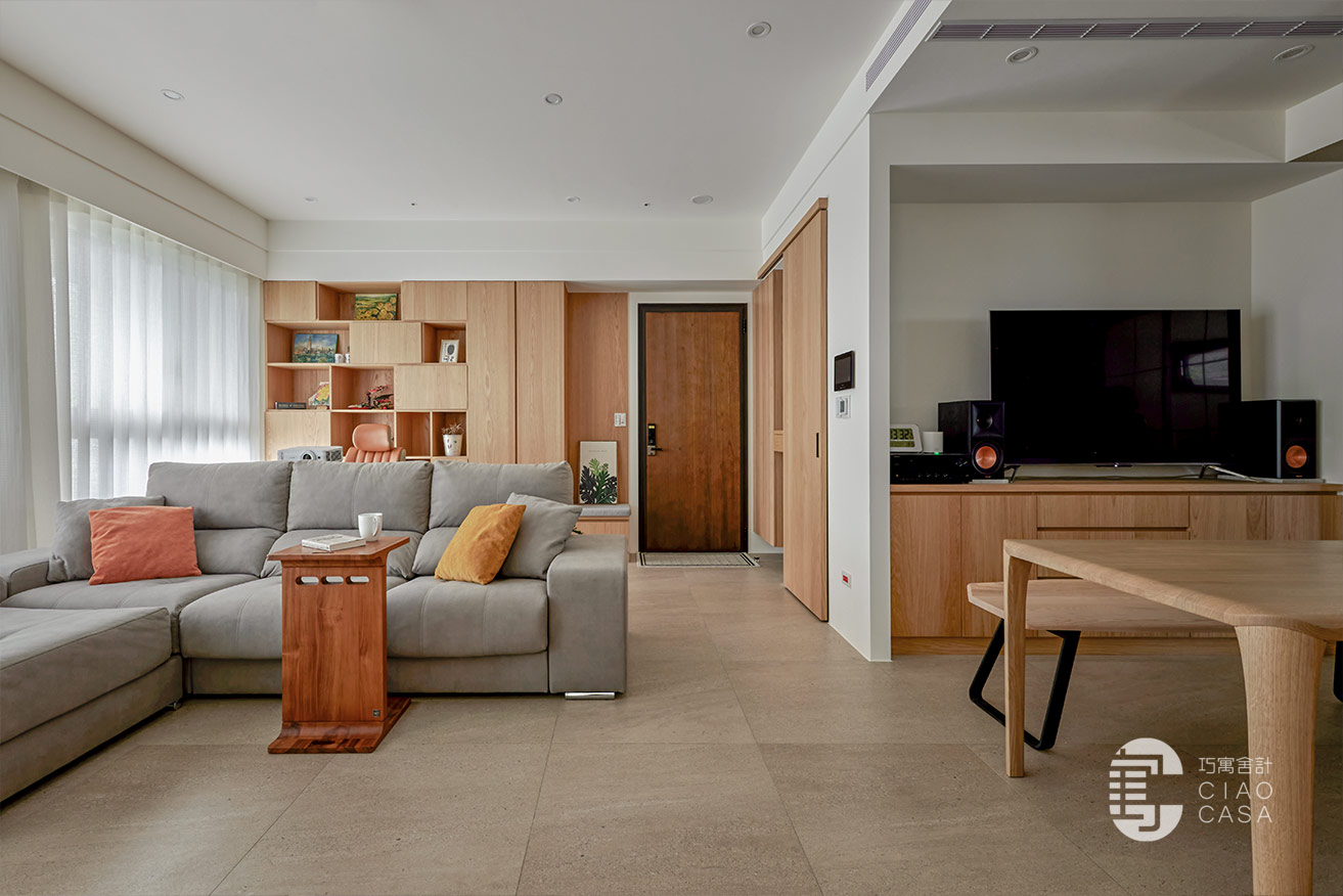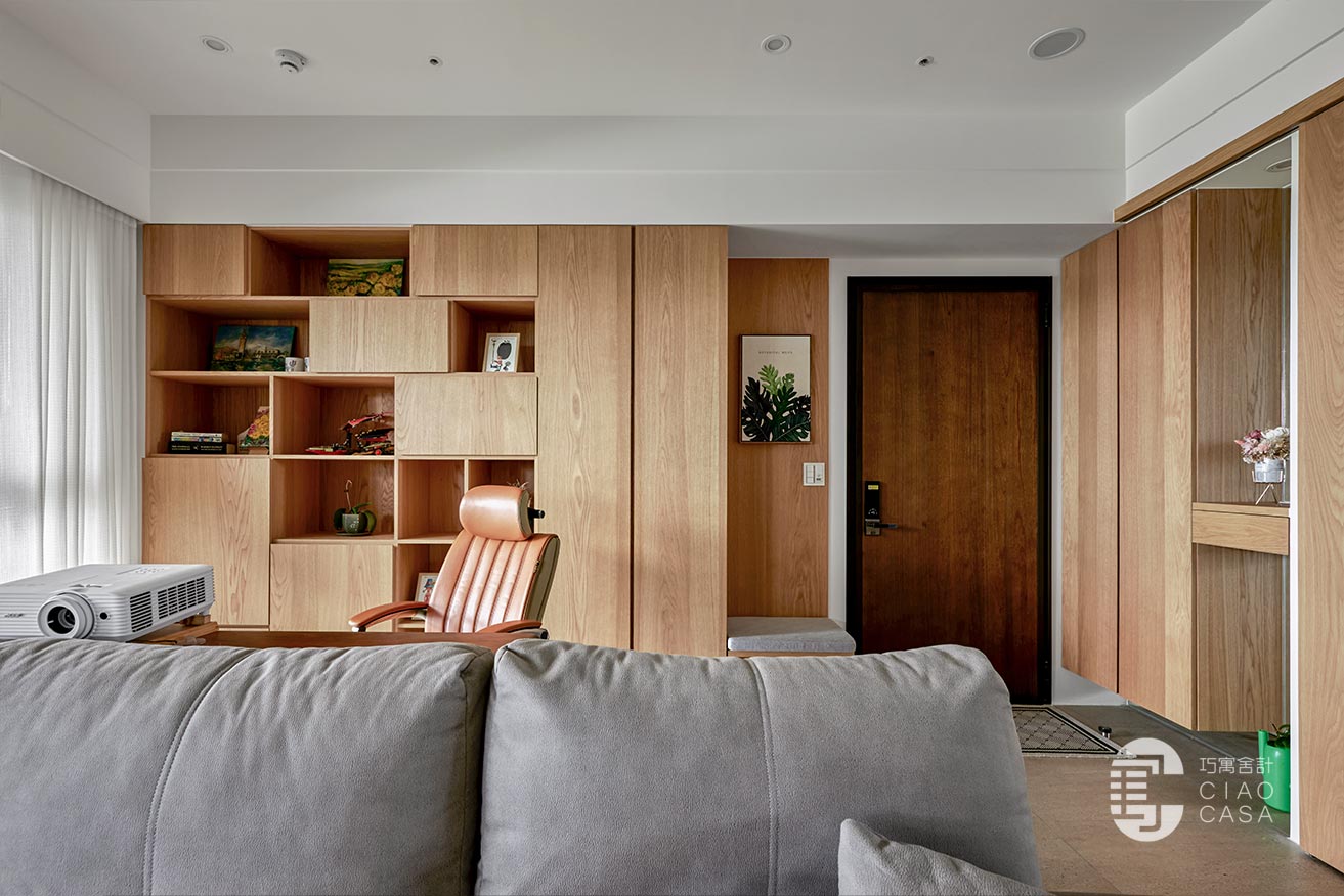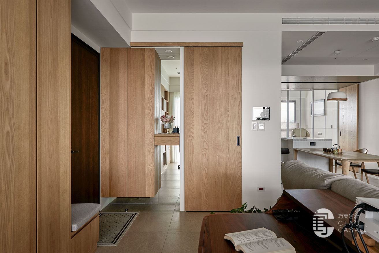推門而入,簡約的空間動線流動著自由氣息,柔光映亮的敞闊寬境,拉開了輕盈無壓的返家序幕;溫潤質樸的木紋脈絡,順隨櫃體立面貫穿全室,與留白基底和諧相襯,由此完整了視覺審美的統一性。