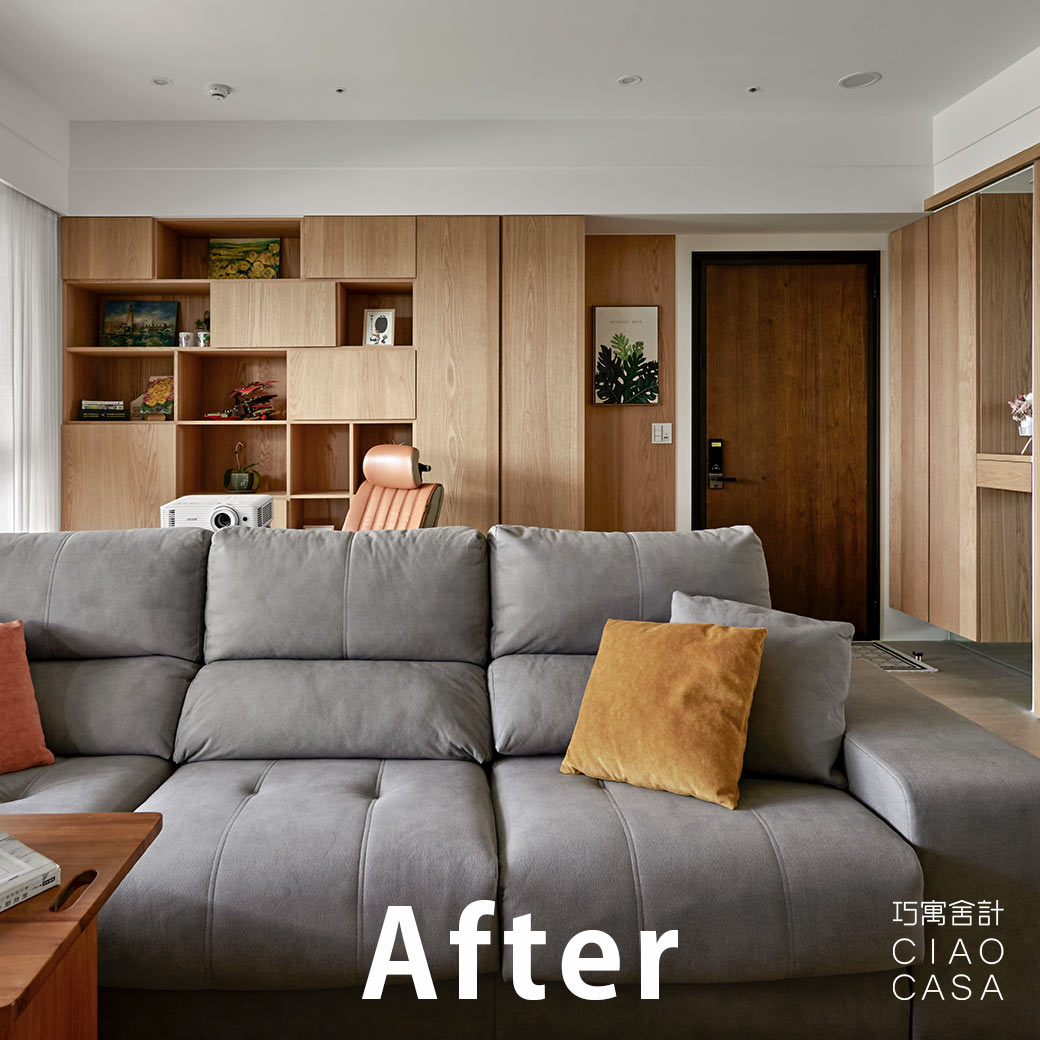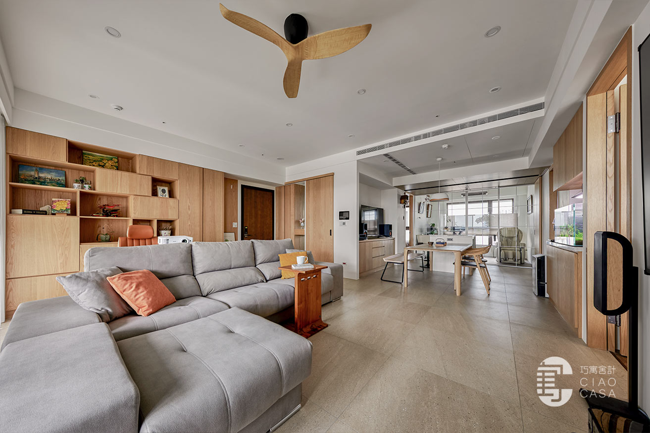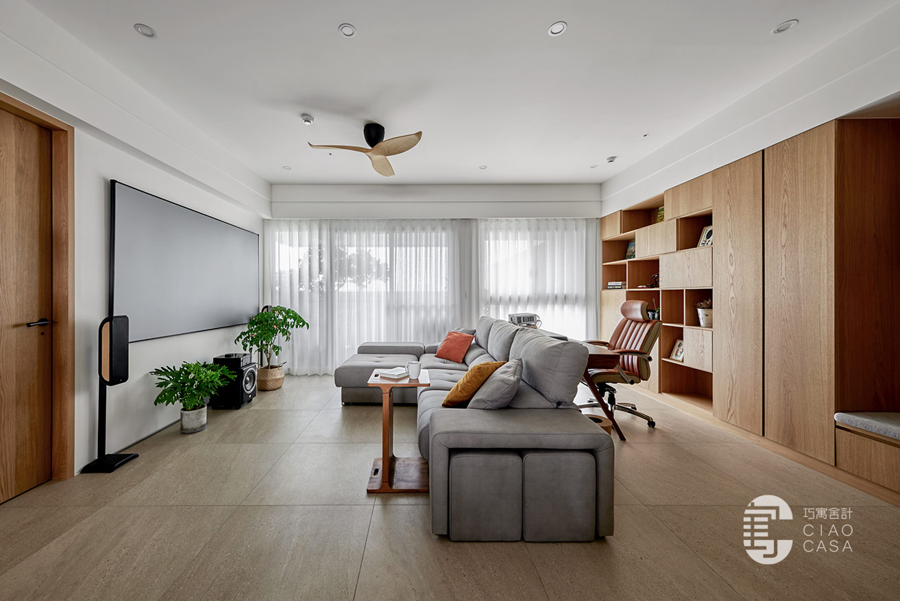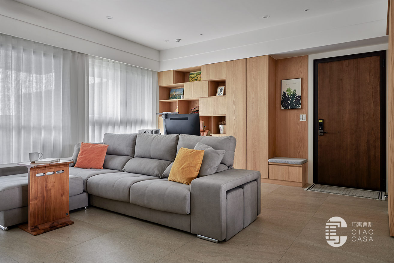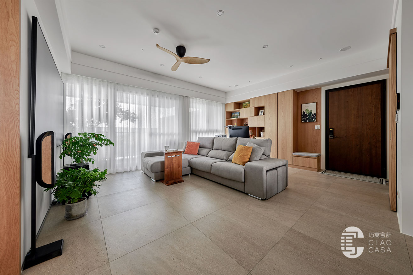 推門而入,簡約的空間動線流動著自由氣息,柔光映亮的敞闊寬境,拉開了輕盈無壓的返家序幕;溫潤質樸的木紋脈絡,順隨櫃體立面貫穿全室,與留白基底和諧相襯,由此完整了視覺審美的統一性。