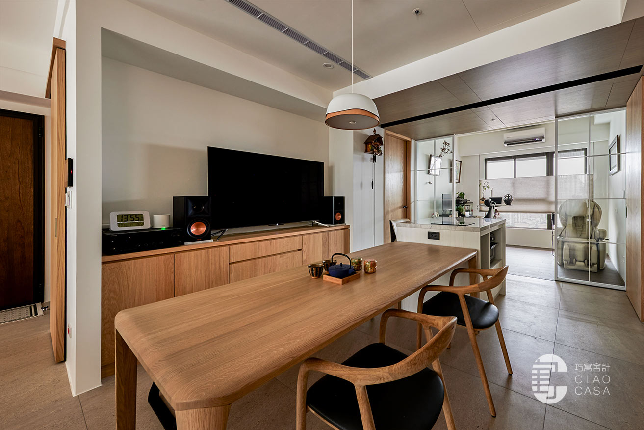 基於屋主的用餐習慣,有別於以往的配置,設計師將主要的電視影音設備移至餐廳轉折處,透過空間軸向與視角的變化,藉此達到場景轉換的效果。此外,天花巧用降板設計藏匿吊隱式冷氣,並以木皮包覆將頂上壓力化為無形,順勢弭平視覺上的突兀感,契合空間氣質。