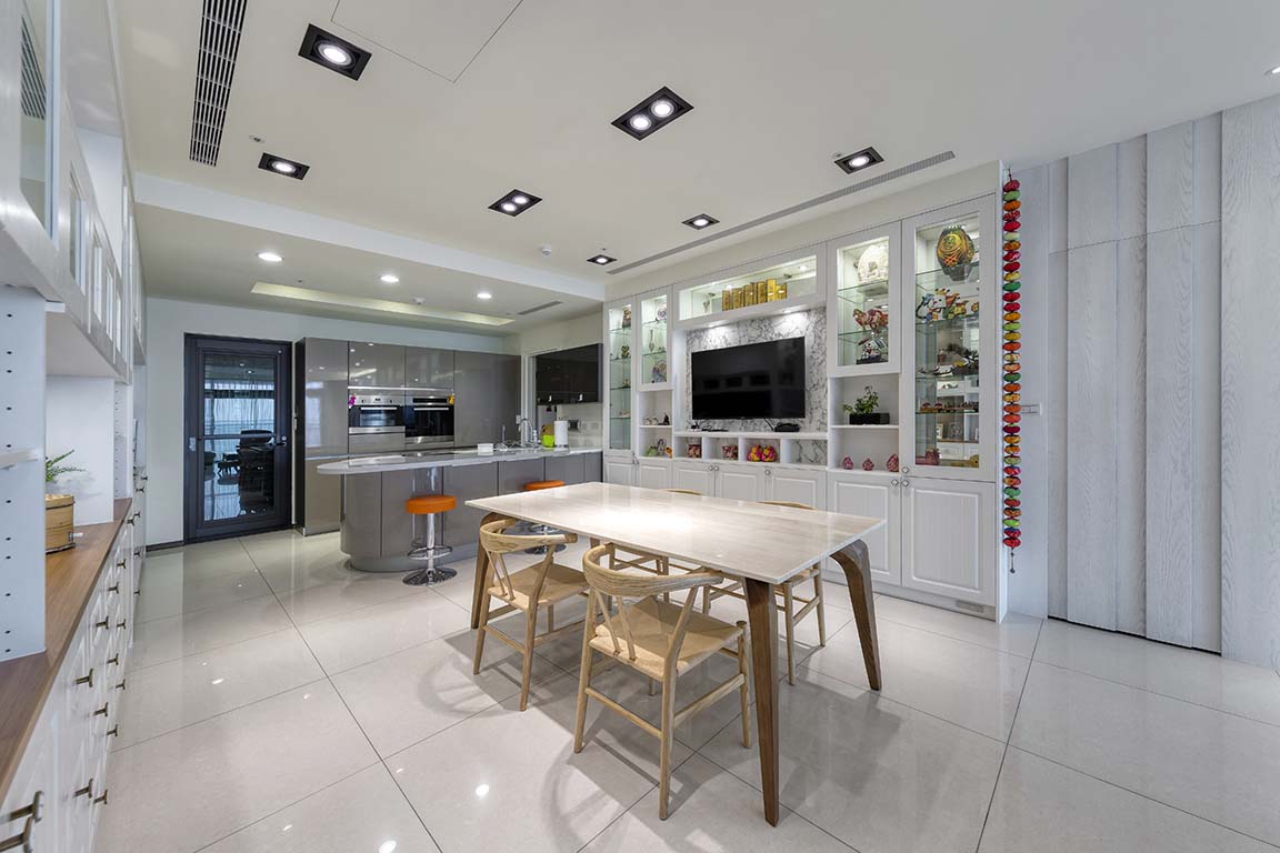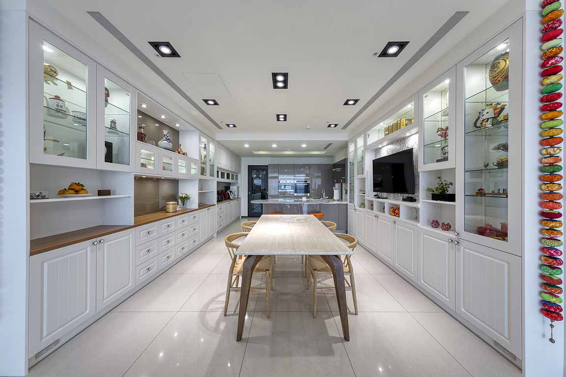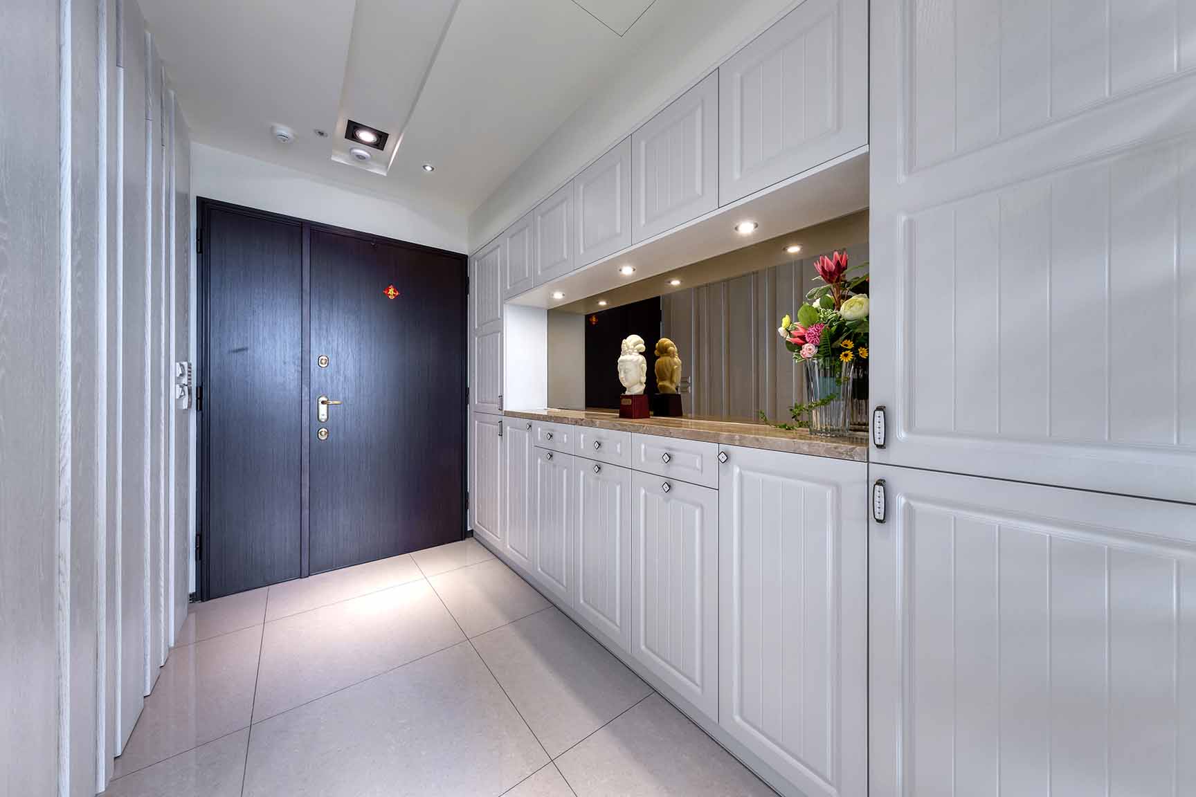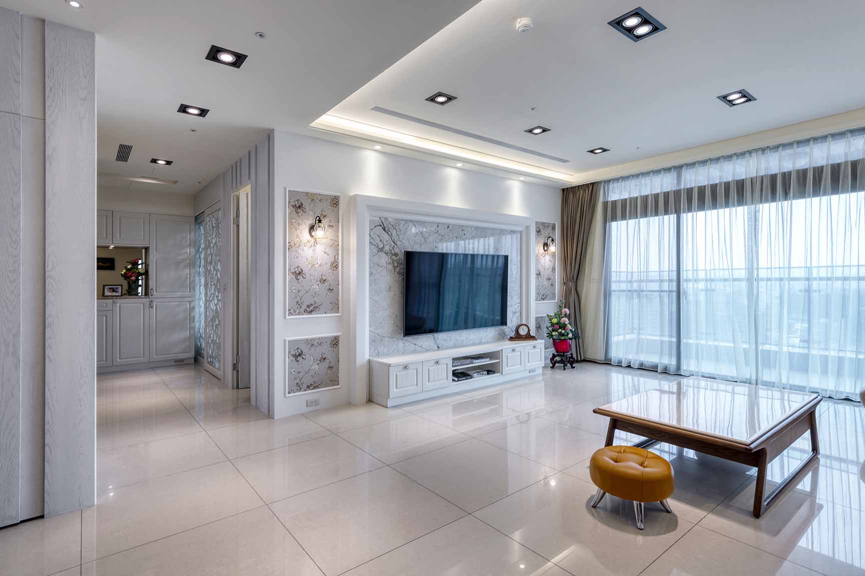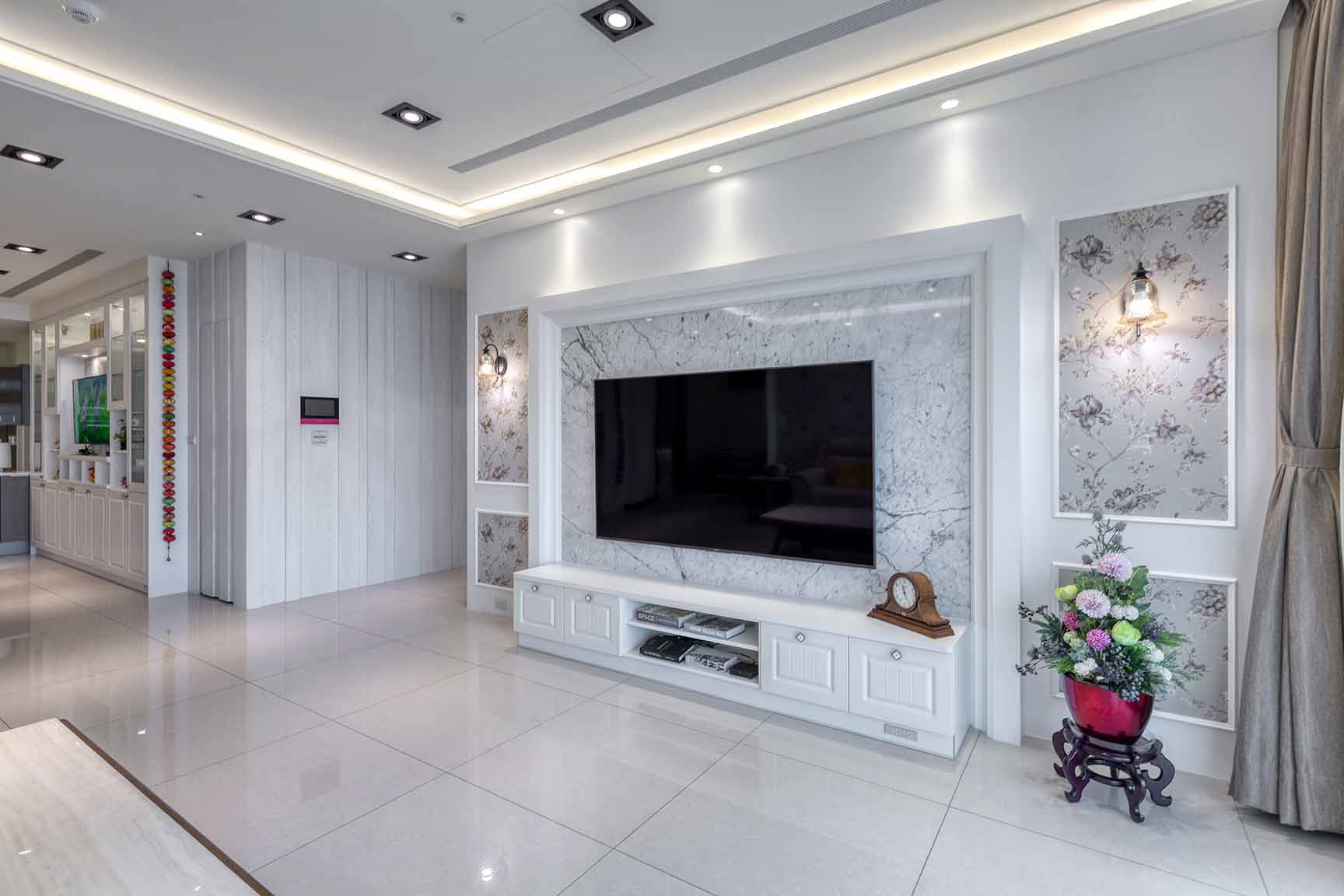 以白色線板系統板材搭配木質家具,為公領域形塑明亮、開闊的典雅質感,並以花紋壁紙及大理石電視牆點綴壁面,使空間共享現代與鄉村之美,依屋主生活習慣與喜好,運用系統傢俱量身打造各空間樣貌,滿足大量收納需求的同時,以明朗優雅品味勾勒幸福生活的藍圖。