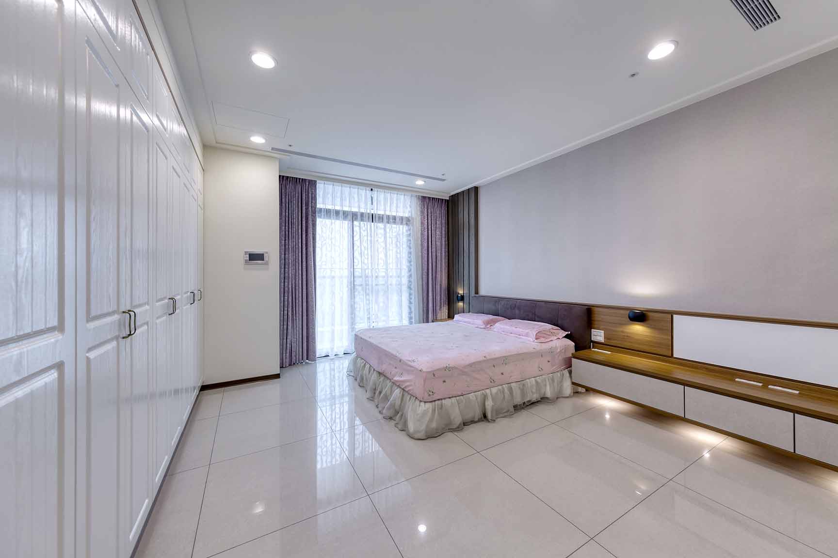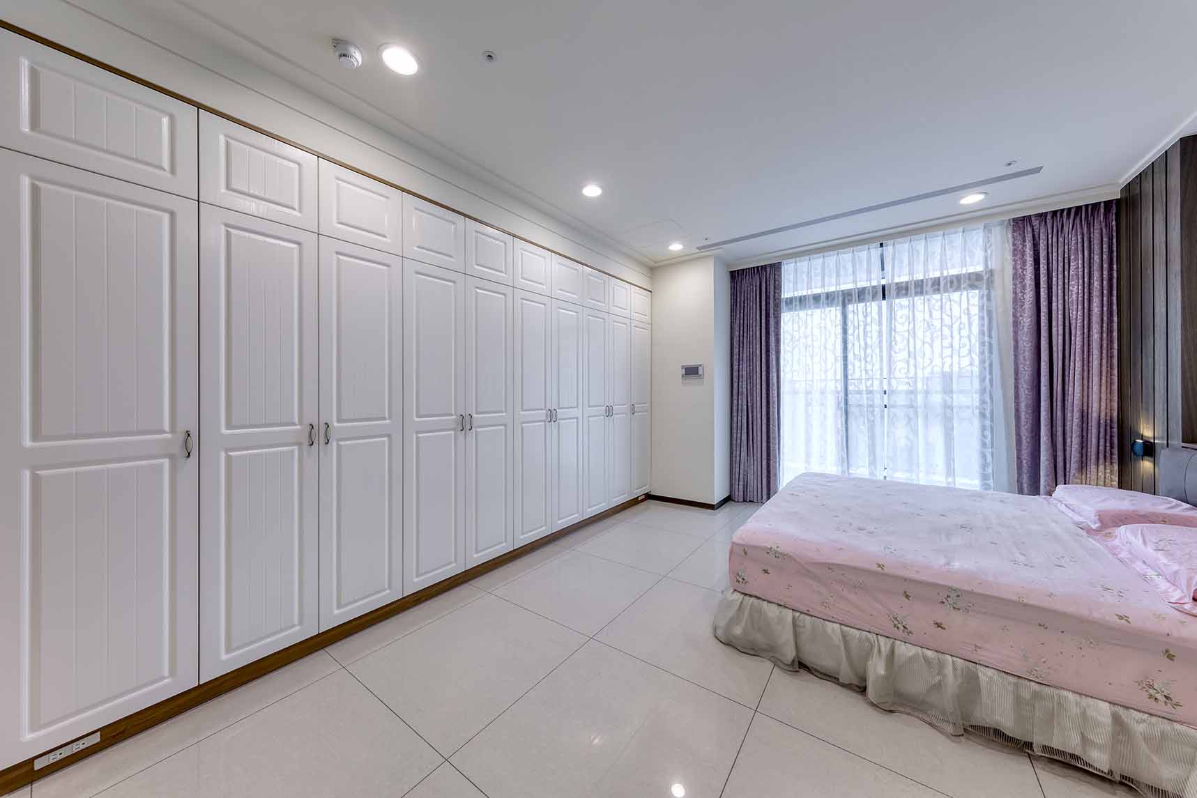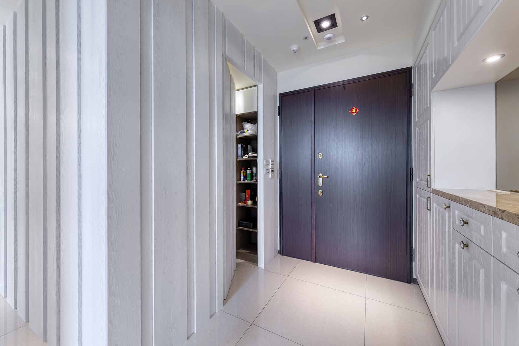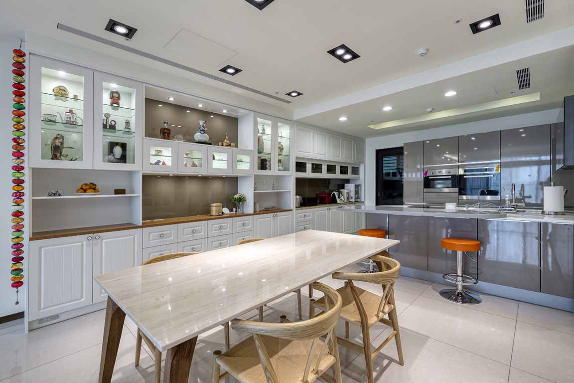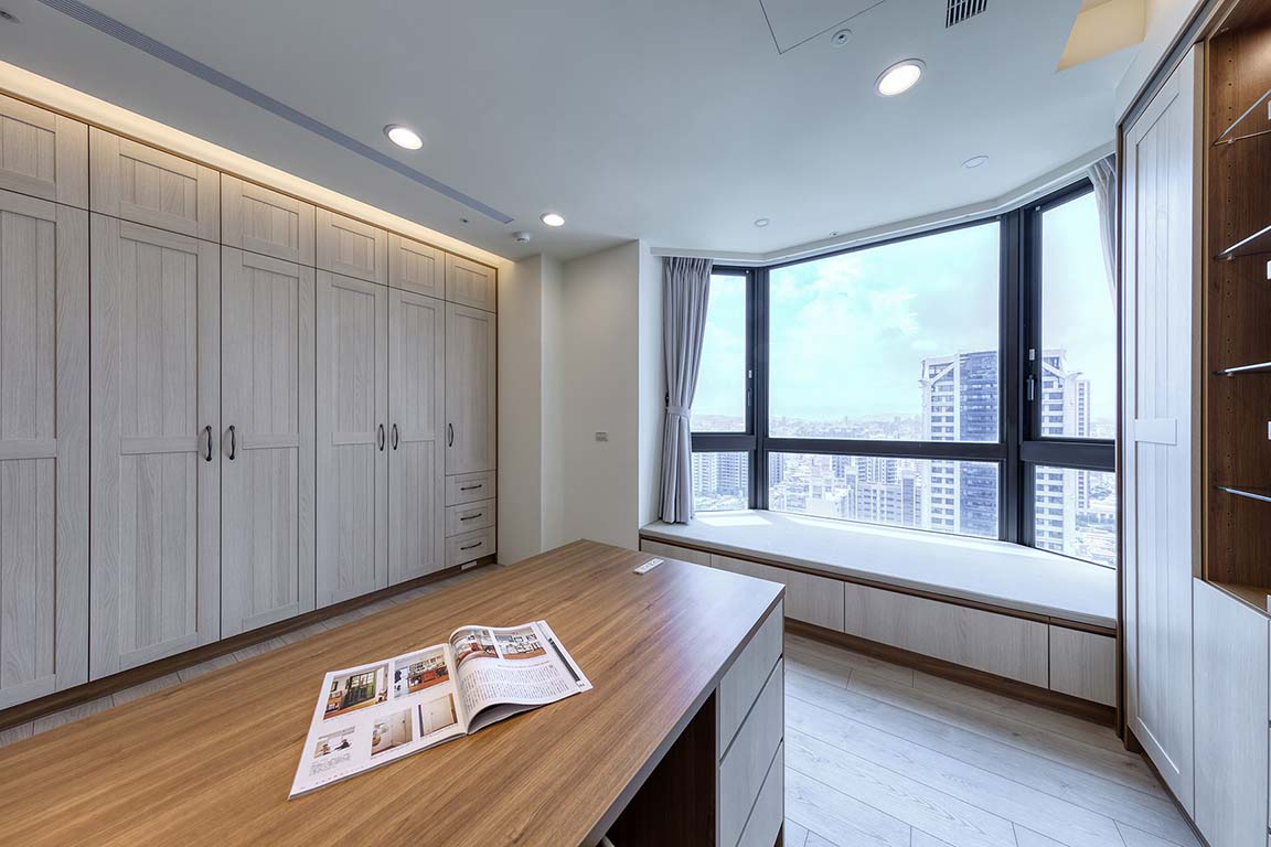 以白色線板系統板材搭配木質家具,為公領域形塑明亮、開闊的典雅質感,並以花紋壁紙及大理石電視牆點綴壁面,使空間共享現代與鄉村之美,依屋主生活習慣與喜好,運用系統傢俱量身打造各空間樣貌,滿足大量收納需求的同時,以明朗優雅品味勾勒幸福生活的藍圖。