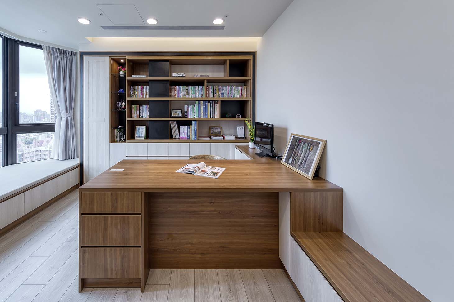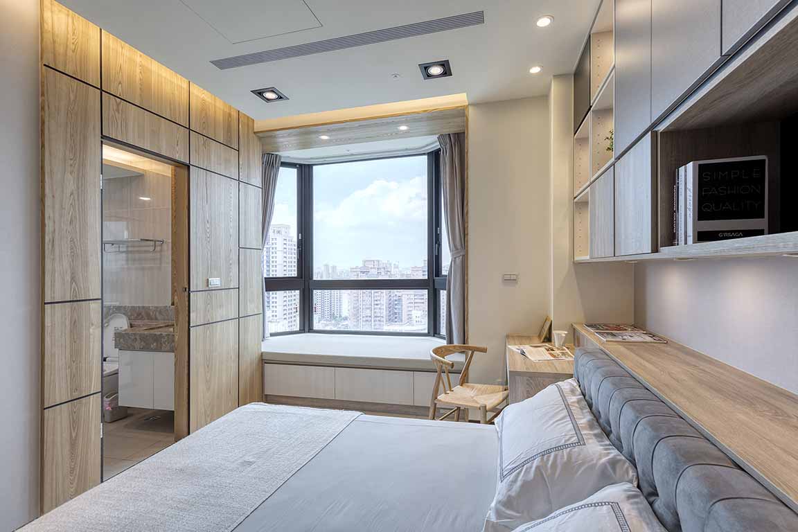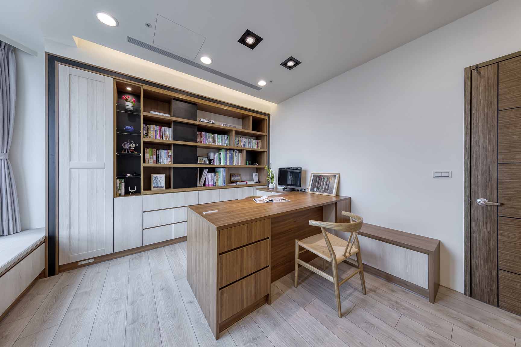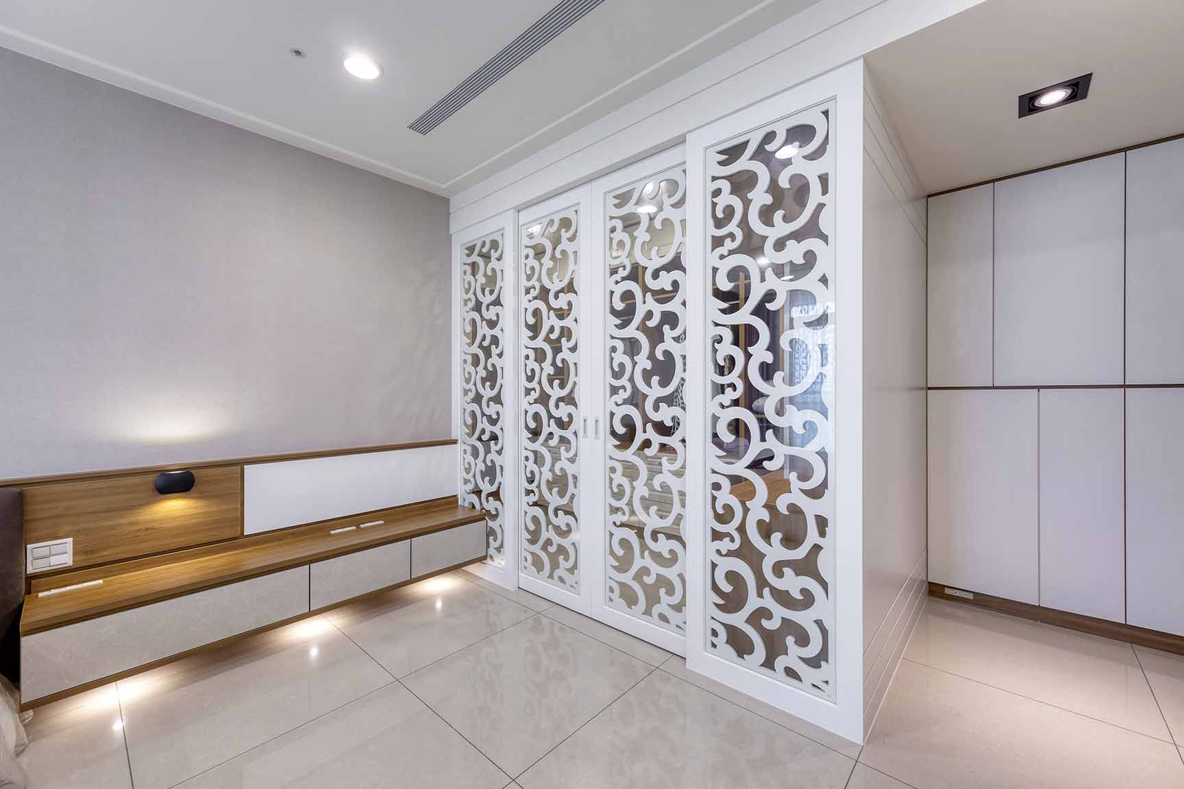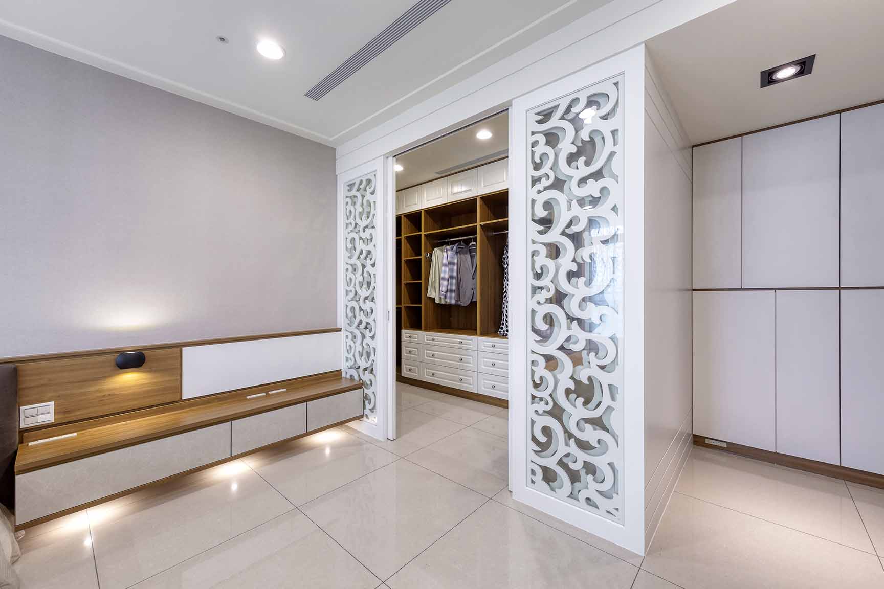 以白色線板系統板材搭配木質家具,為公領域形塑明亮、開闊的典雅質感,並以花紋壁紙及大理石電視牆點綴壁面,使空間共享現代與鄉村之美,依屋主生活習慣與喜好,運用系統傢俱量身打造各空間樣貌,滿足大量收納需求的同時,以明朗優雅品味勾勒幸福生活的藍圖。