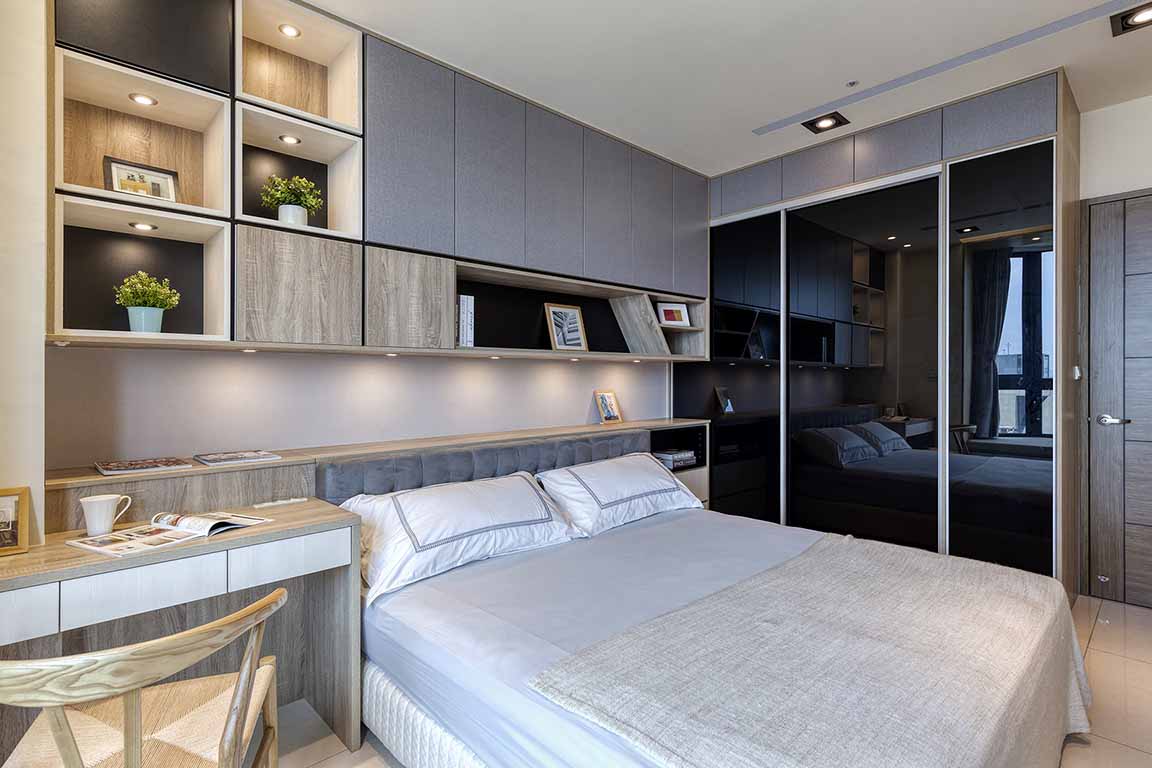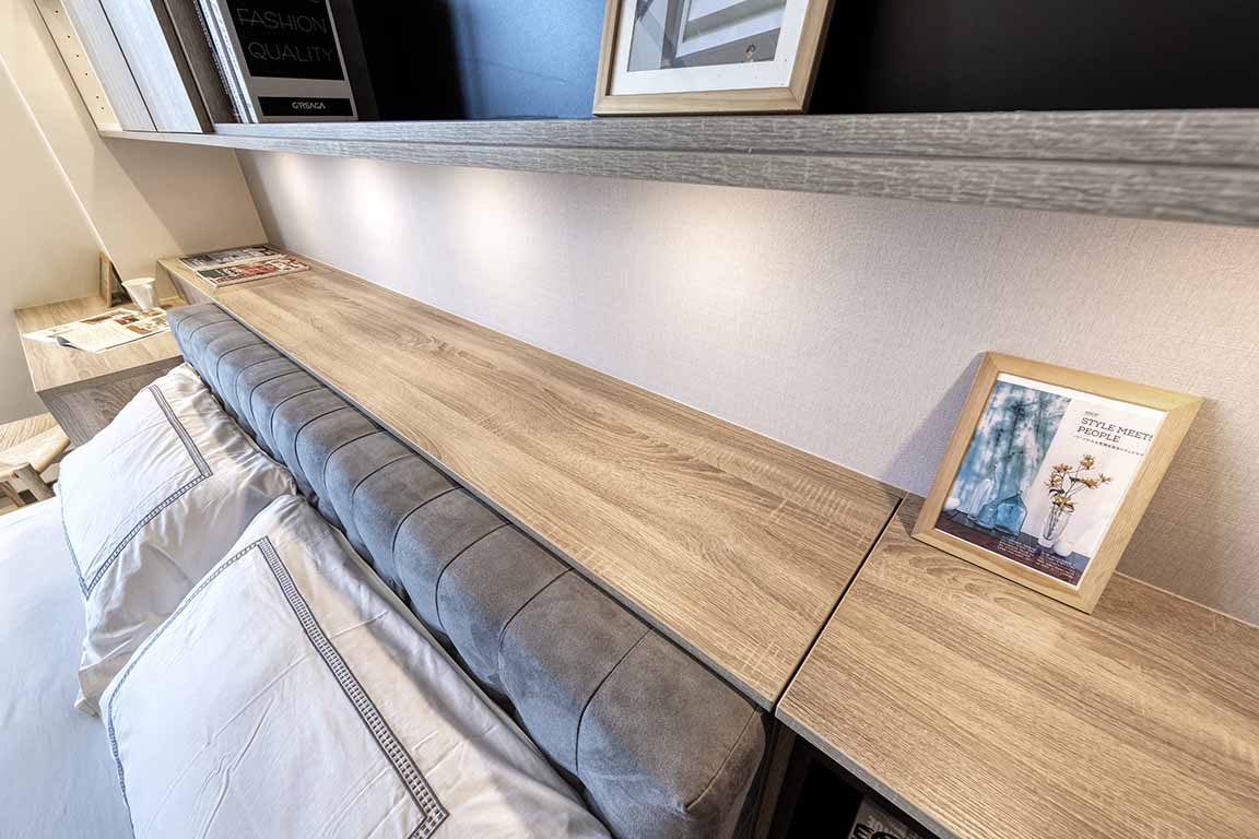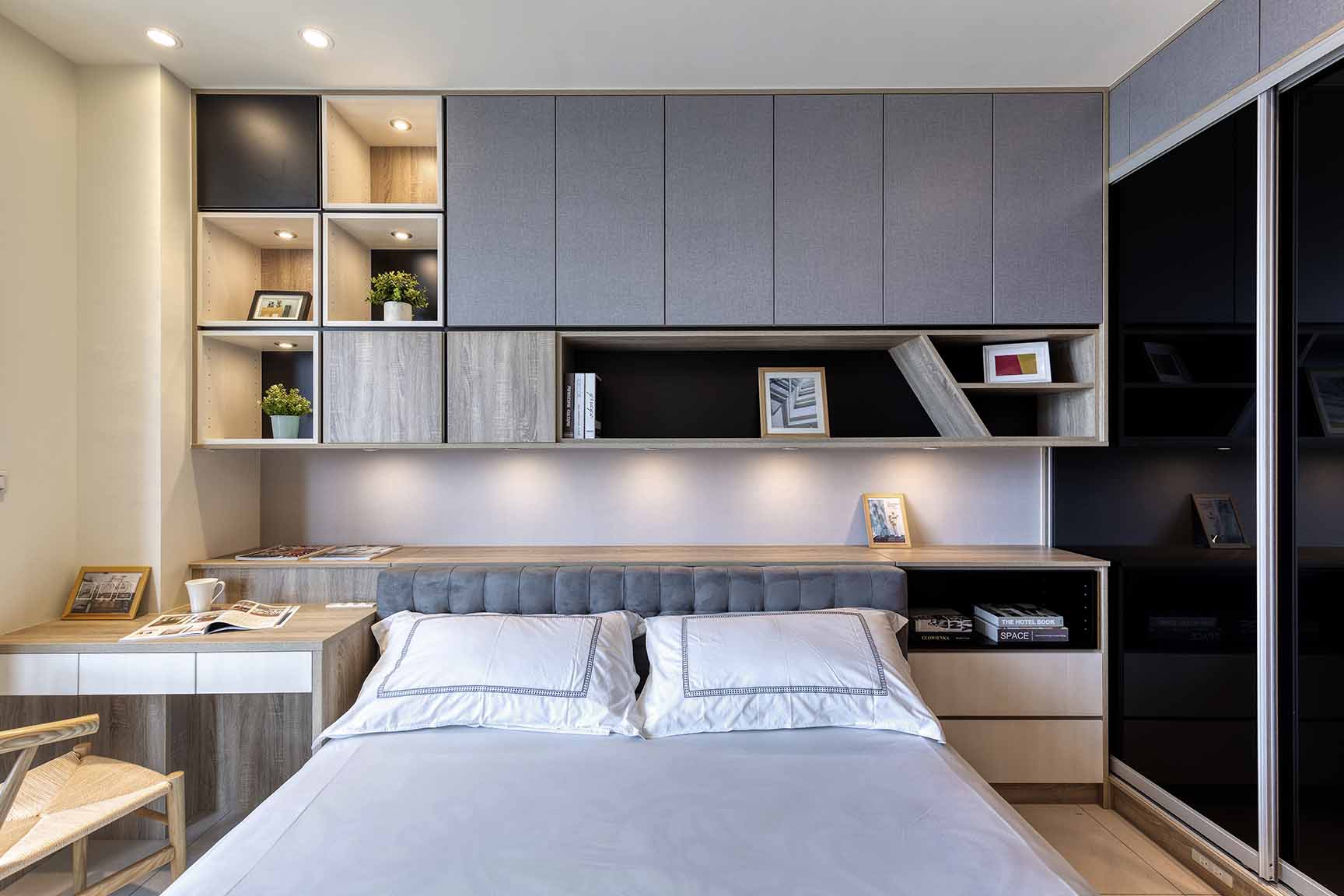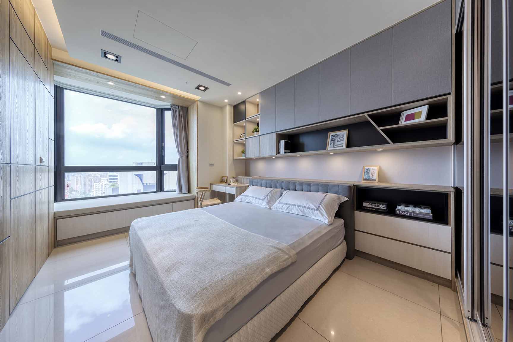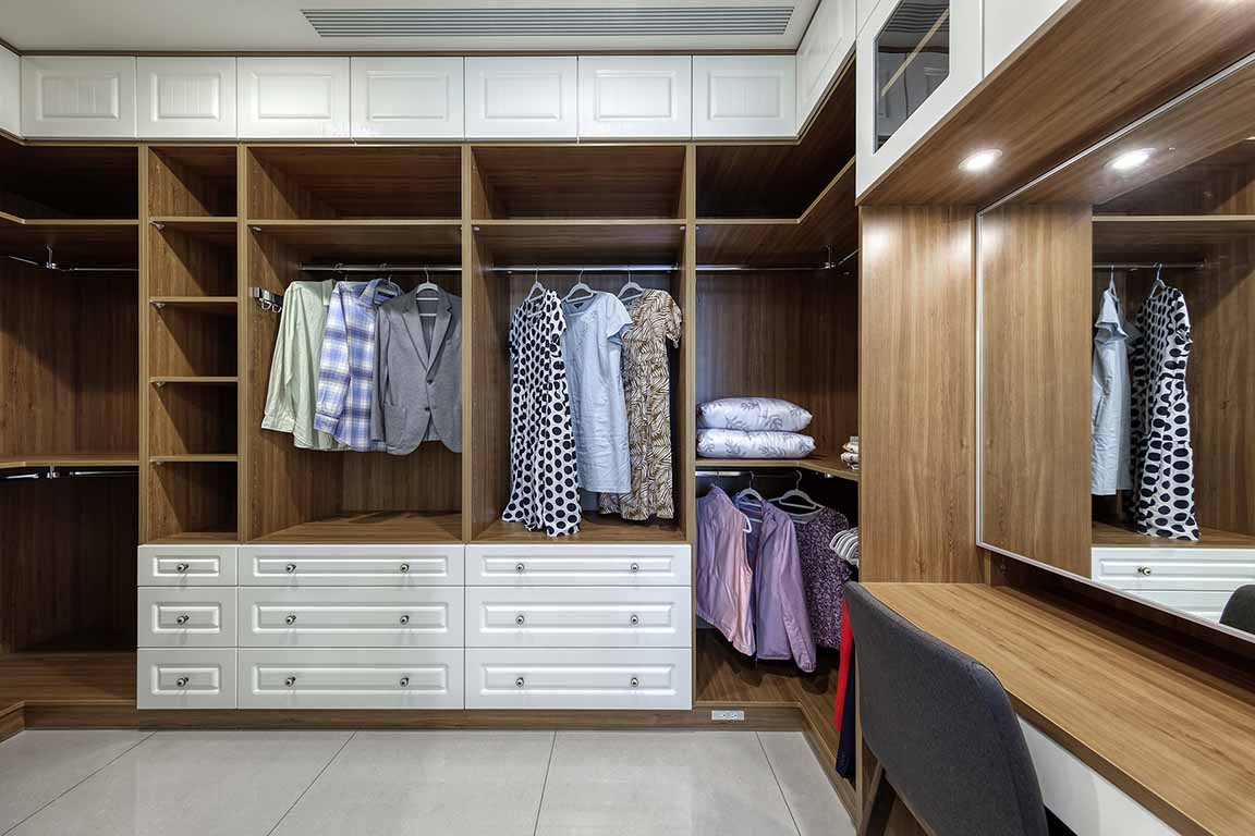 以白色線板系統板材搭配木質家具,為公領域形塑明亮、開闊的典雅質感,並以花紋壁紙及大理石電視牆點綴壁面,使空間共享現代與鄉村之美,依屋主生活習慣與喜好,運用系統傢俱量身打造各空間樣貌,滿足大量收納需求的同時,以明朗優雅品味勾勒幸福生活的藍圖。