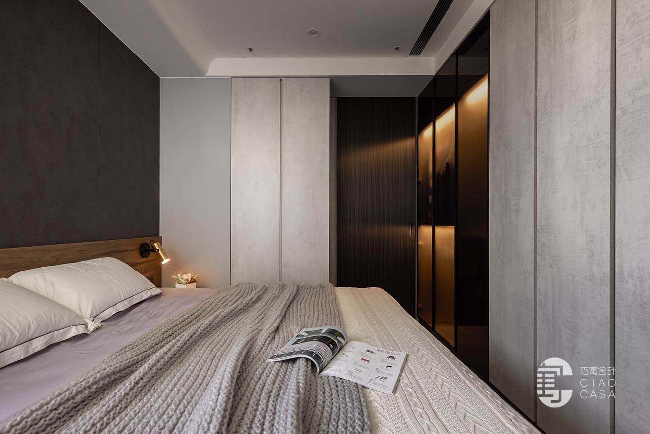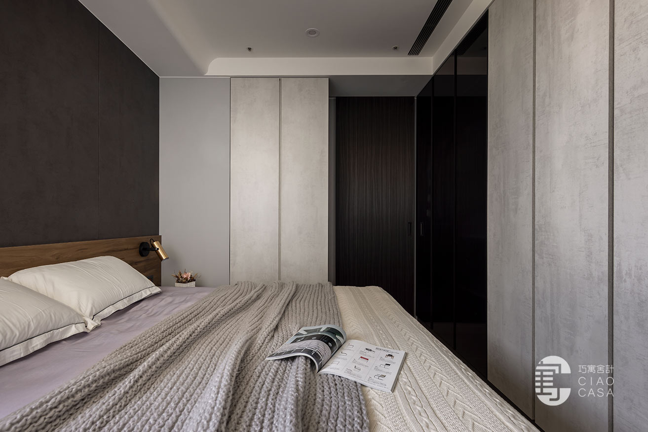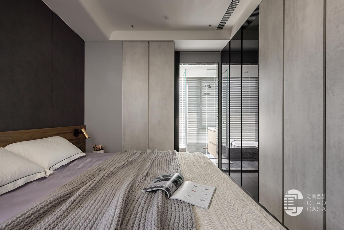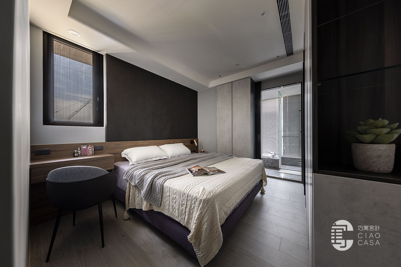 突破慣常溫雅柔和的風格選擇,設計師過濾掉多餘的色彩和形式,在簡淡的黑色境域裡,讓一切元素都靜止下來,徒留靜謐安穩的休憩氣氛。此外,床頭梳妝區利用活動式鏡門隱藏採光窗、衛浴增設木質實門界分場域,在門片開闔之間,創造出晝夜光景各異的時序之美。