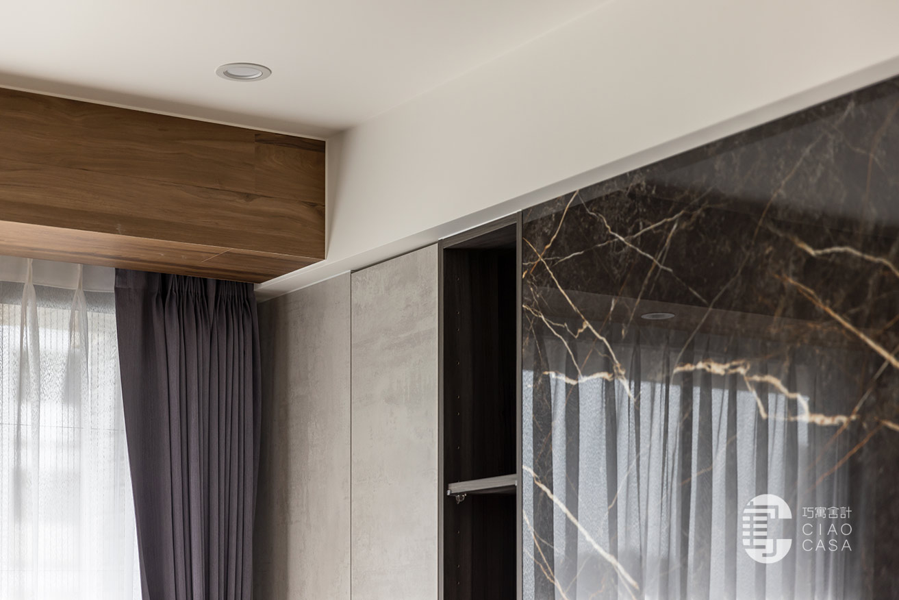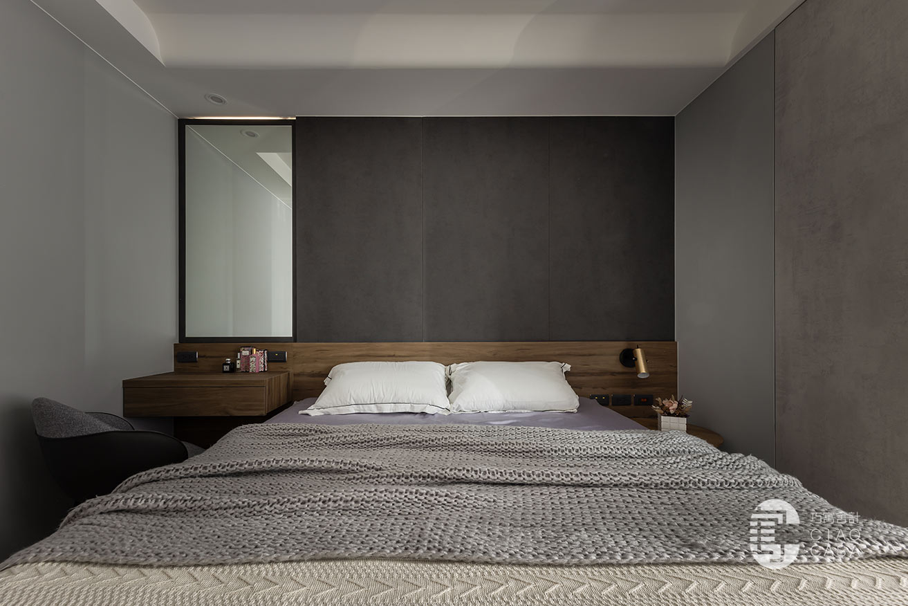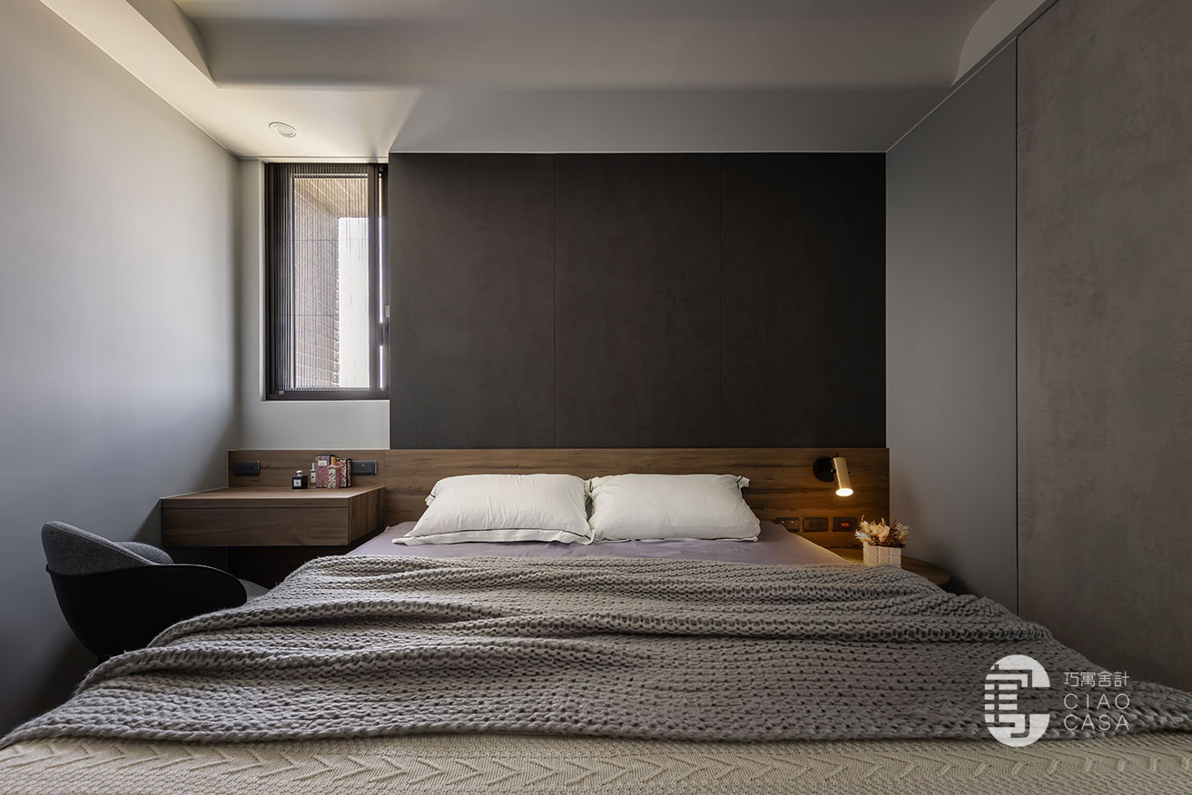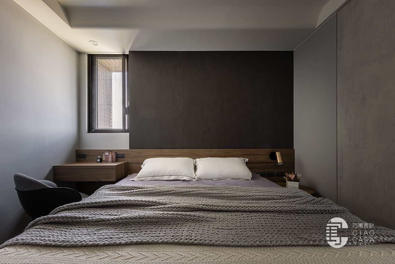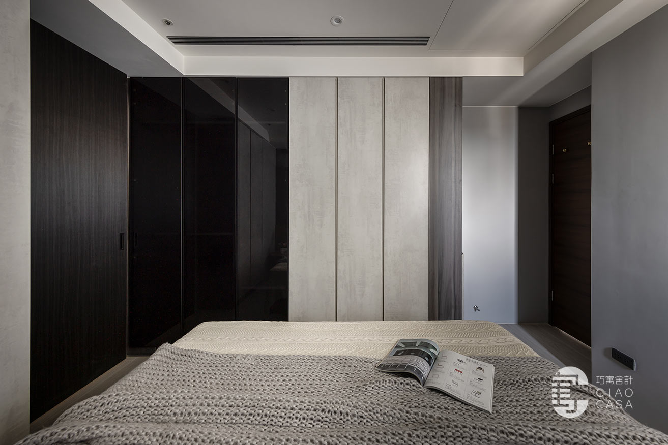 突破慣常溫雅柔和的風格選擇,設計師過濾掉多餘的色彩和形式,在簡淡的黑色境域裡,讓一切元素都靜止下來,徒留靜謐安穩的休憩氣氛。此外,床頭梳妝區利用活動式鏡門隱藏採光窗、衛浴增設木質實門界分場域,在門片開闔之間,創造出晝夜光景各異的時序之美。