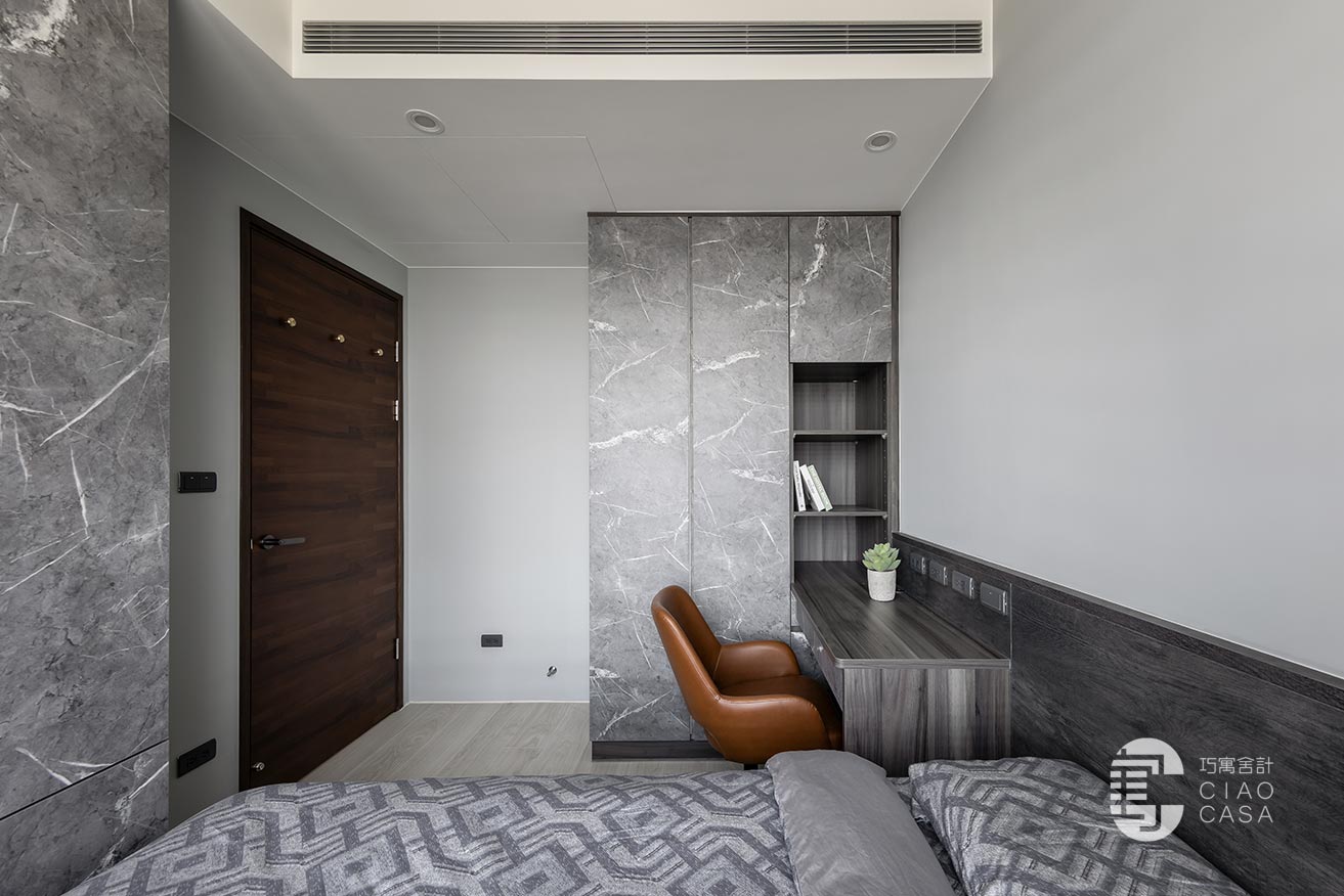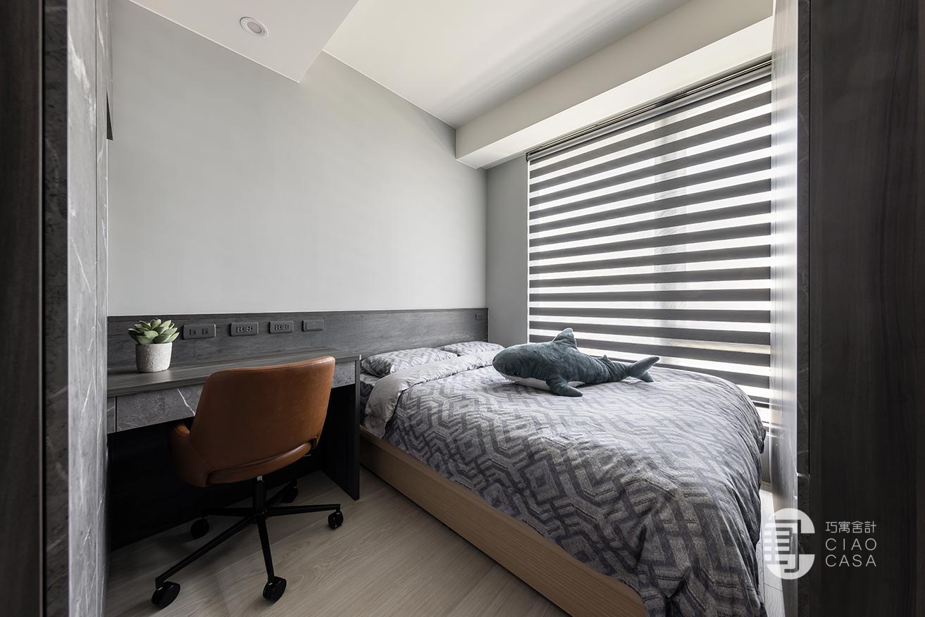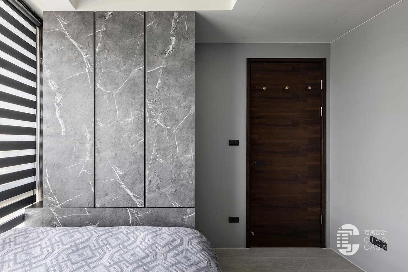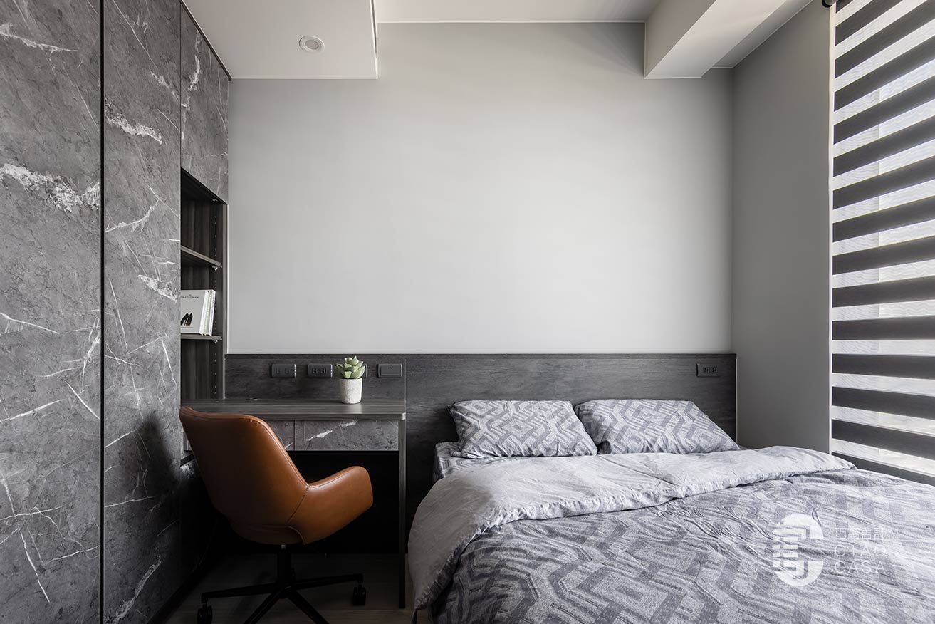 突破慣常溫雅柔和的風格選擇,設計師過濾掉多餘的色彩和形式,在簡淡的黑色境域裡,讓一切元素都靜止下來,徒留靜謐安穩的休憩氣氛。此外,床頭梳妝區利用活動式鏡門隱藏採光窗、衛浴增設木質實門界分場域,在門片開闔之間,創造出晝夜光景各異的時序之美。