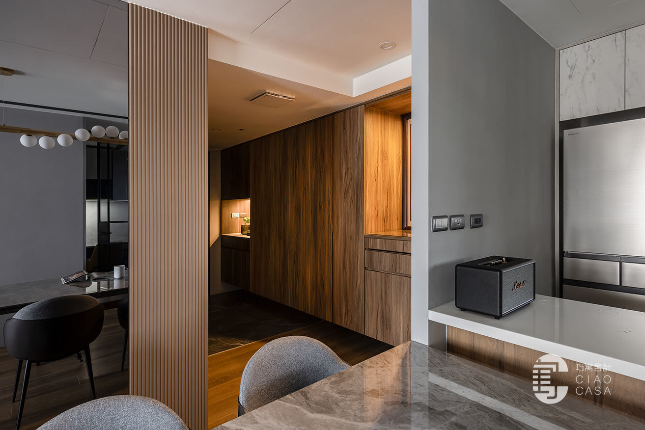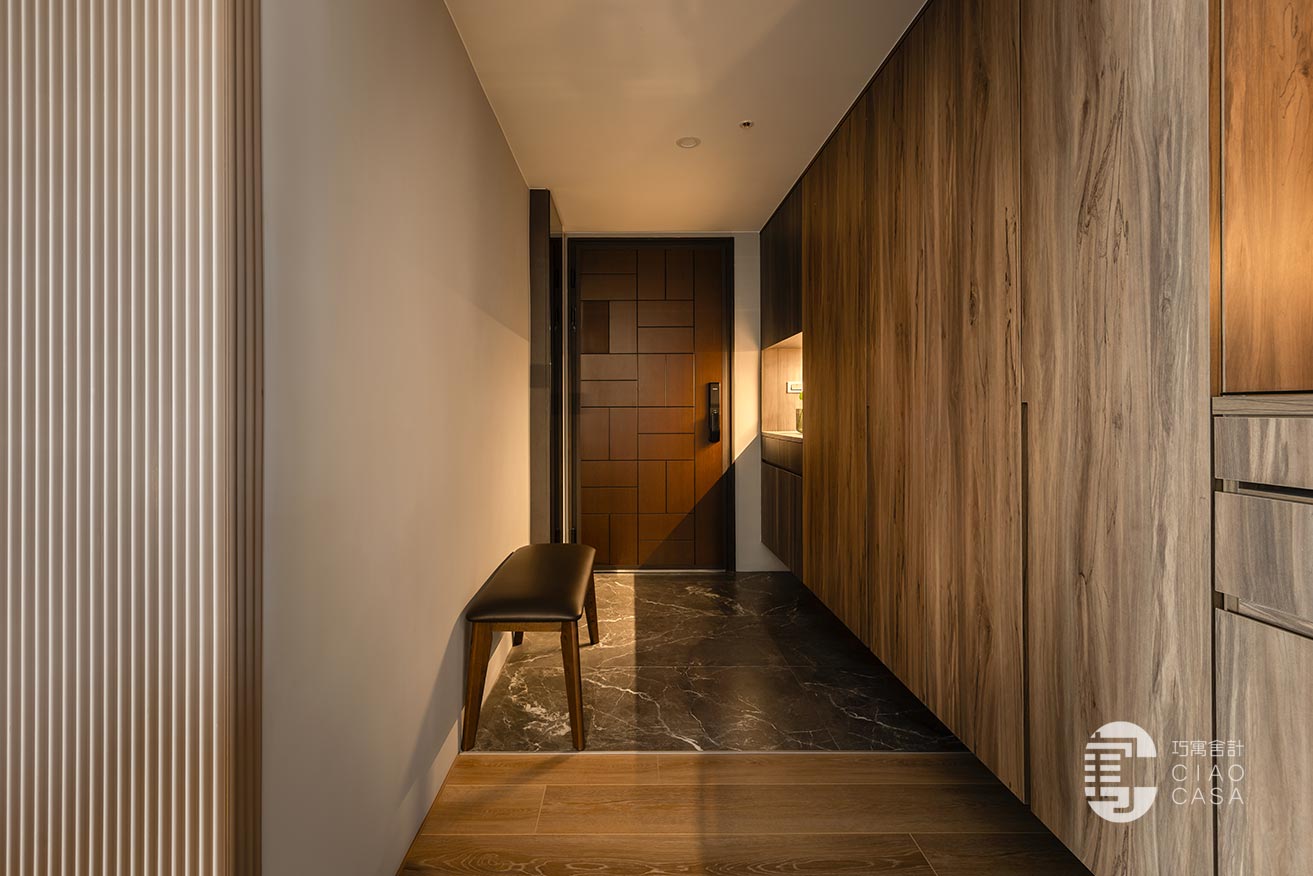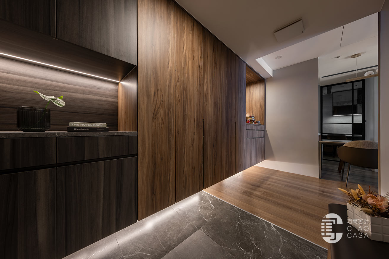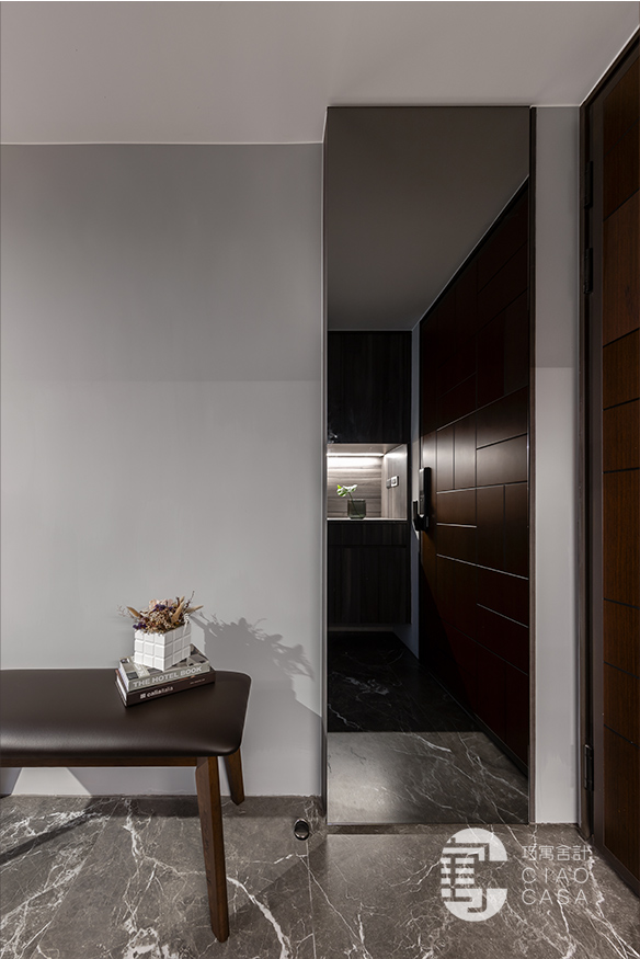 幽闇低婉的光影,在長廊式的玄關裡嬈嬈綽綽,映照著思緒的流動,循序漸進的行經過程,皆是深具儀式性的心境鋪陳。黑底白紋的大板地磚,表面動態感的流紋,使義式輕奢的氣韵在優雅的氛圍中收放自如,同時與溫潤的木地板立下清晰的內外分野。