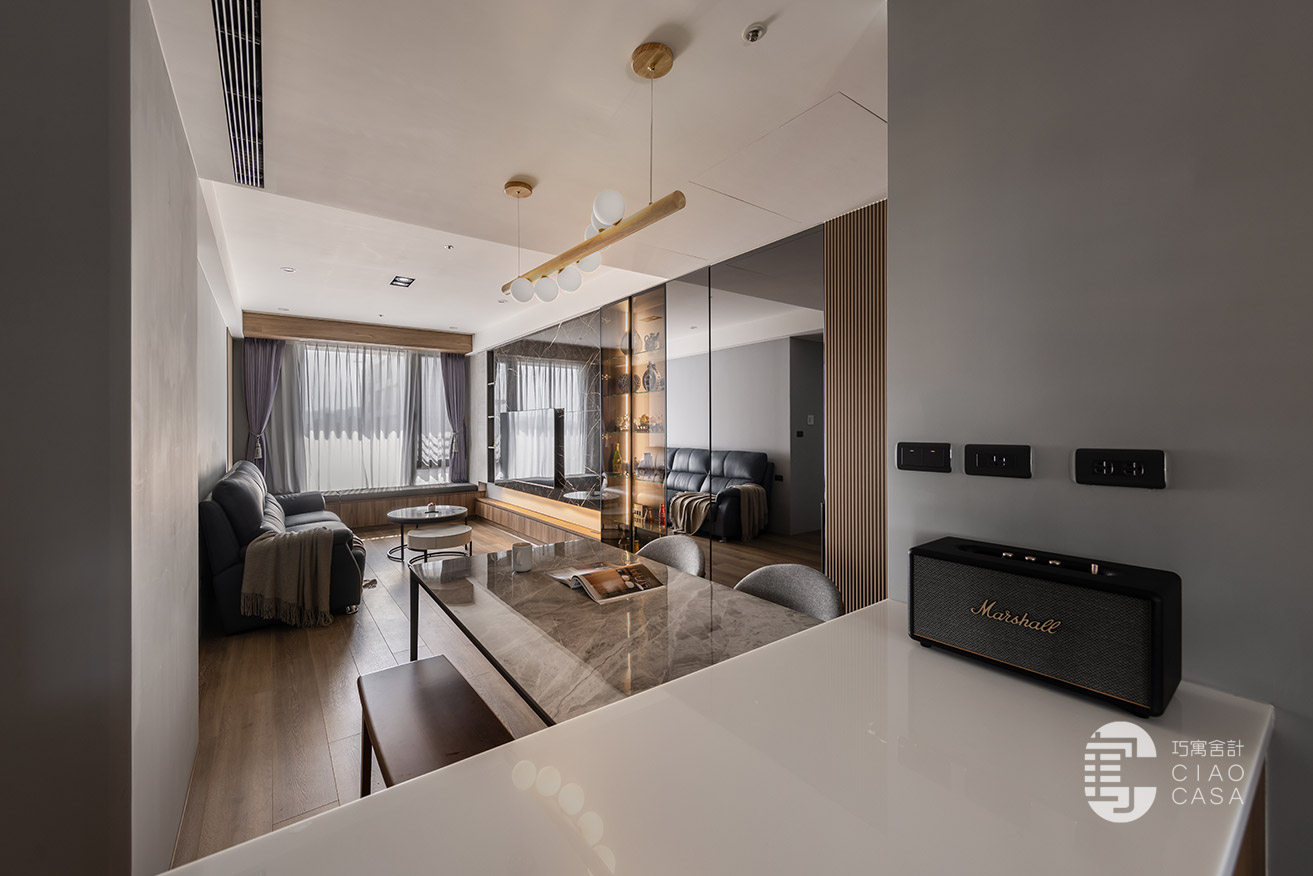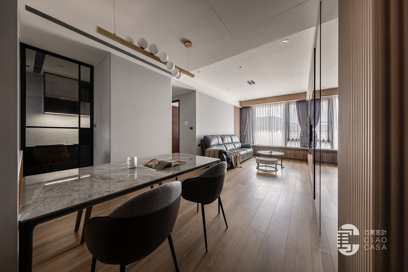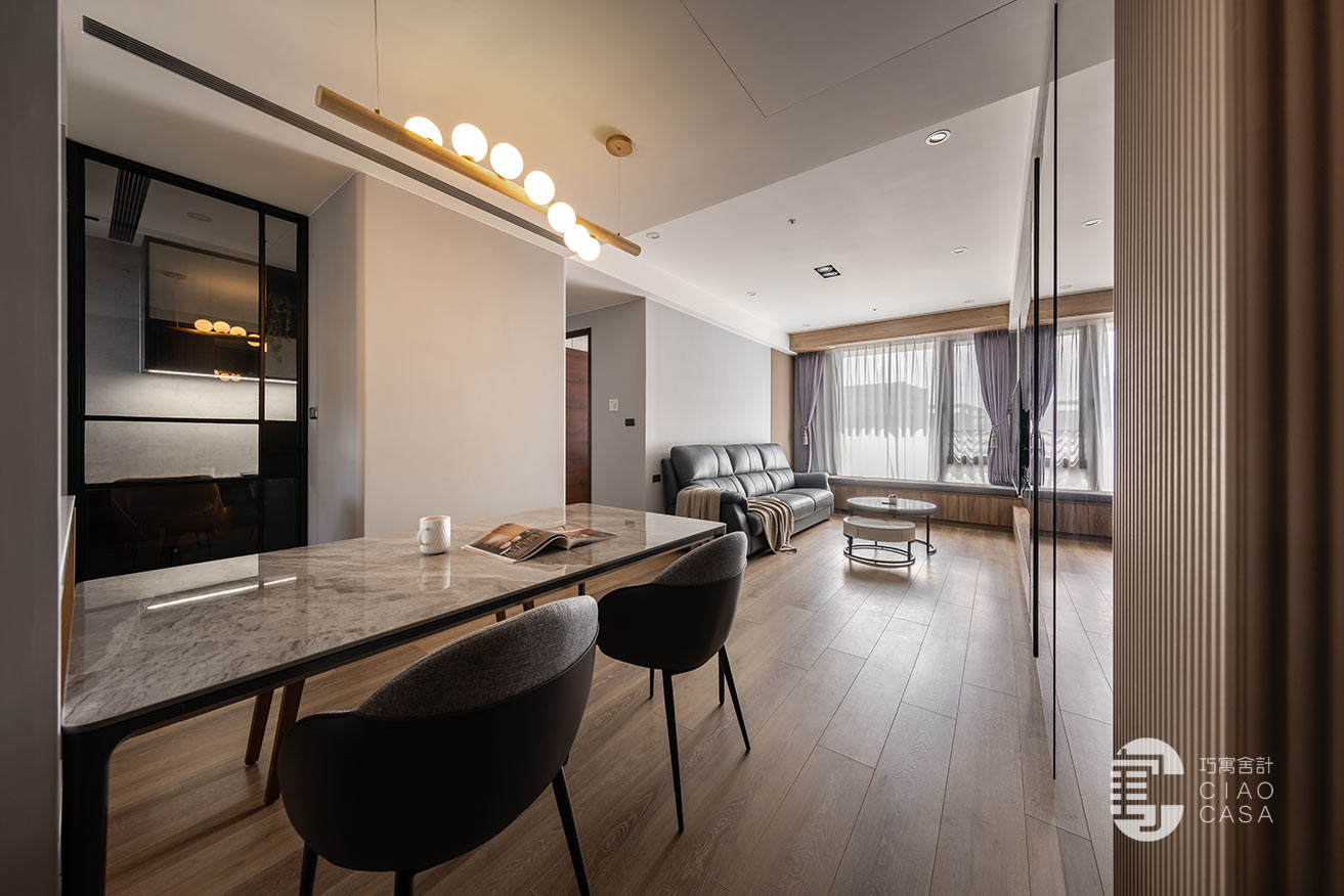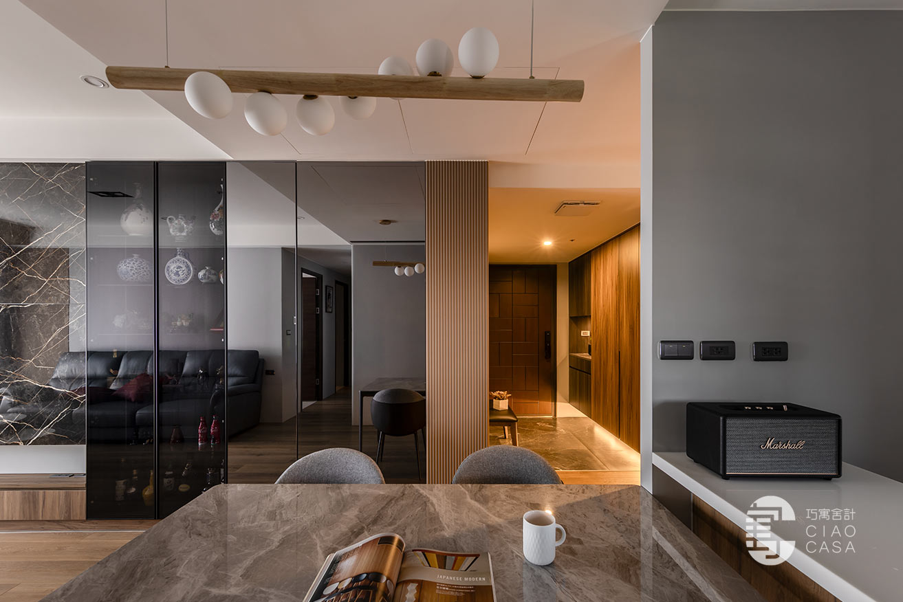 幽闇低婉的光影,在長廊式的玄關裡嬈嬈綽綽,映照著思緒的流動,循序漸進的行經過程,皆是深具儀式性的心境鋪陳。黑底白紋的大板地磚,表面動態感的流紋,使義式輕奢的氣韵在優雅的氛圍中收放自如,同時與溫潤的木地板立下清晰的內外分野。