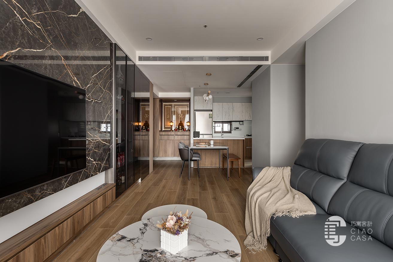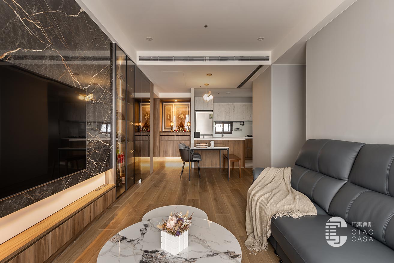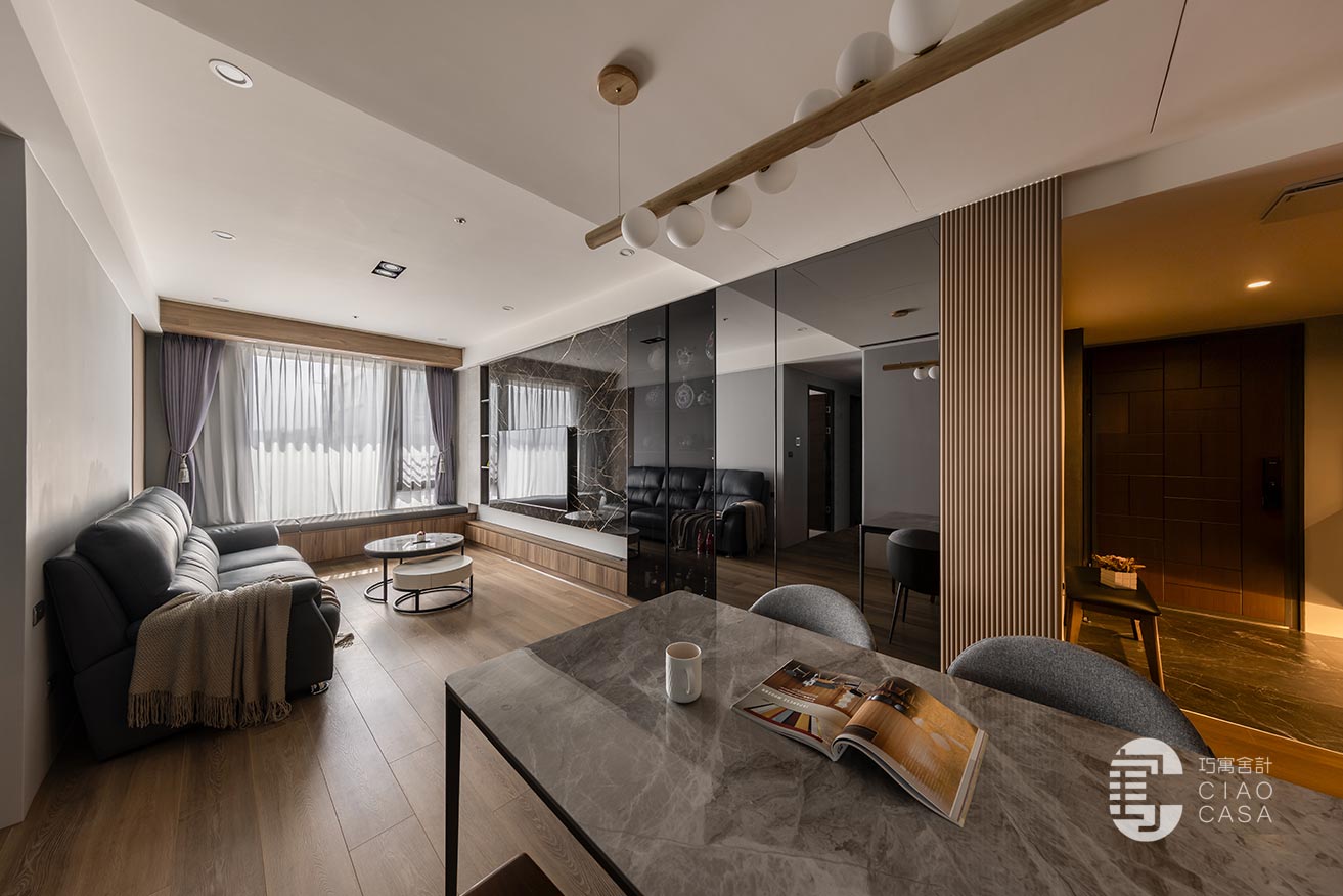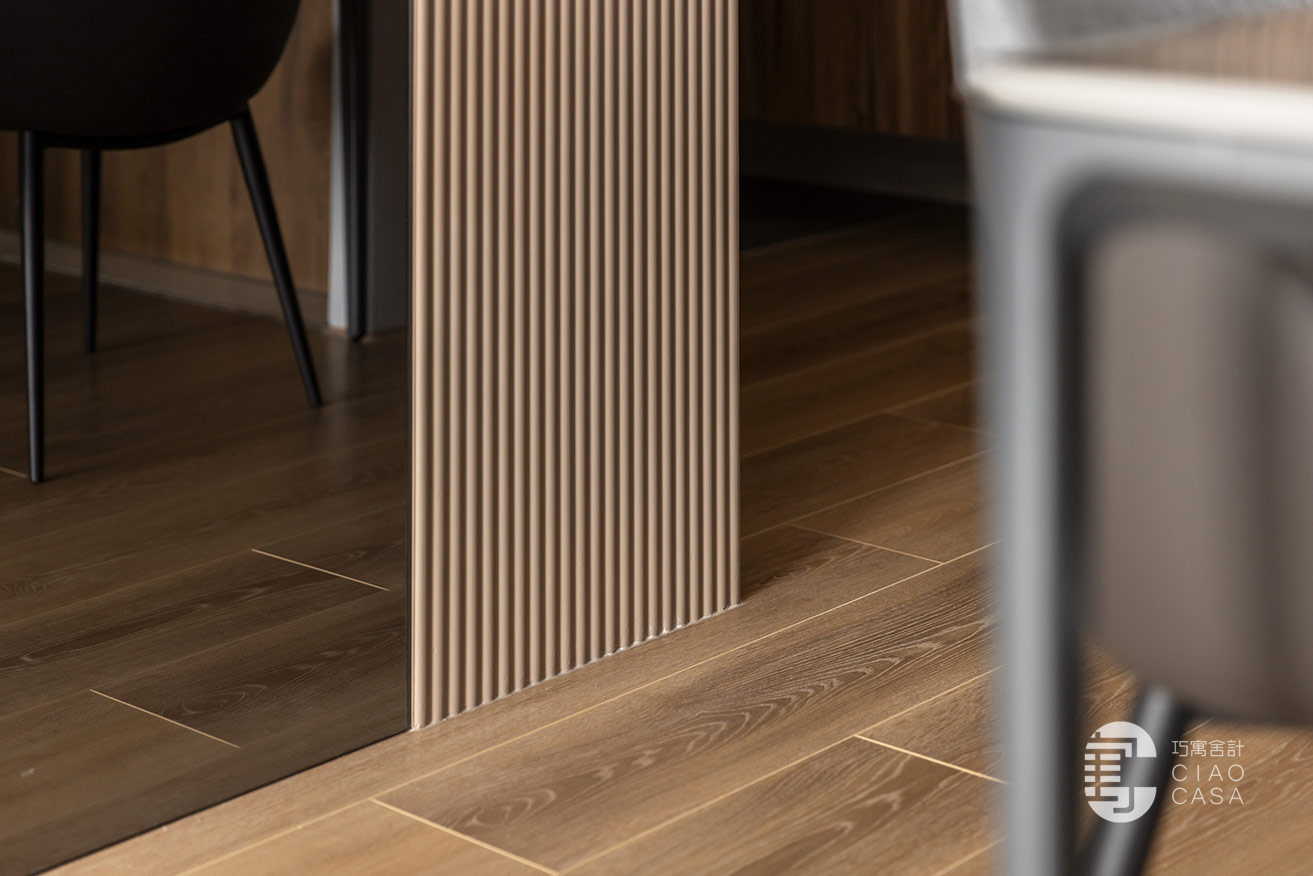 幽闇低婉的光影,在長廊式的玄關裡嬈嬈綽綽,映照著思緒的流動,循序漸進的行經過程,皆是深具儀式性的心境鋪陳。黑底白紋的大板地磚,表面動態感的流紋,使義式輕奢的氣韵在優雅的氛圍中收放自如,同時與溫潤的木地板立下清晰的內外分野。