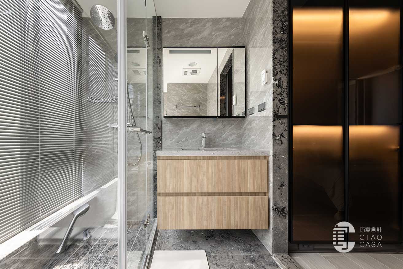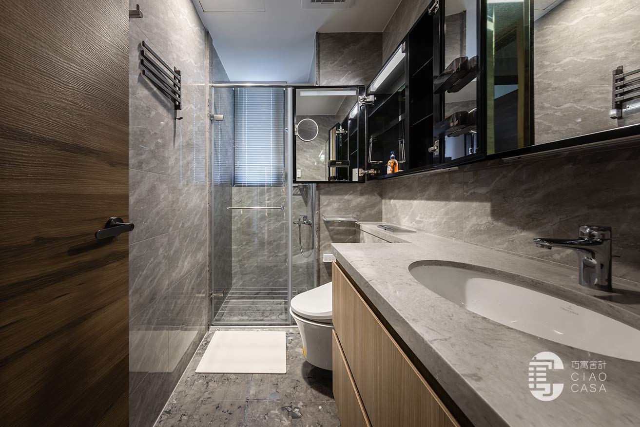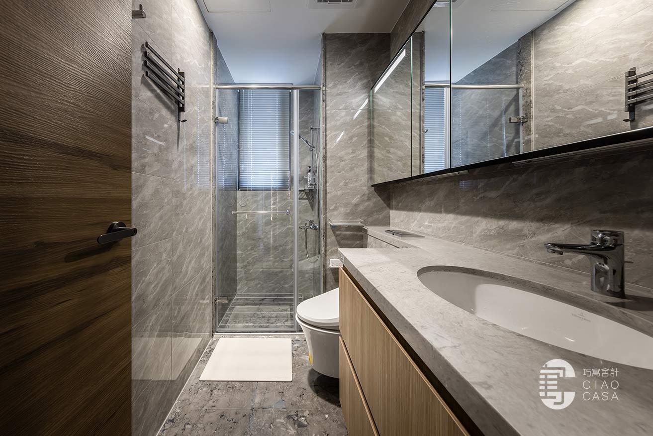 依托於飯店式的衛浴規格、簡潔高雅的質感,主臥衛浴和客浴於是根據屋主日常的實際需求,運用寬窄不同的鏡櫃,讓收納的便捷與視覺的美感細緻入微、同步昇華。