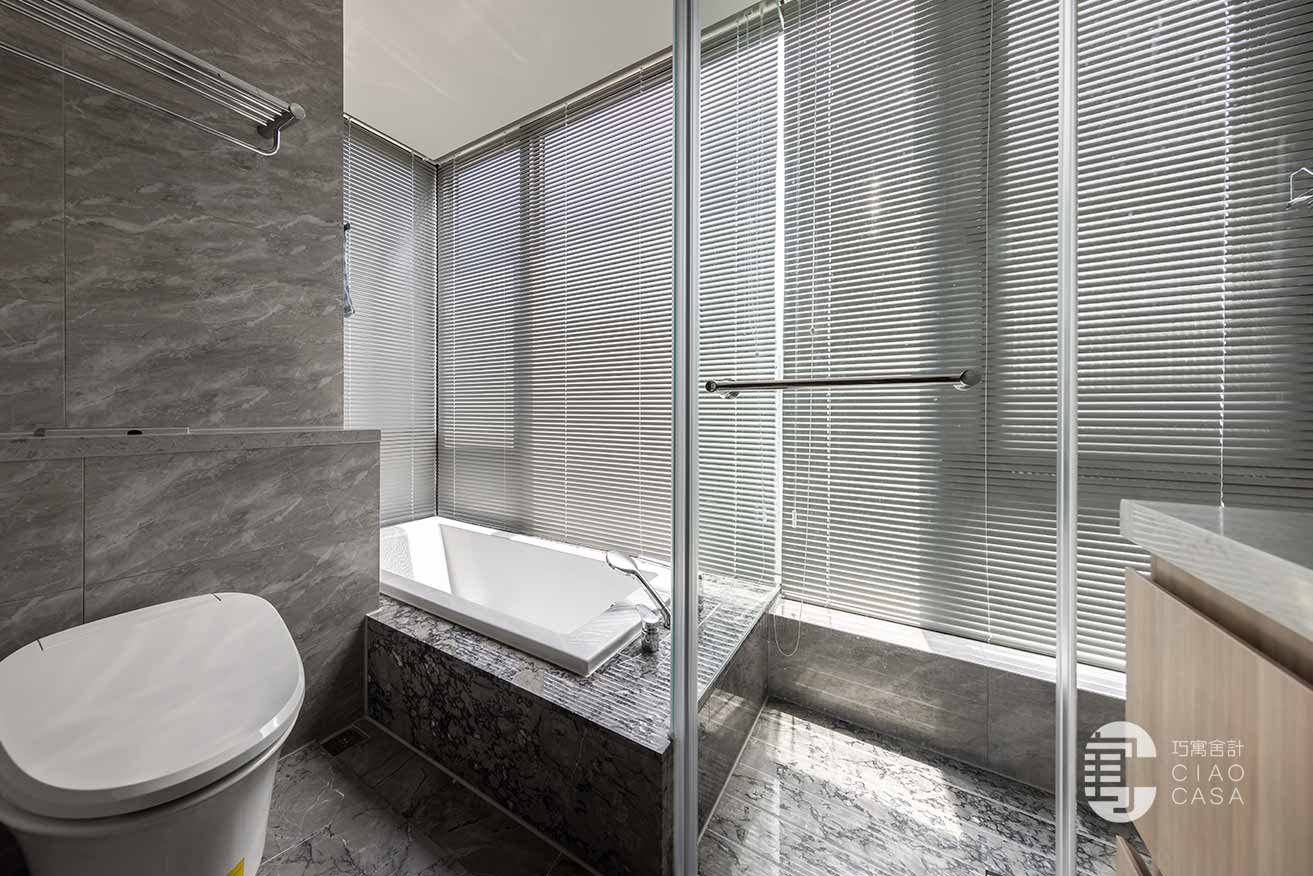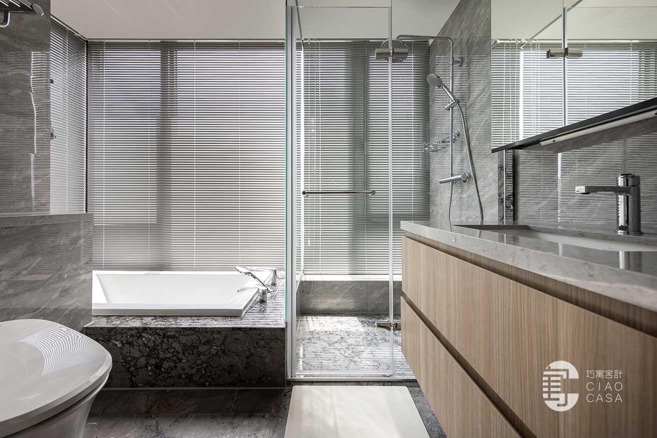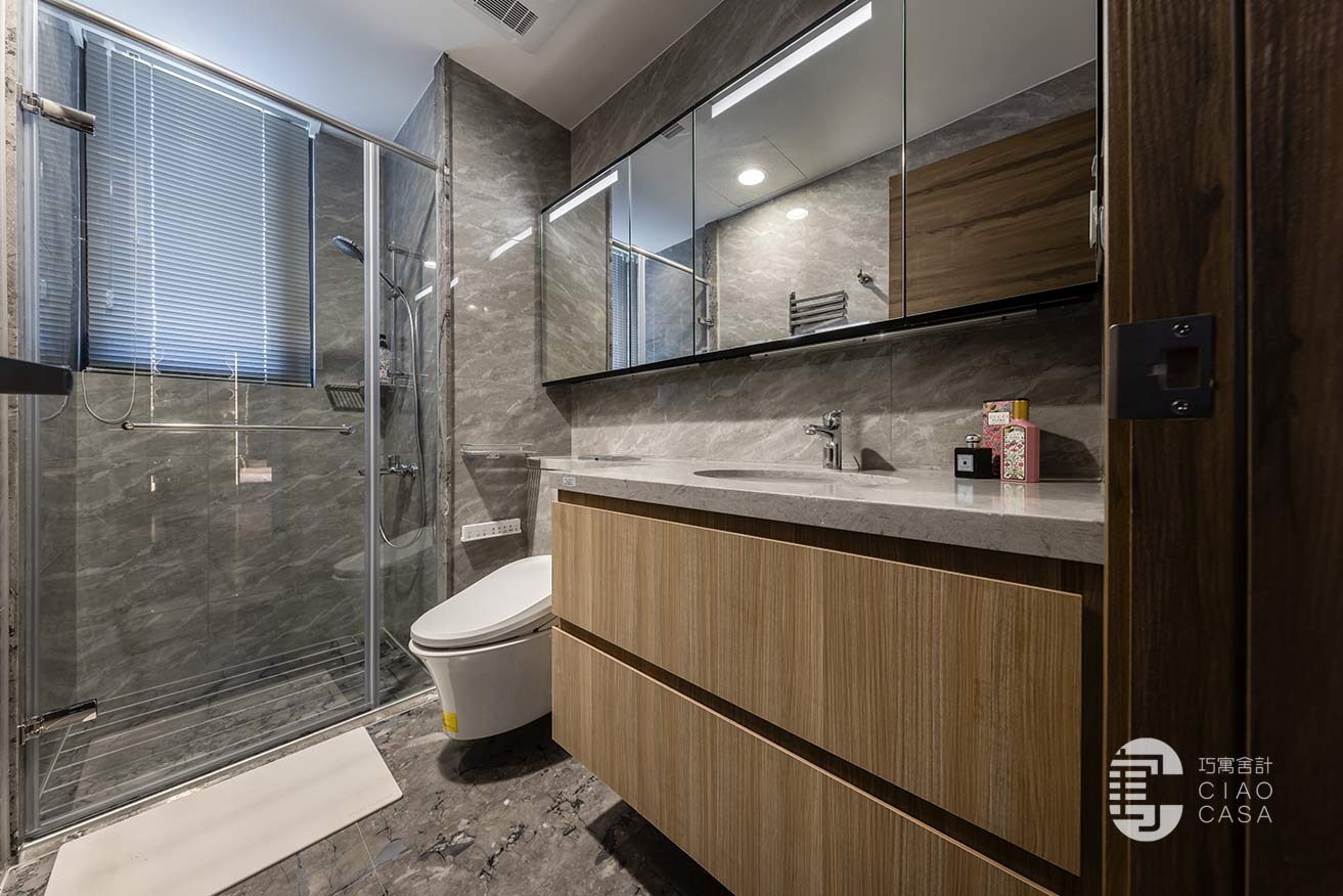 依托於飯店式的衛浴規格、簡潔高雅的質感,主臥衛浴和客浴於是根據屋主日常的實際需求,運用寬窄不同的鏡櫃,讓收納的便捷與視覺的美感細緻入微、同步昇華。