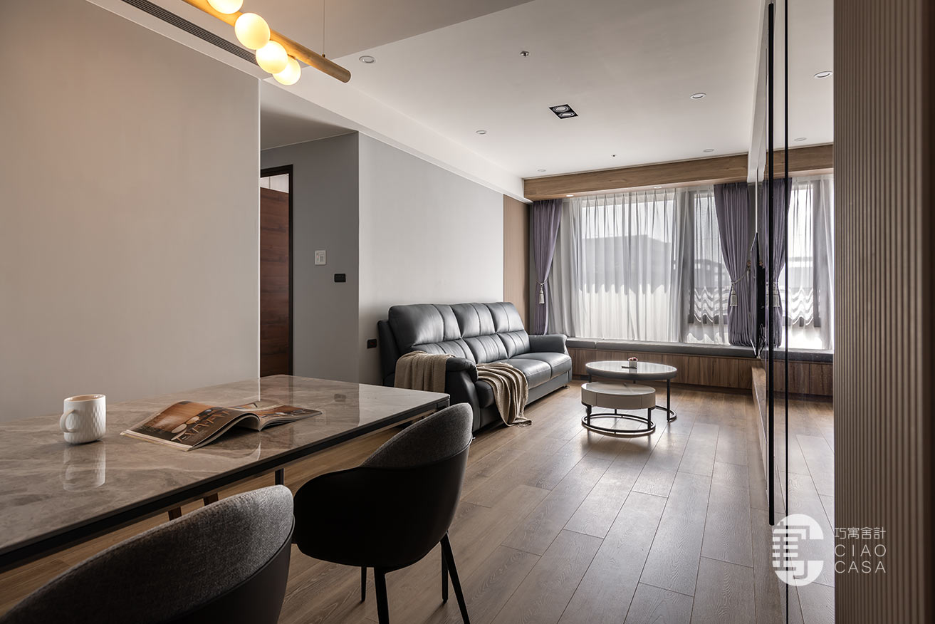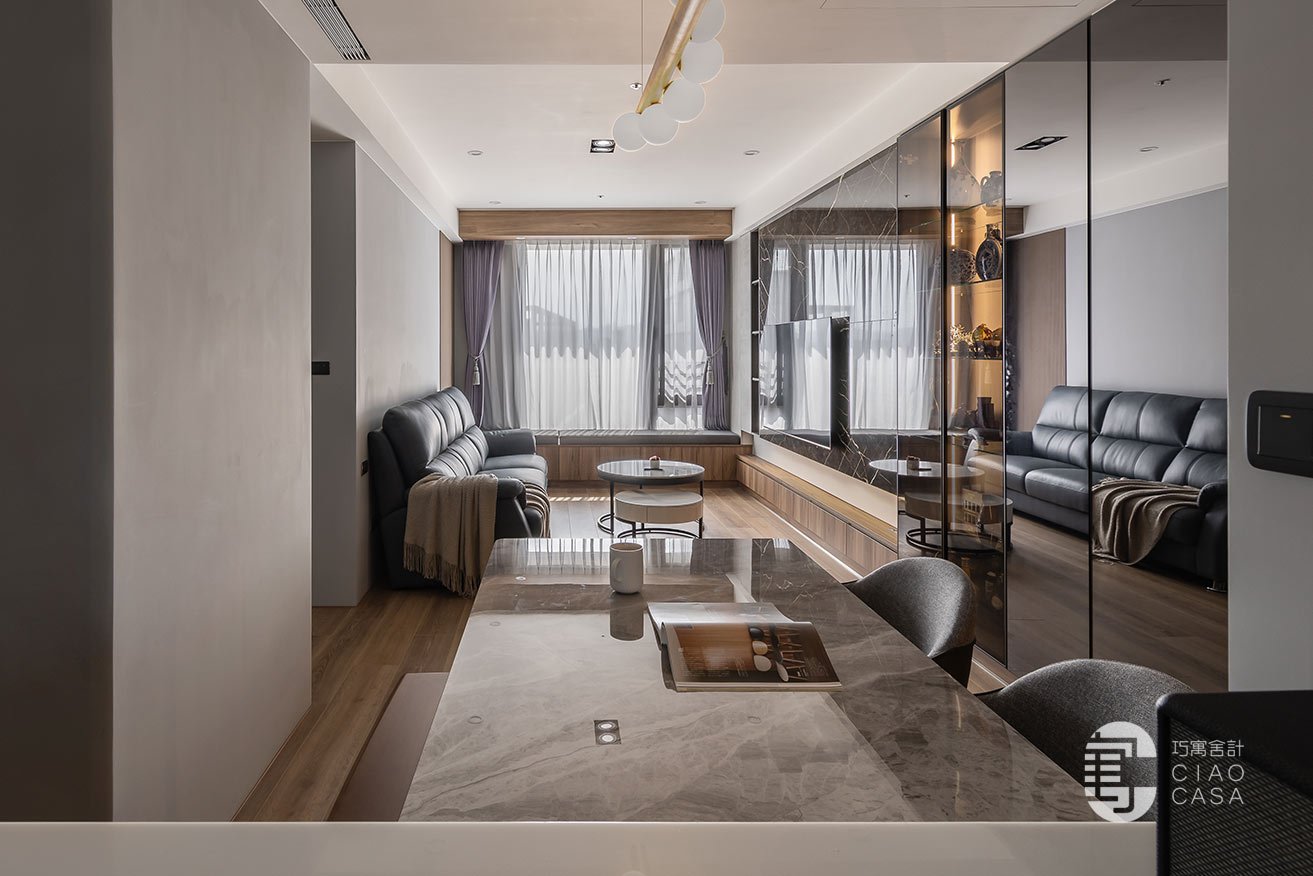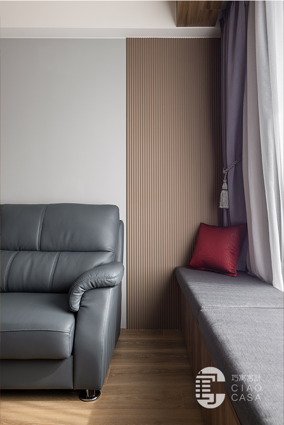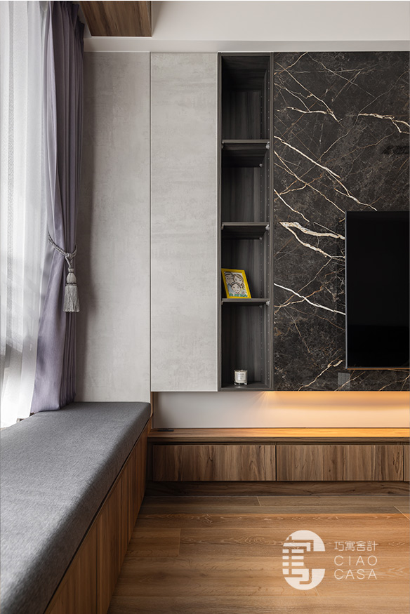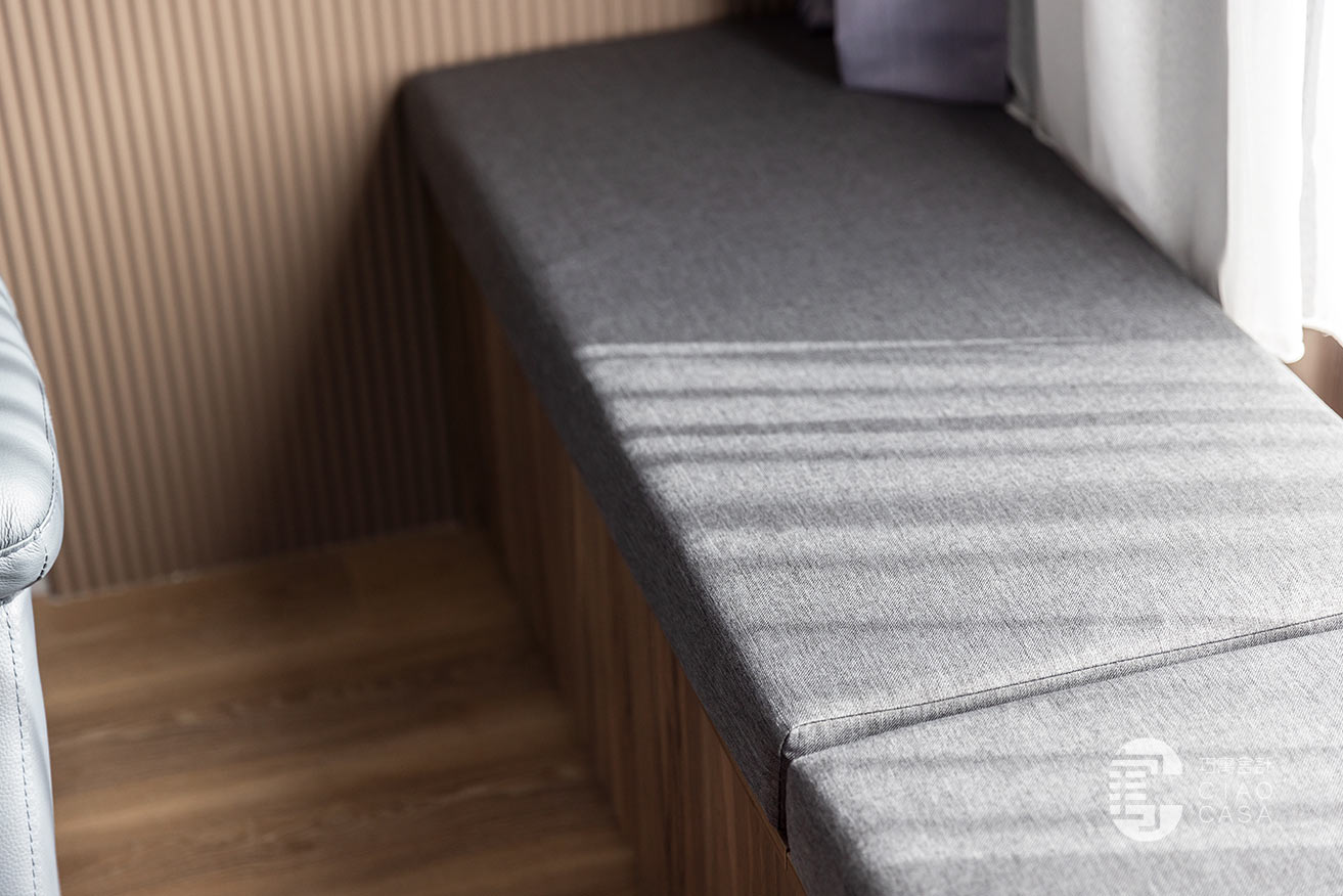 承接電視主牆的轉折,拓展出一整排的窗邊臥榻,與柔和的日光、恣意搖擺的樹影、若隱若現的城市輪廓,共織一幅迷人的綺麗光景,這方這自在無壓的角落,既能當作正式的會客廳,亦能化為品茗、閱讀的休憩之地,給予空間多維的自由,完美詮釋當代「精緻生活」的態度。