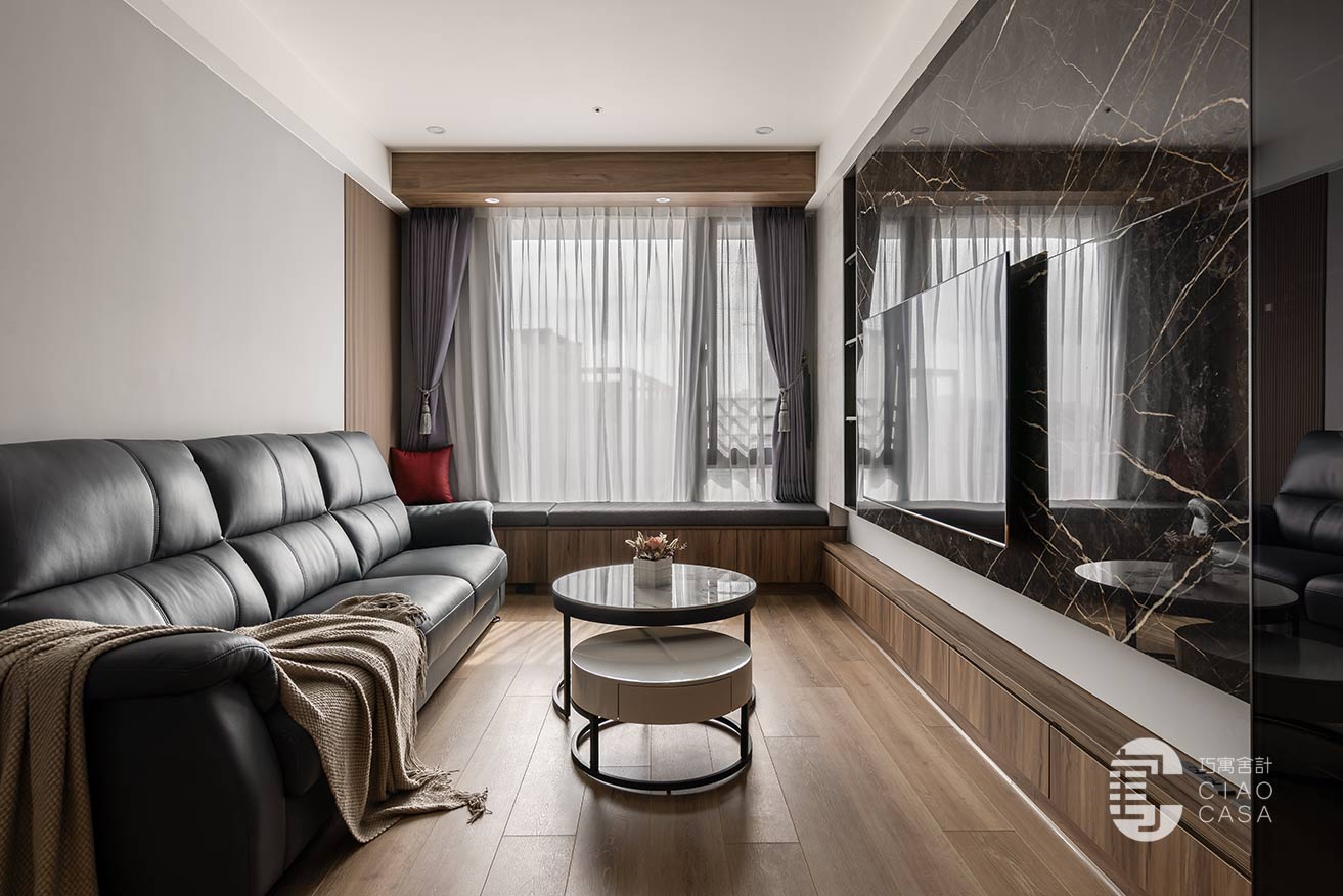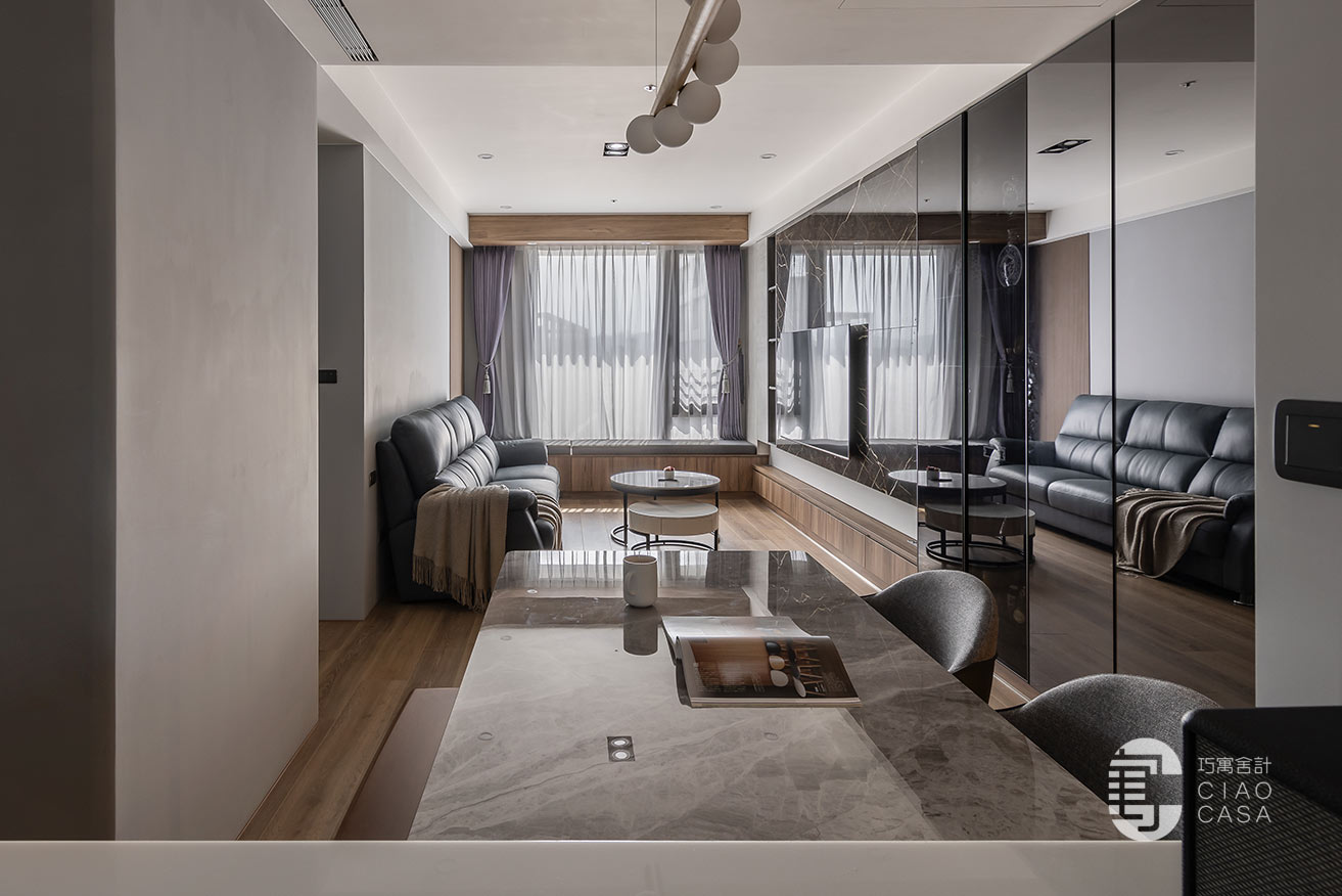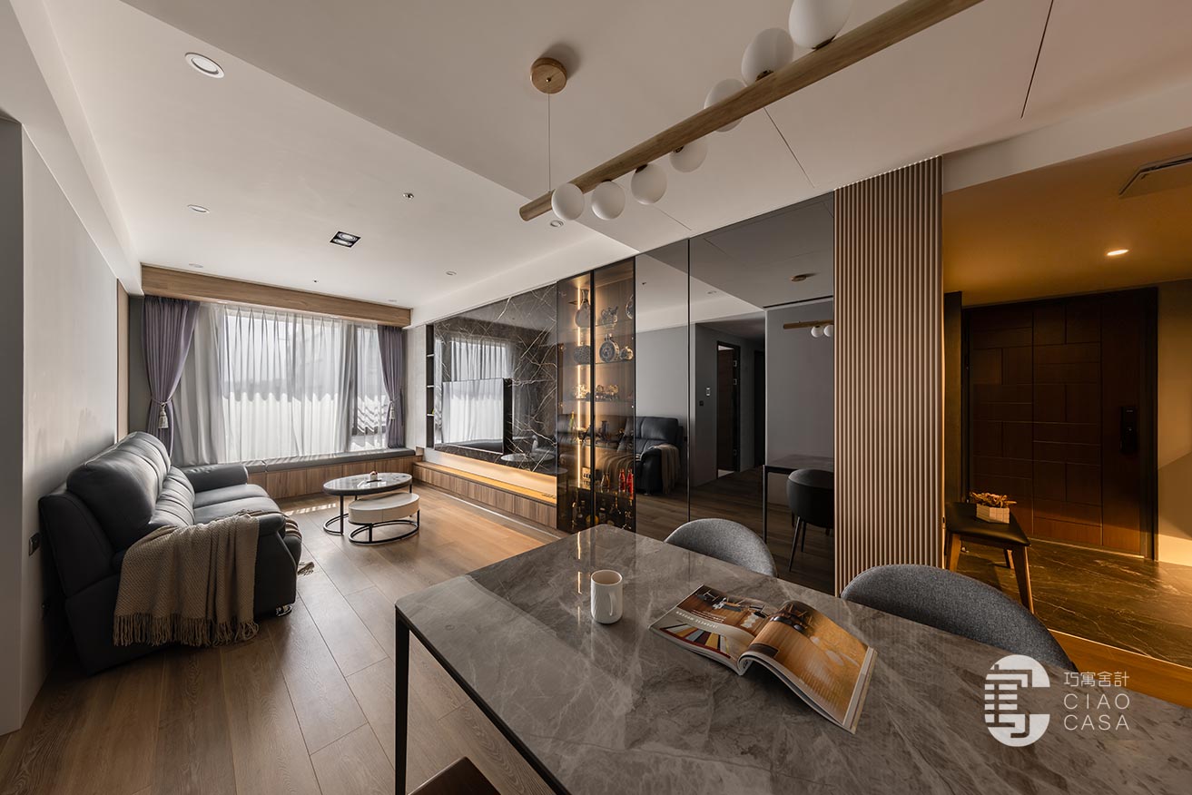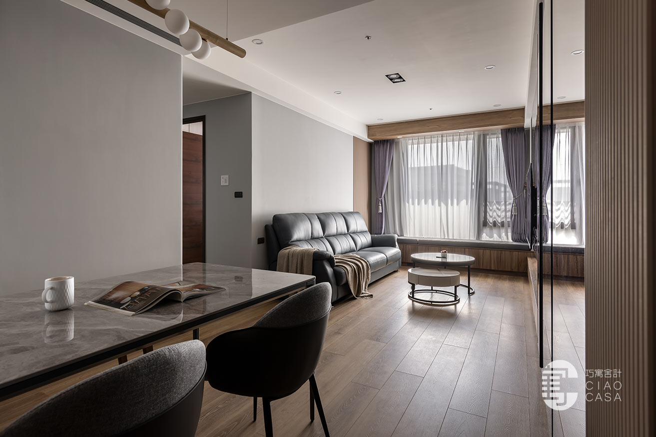 承接電視主牆的轉折,拓展出一整排的窗邊臥榻,與柔和的日光、恣意搖擺的樹影、若隱若現的城市輪廓,共織一幅迷人的綺麗光景,這方這自在無壓的角落,既能當作正式的會客廳,亦能化為品茗、閱讀的休憩之地,給予空間多維的自由,完美詮釋當代「精緻生活」的態度。