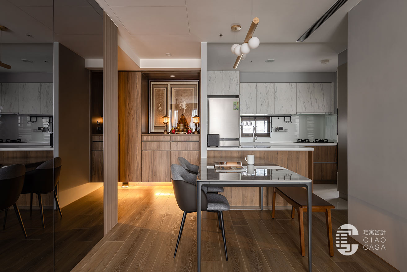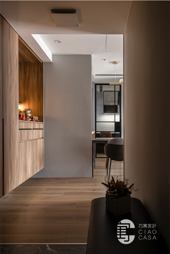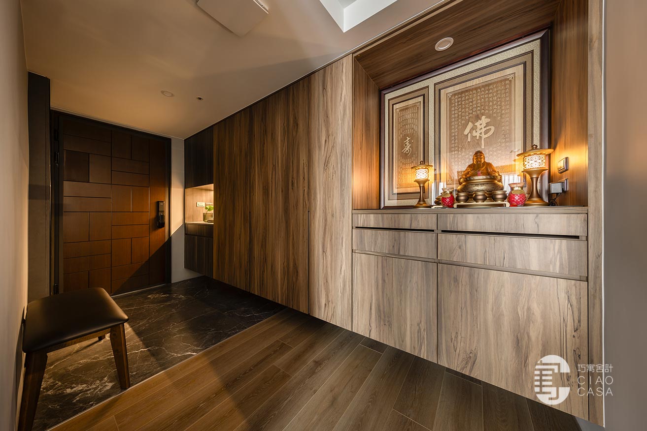 汲取木質獨有的溫度與紋脈,設計師將玄關鞋櫃、汙衣櫃、儲物櫃及神龕串織於一片木色之中,並順勢封起神龕背牆的對外窗。空間從堪輿美學的角度出發,利用簡潔一致的語言、暈黃沉穩的燈影,巧妙弱化形體的存在,實現了審美上的深度融合。
