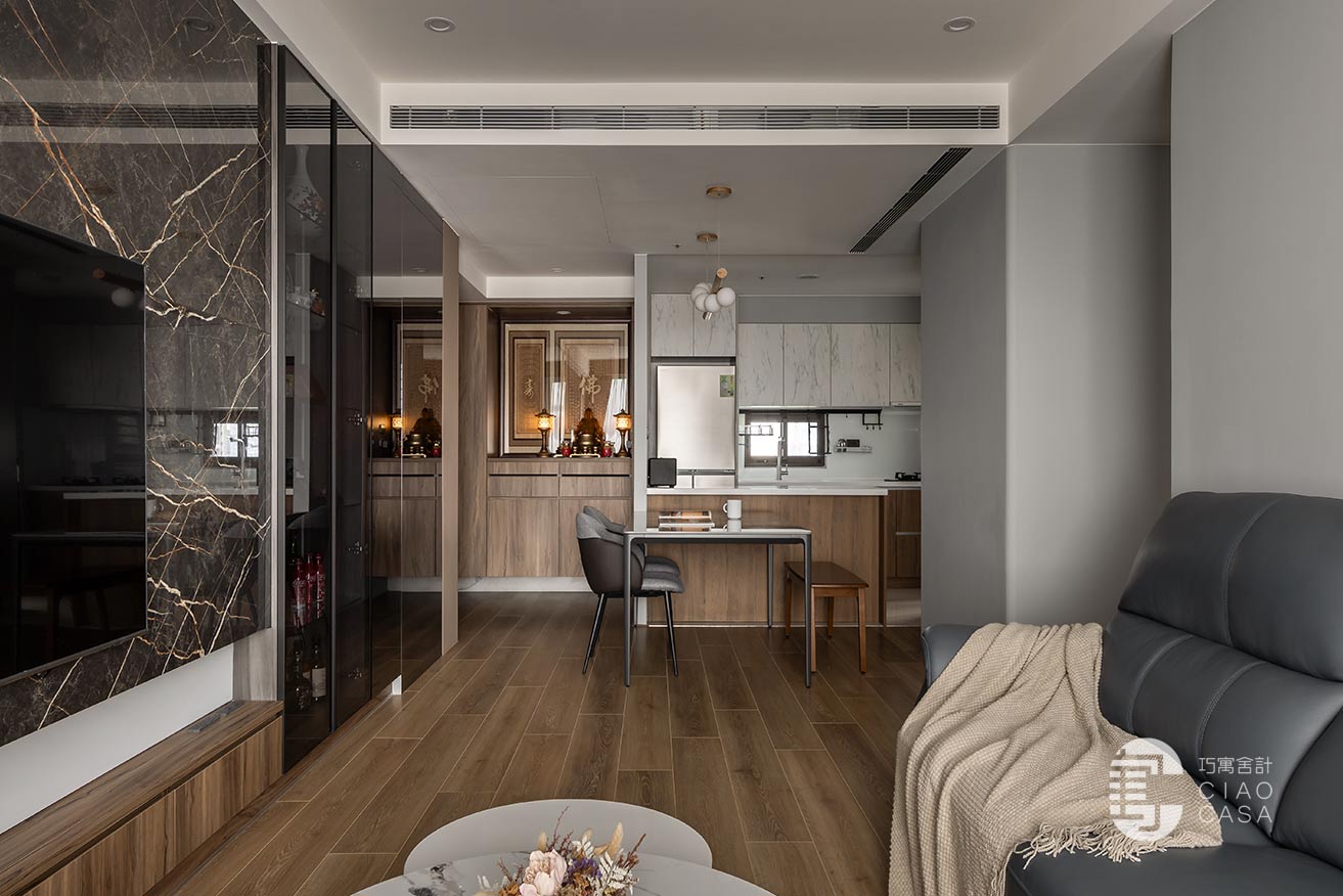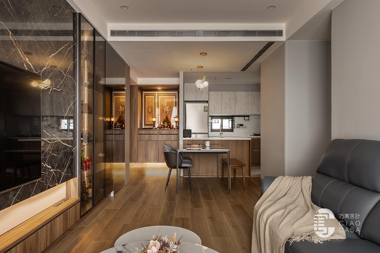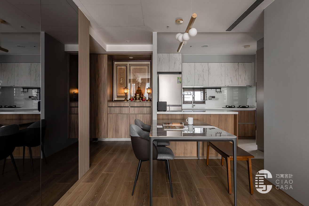 汲取木質獨有的溫度與紋脈,設計師將玄關鞋櫃、汙衣櫃、儲物櫃及神龕串織於一片木色之中,並順勢封起神龕背牆的對外窗。空間從堪輿美學的角度出發,利用簡潔一致的語言、暈黃沉穩的燈影,巧妙弱化形體的存在,實現了審美上的深度融合。