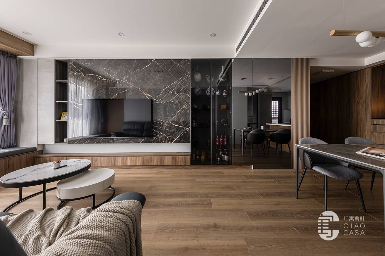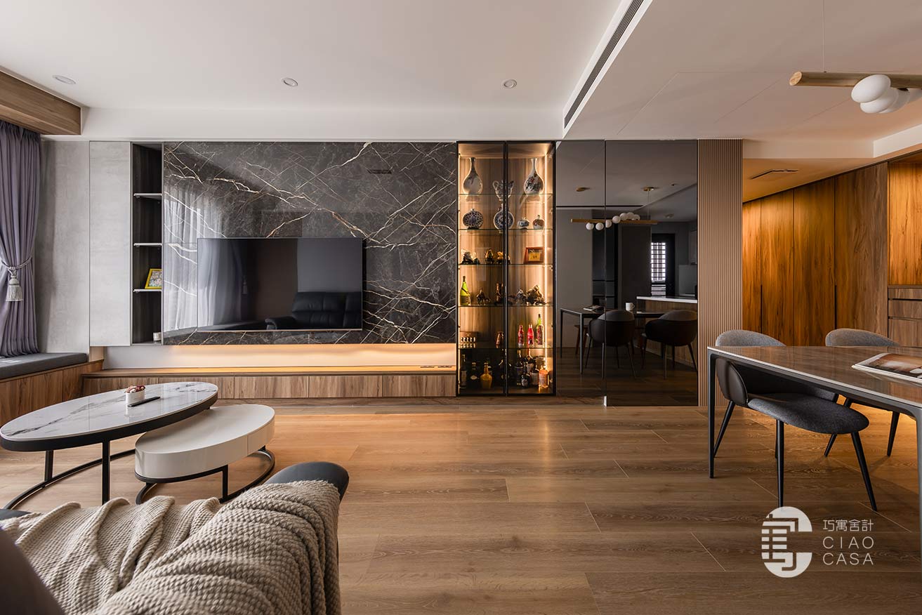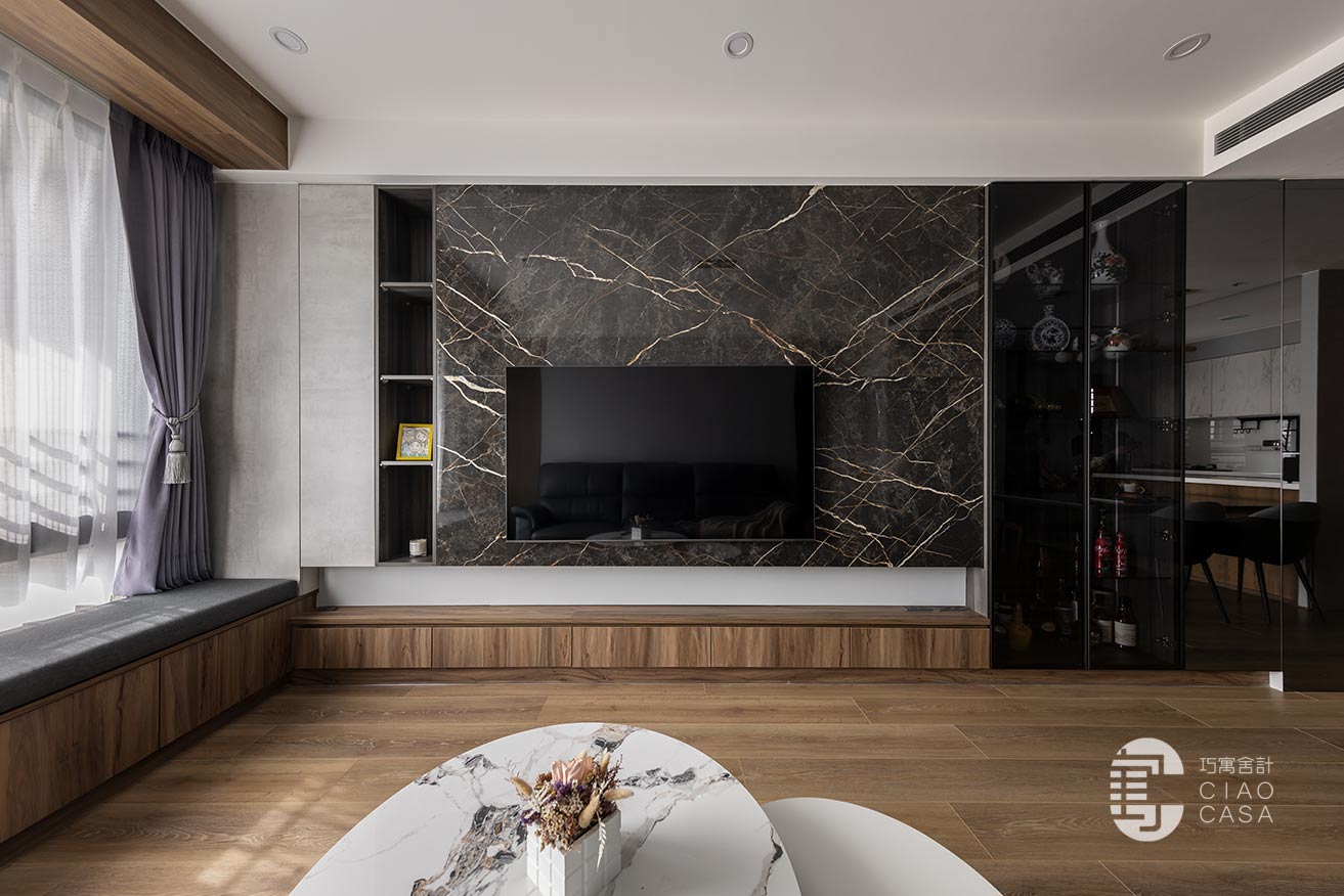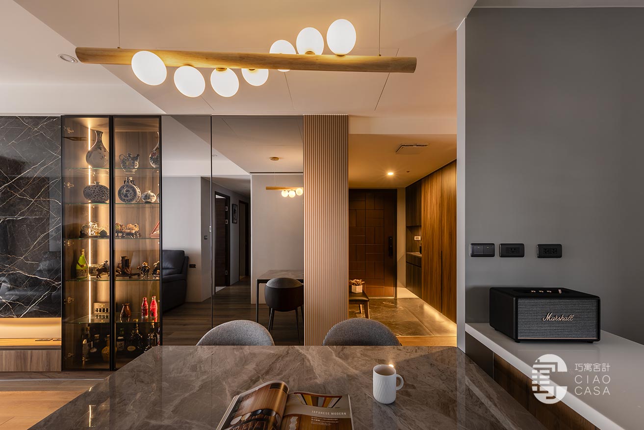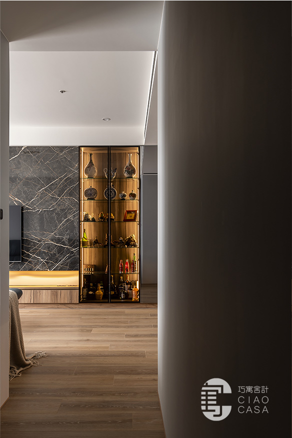 由多種材質拼接而成的電視主牆,沿著橫軸攤展,體現出開闊大氣的視覺感受,再加上個性石紋、木格柵、玻璃、清水模質感的遞嬗,成功在簡約的線性構圖中澆注奢華的韻味。陳列著精瓷和酒藏的玻璃櫃,採用深色木紋底襯,以及經精確角度計算的側光,藉此襯托出藝品的姿態和高級感,使屋主獨到的美學感知,又朝藝術境界開拓了另一種維度。