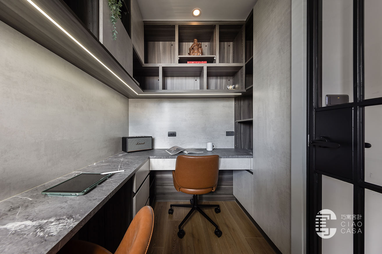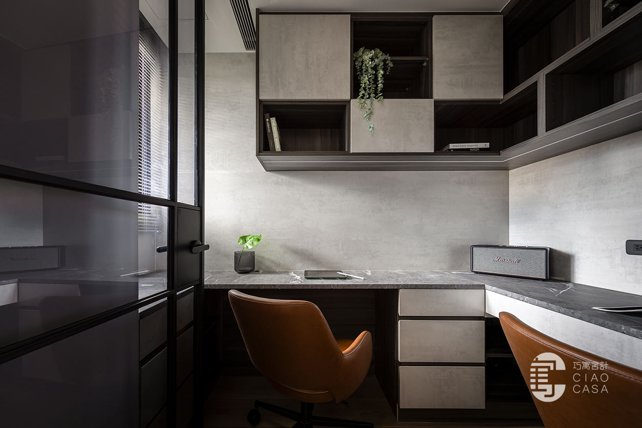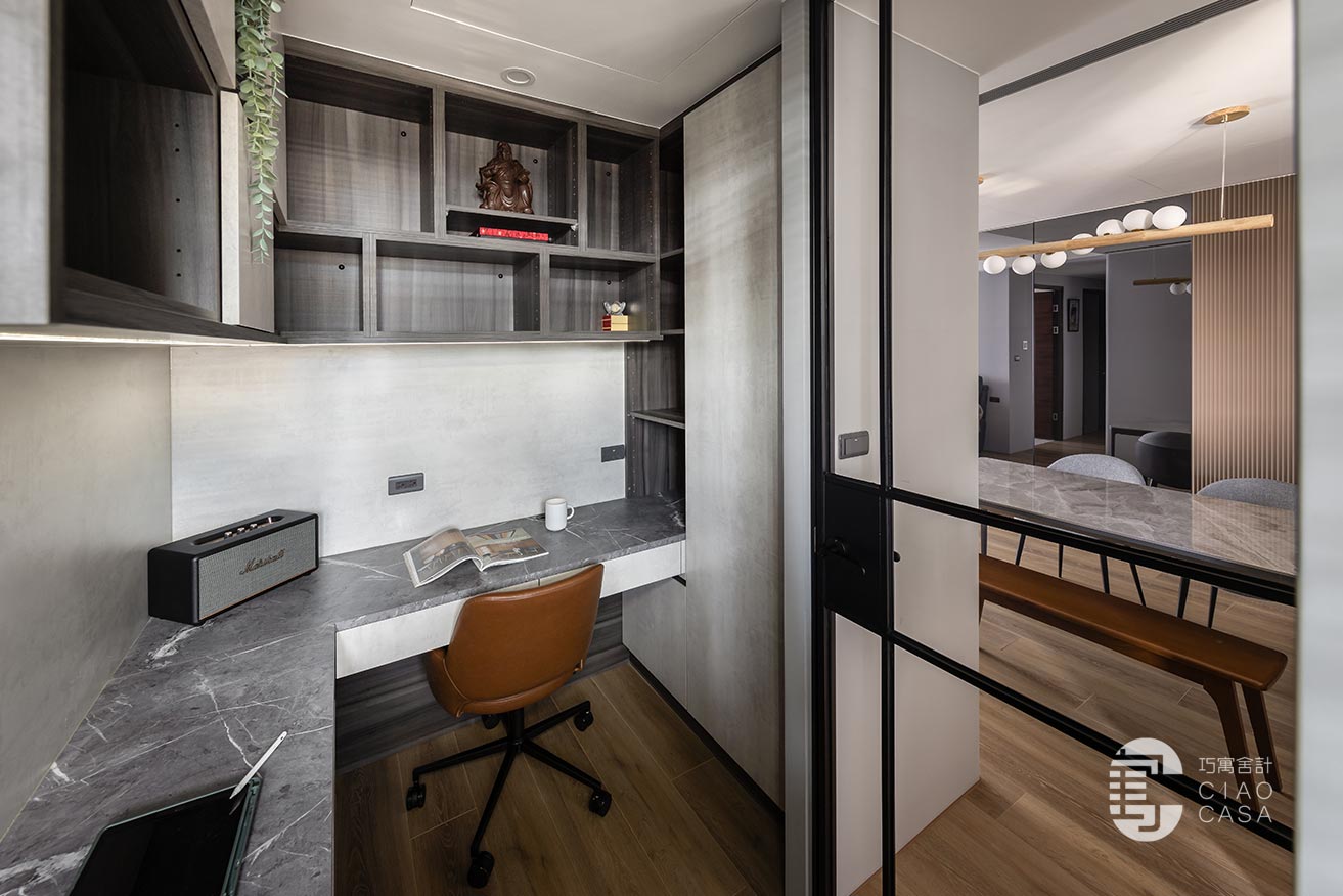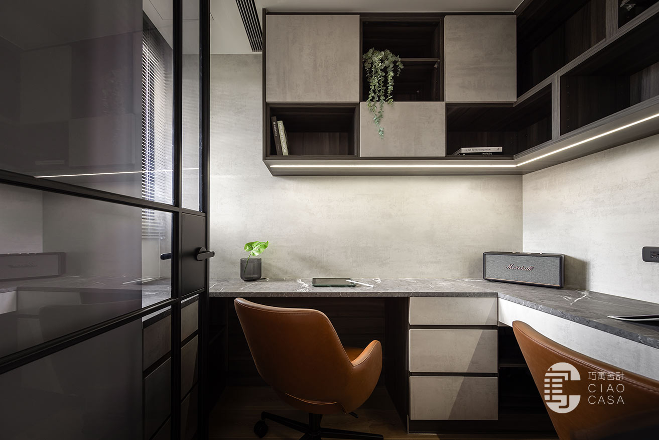 內部利用黑色、灰色、木色建構出富含文化性的空間底色,輔以能有效吸收和隔離噪音的隔音材料,使書房沉澱下來歸於靜篤,不受外界干擾。沿牆而設的L型書桌滿足了夫妻倆各自的機能需求,邊角一隅縱向延伸的格櫃,連袂吊櫃錯落穿插著門片,消弭了純收納的單調感,輾轉編織出充滿幾何意趣的圖景。