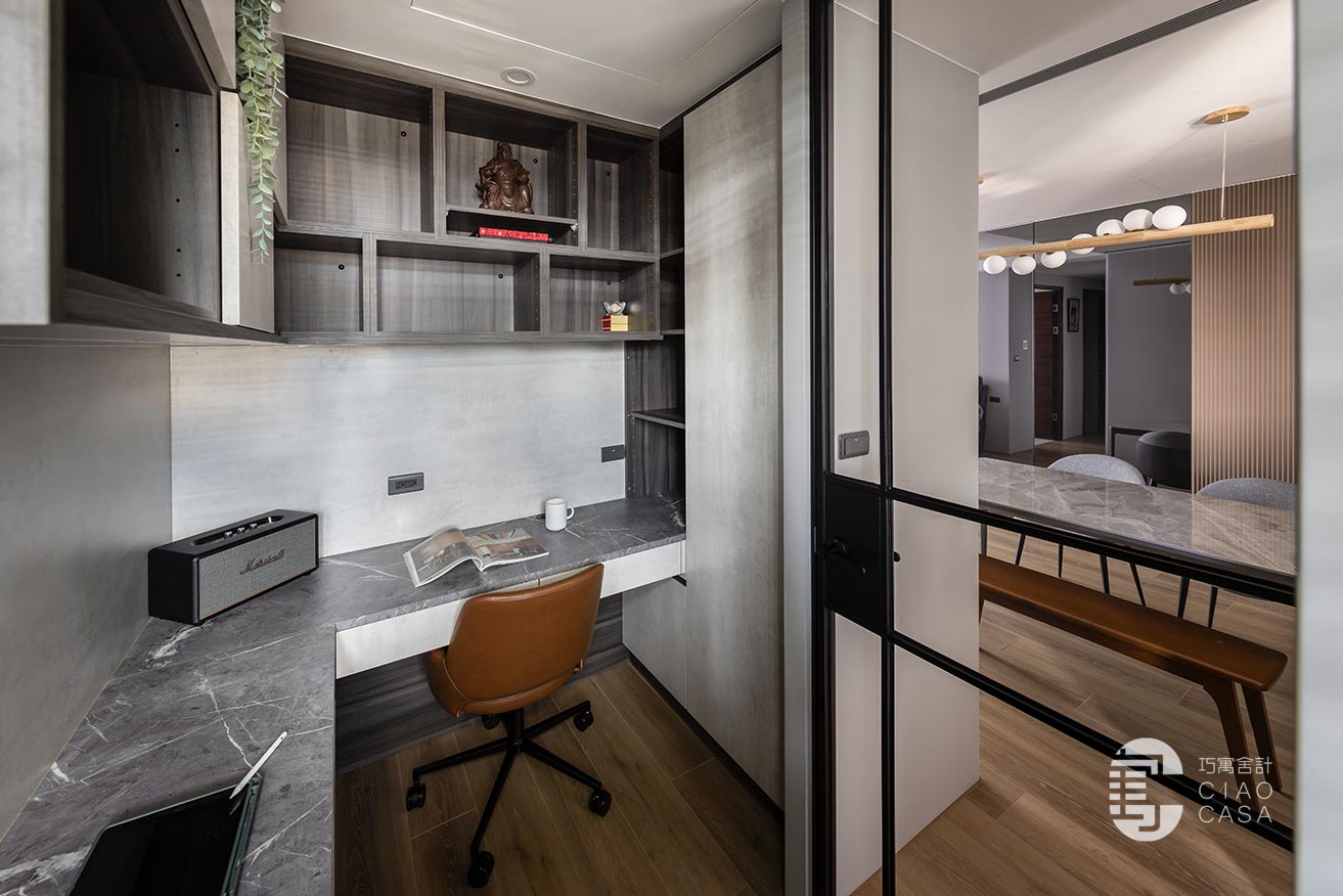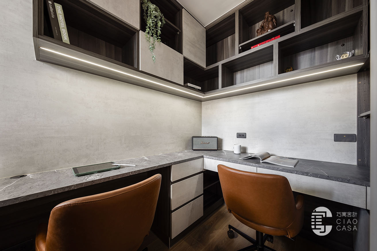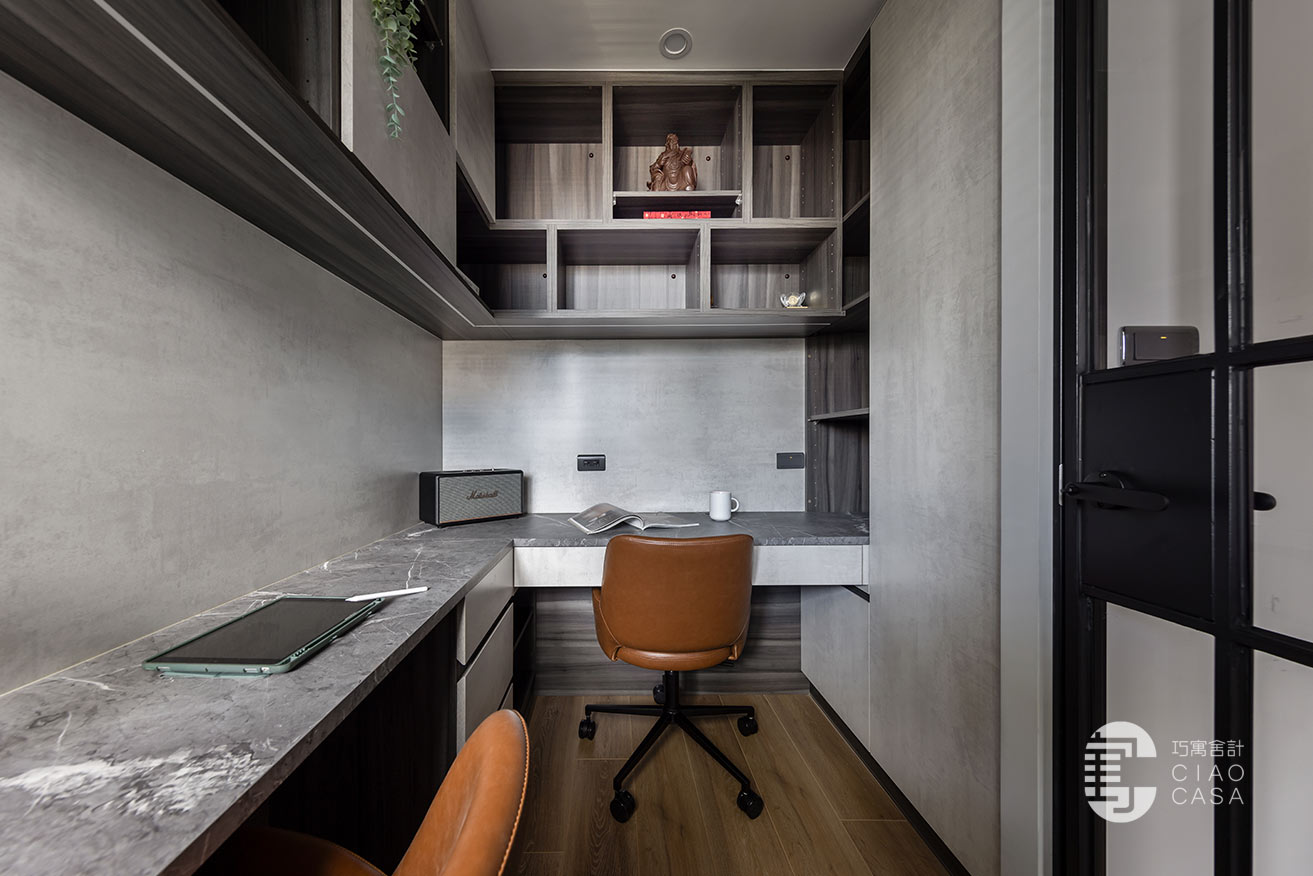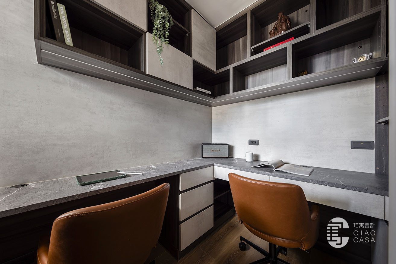 內部利用黑色、灰色、木色建構出富含文化性的空間底色,輔以能有效吸收和隔離噪音的隔音材料,使書房沉澱下來歸於靜篤,不受外界干擾。沿牆而設的L型書桌滿足了夫妻倆各自的機能需求,邊角一隅縱向延伸的格櫃,連袂吊櫃錯落穿插著門片,消弭了純收納的單調感,輾轉編織出充滿幾何意趣的圖景。