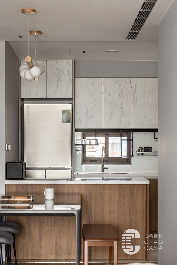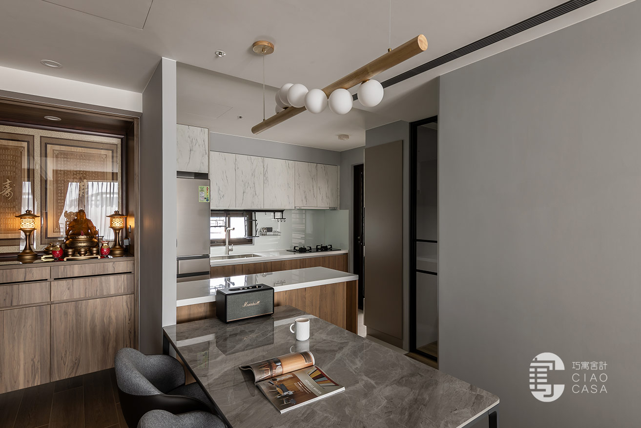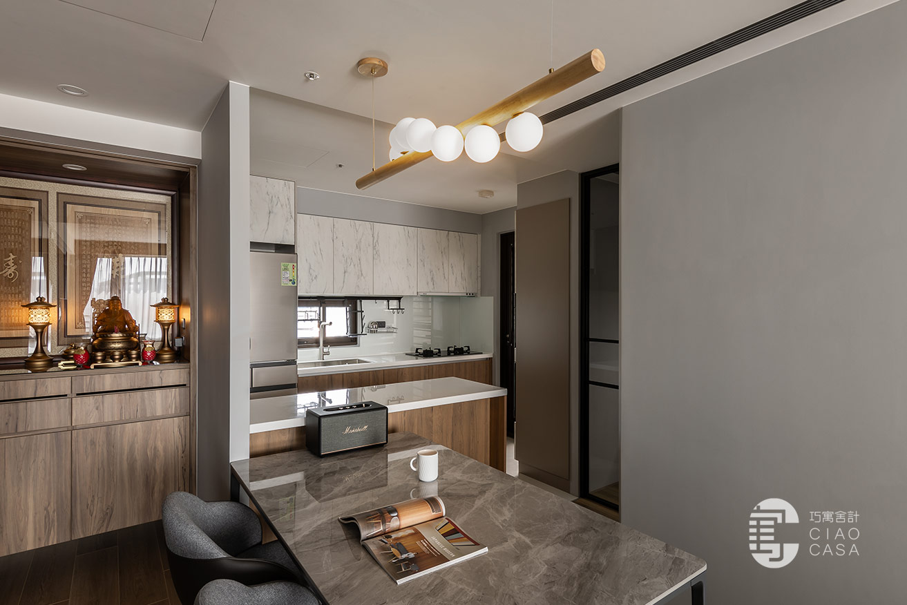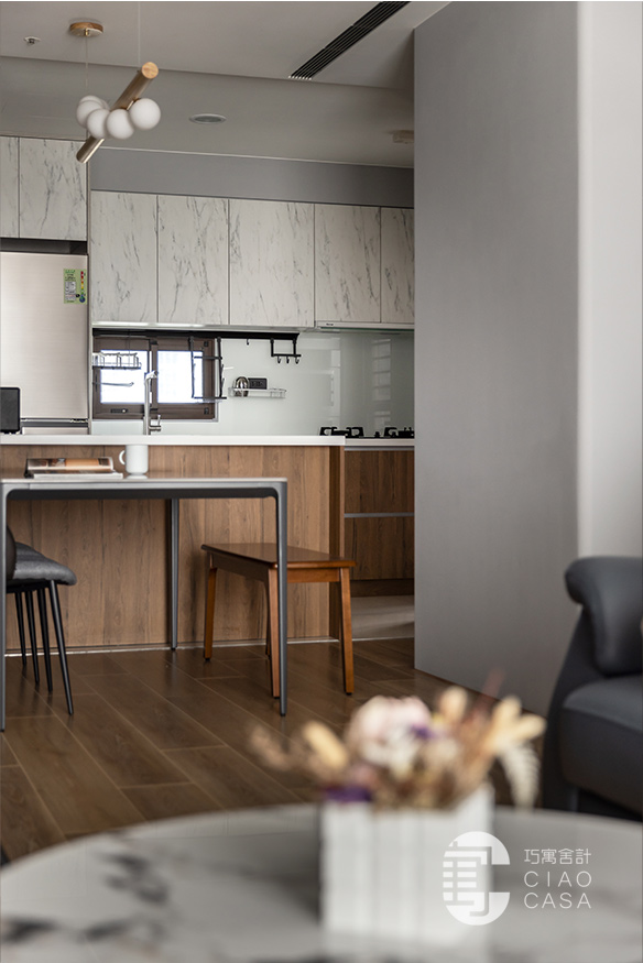 開放式餐廚區保留原有的既定形式,重新更換櫃門,並導入石紋、木質元素,以優雅精美的的嶄新面貌,將一家人溫馨的餐敘時光、動人的生活細節,不著痕跡地彌散其間。此外,餐桌一側特別改為長凳座椅,為通往書房的行走動線騰出餘裕。