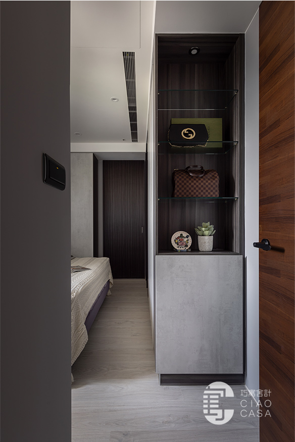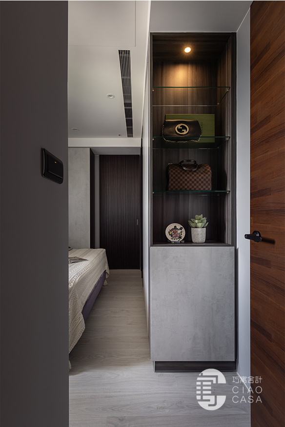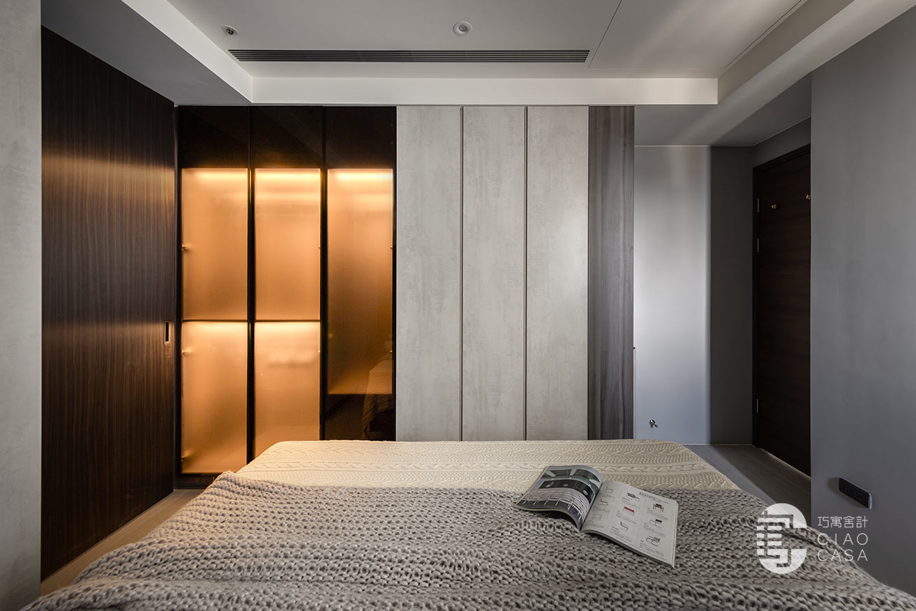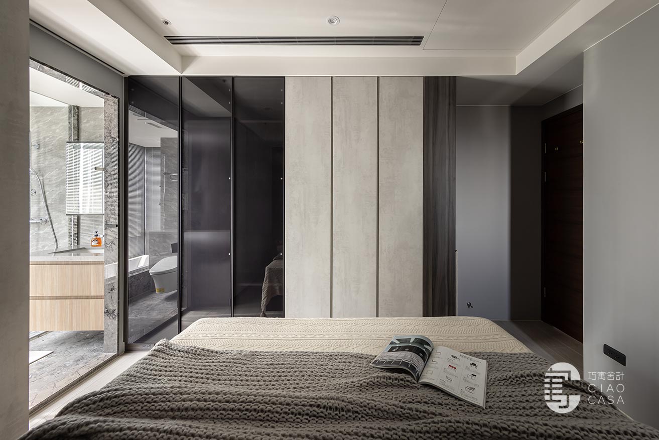 而床尾收納機能伴隨著材質的鋪敘,為空間平添獨特的節奏感和美學張力。尾段刻意選用磨砂玻璃替代清玻,維持乾淨俐落的畫面,避免睡眠時視覺及思緒的紊亂。