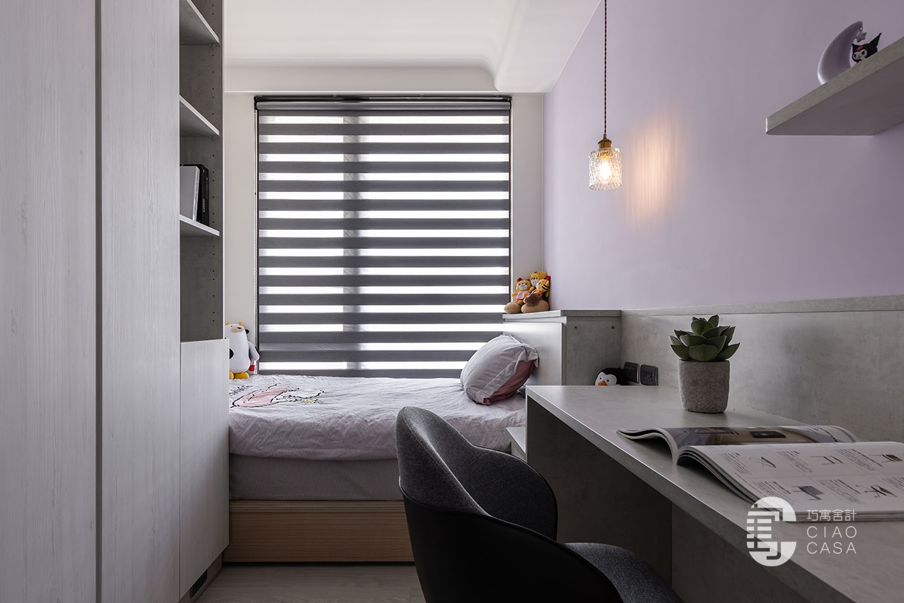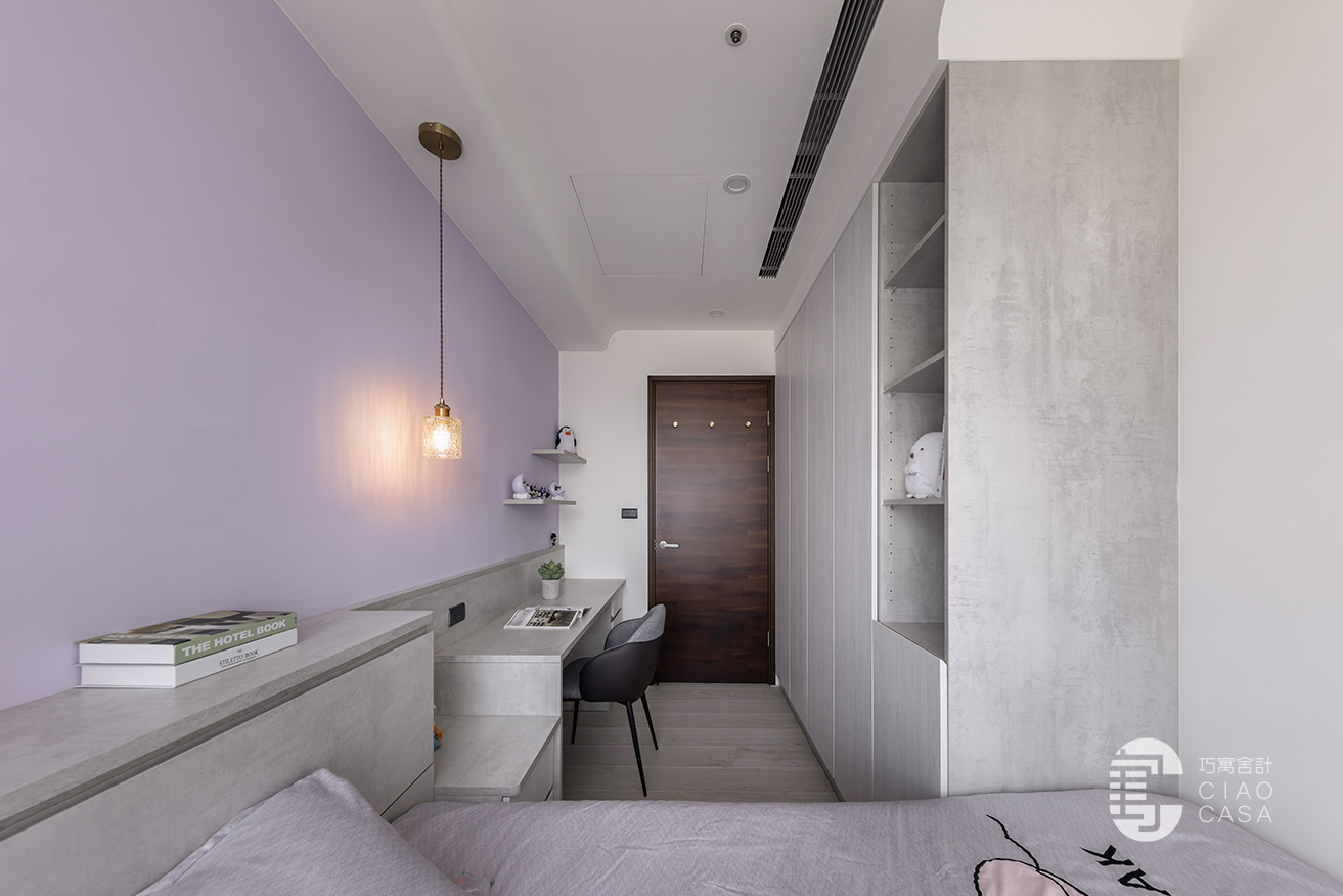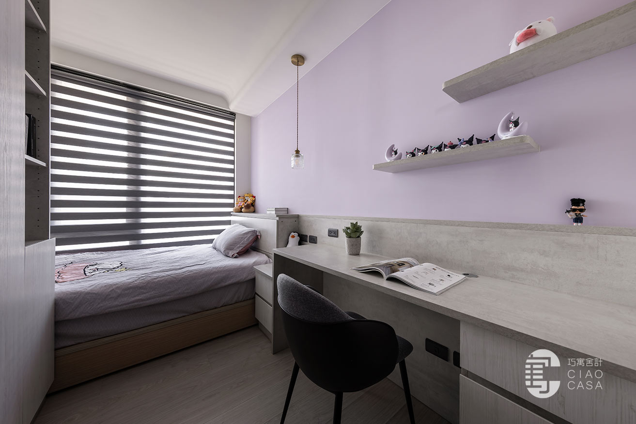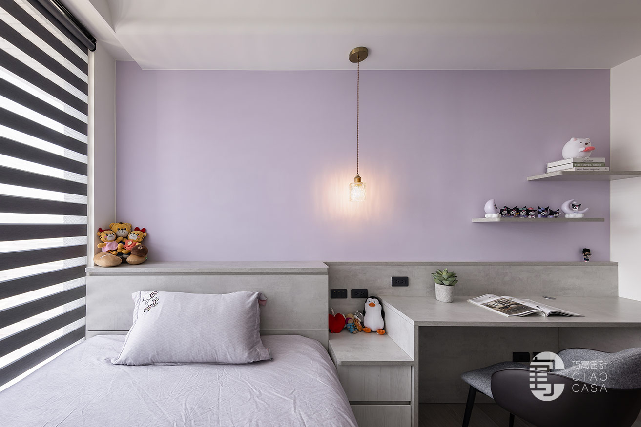 夢幻甜美的粉色系,是荳蔻少女對個人世界浪漫的想像,女孩房特別選用清冷的紫藤色,與沉靜柔和的灰色底蘊,兩兩交織,渲染出淡雅溫甜,又不乏知性氣質的感受。呈長形的空間,以幾何式的組合,將書桌、床頭櫃、衣櫃整合一氣,並藉由高低起伏的韻律化解壓迫,帶來舒心清寧的睡眠氣氛。