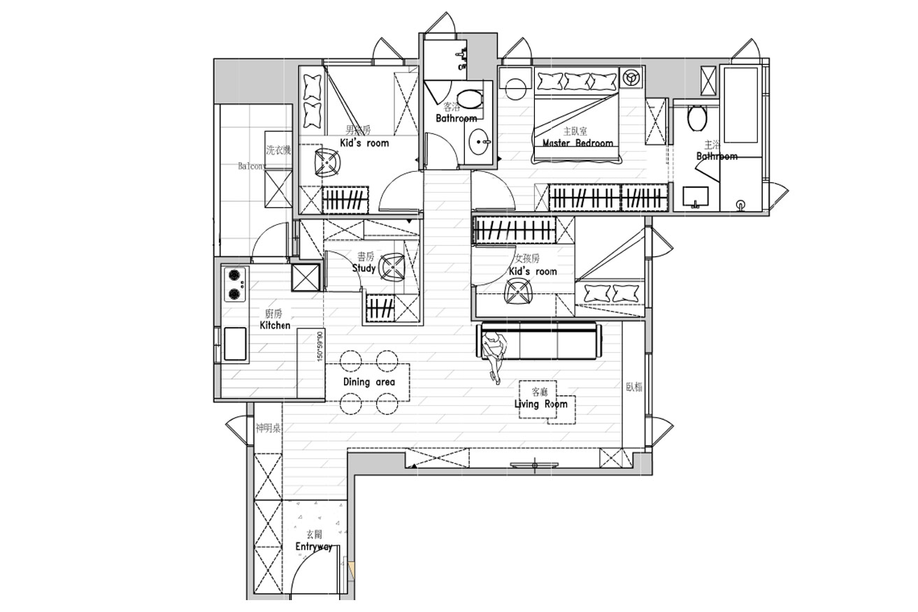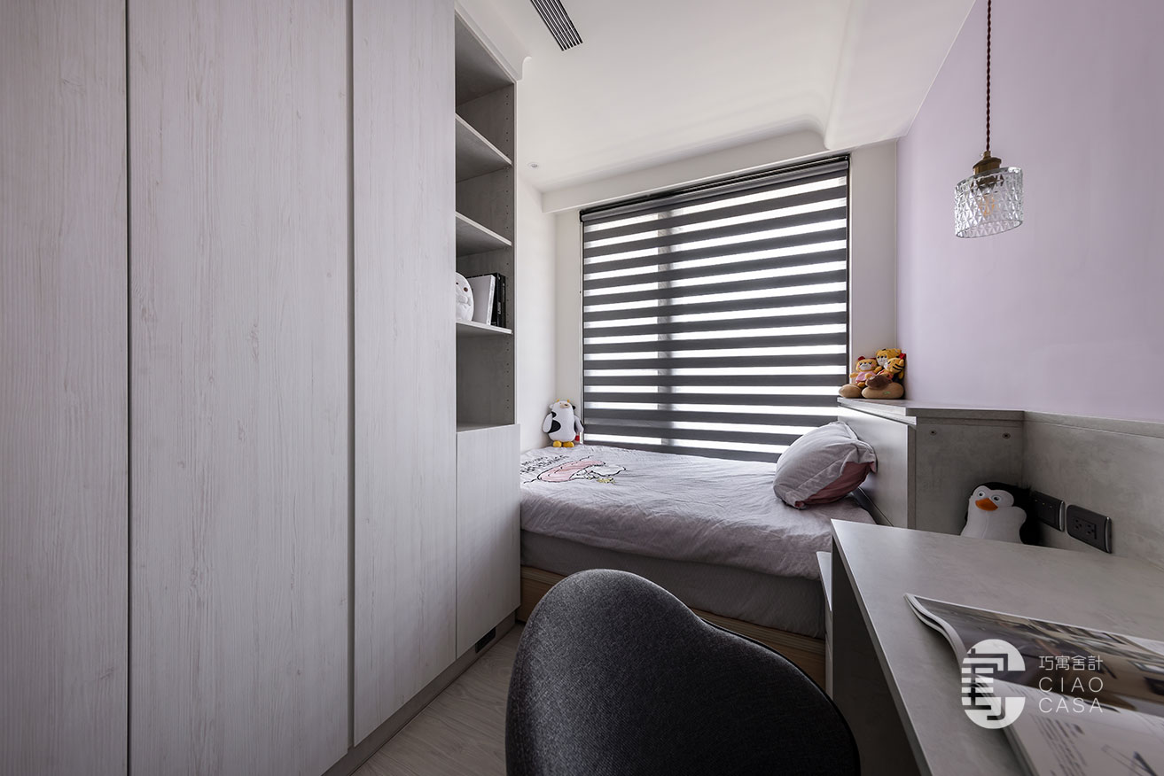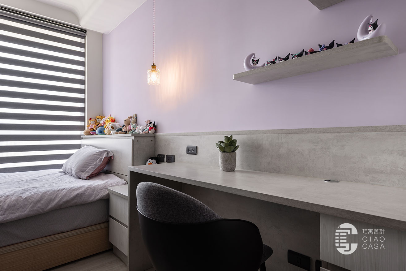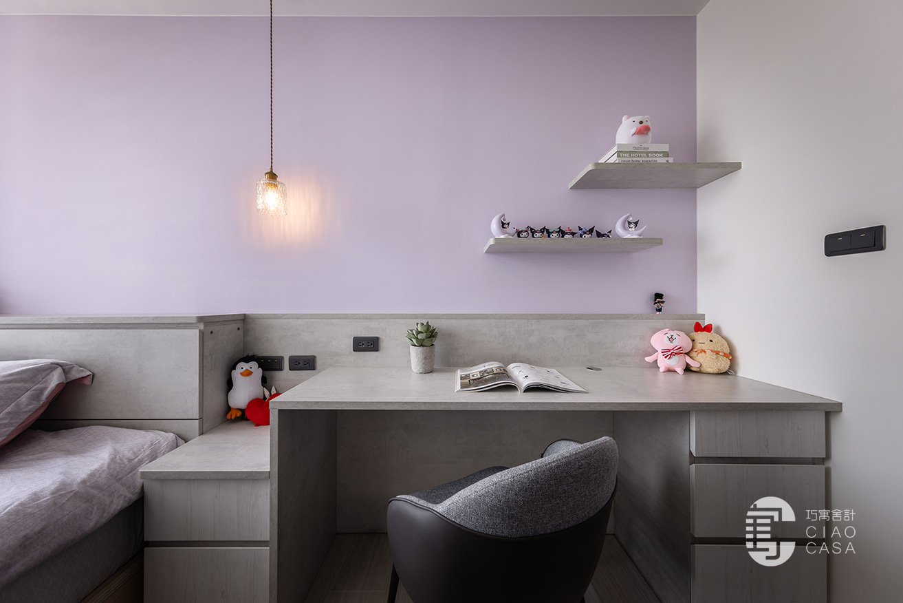 夢幻甜美的粉色系,是荳蔻少女對個人世界浪漫的想像,女孩房特別選用清冷的紫藤色,與沉靜柔和的灰色底蘊,兩兩交織,渲染出淡雅溫甜,又不乏知性氣質的感受。呈長形的空間,以幾何式的組合,將書桌、床頭櫃、衣櫃整合一氣,並藉由高低起伏的韻律化解壓迫,帶來舒心清寧的睡眠氣氛。