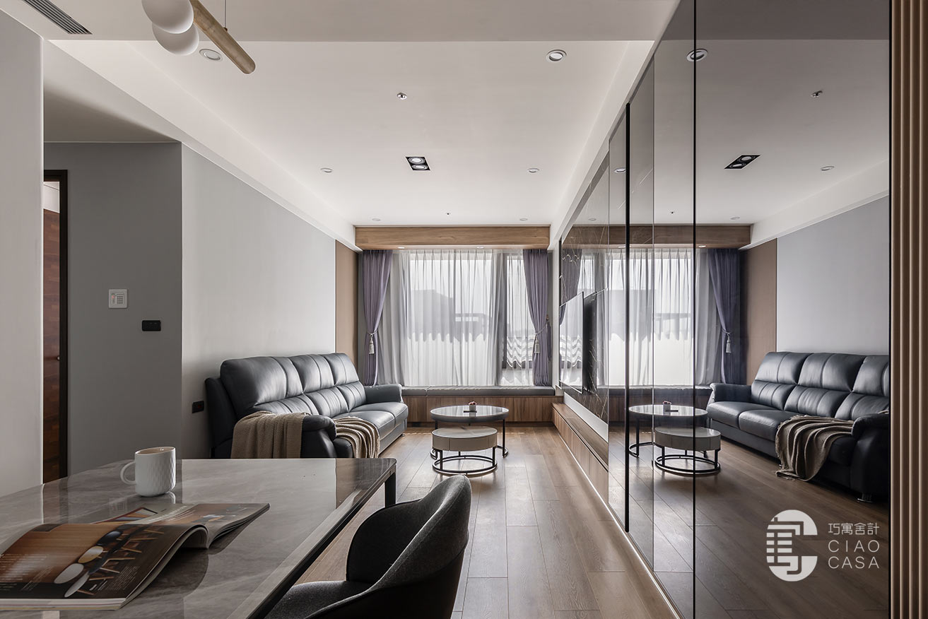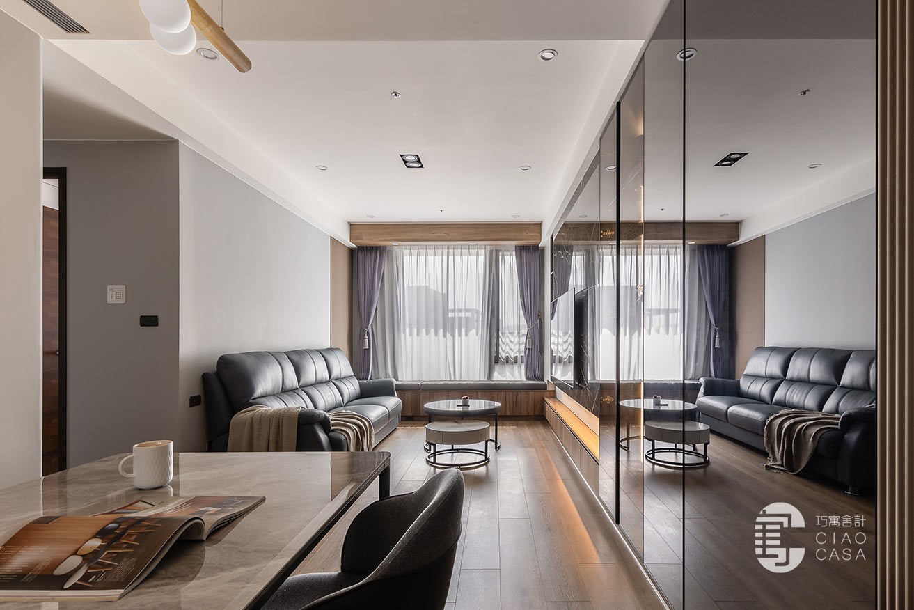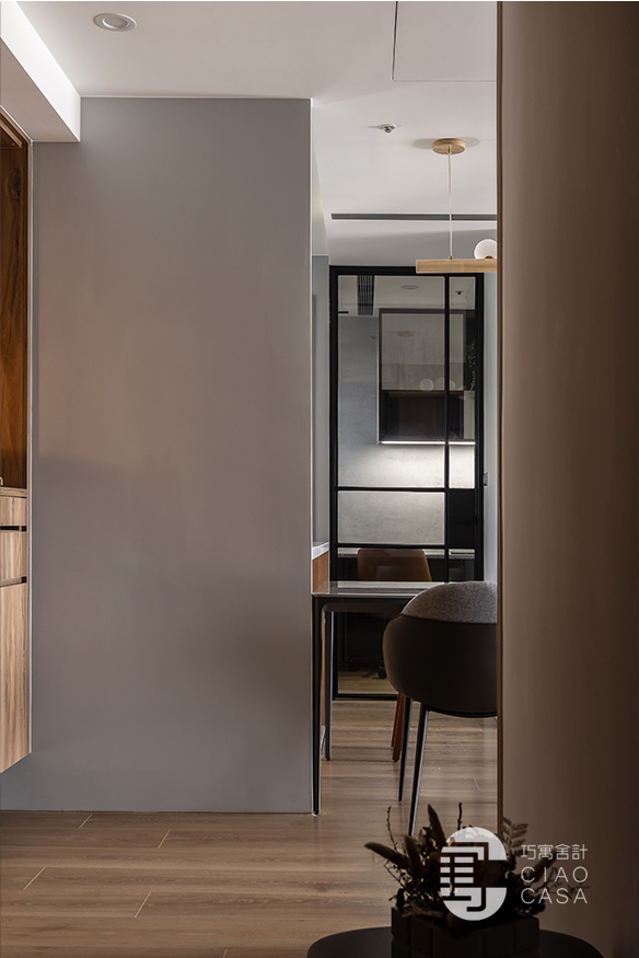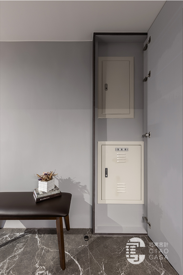 對牆一抹灰韻,如嵐霧般柔軟,亦如岩面般堅毅,挈帶著中性內斂的氣息綿延入室。突兀的電箱藏匿於門片之後,灰鏡的映亮感也豐富了家景的層次。