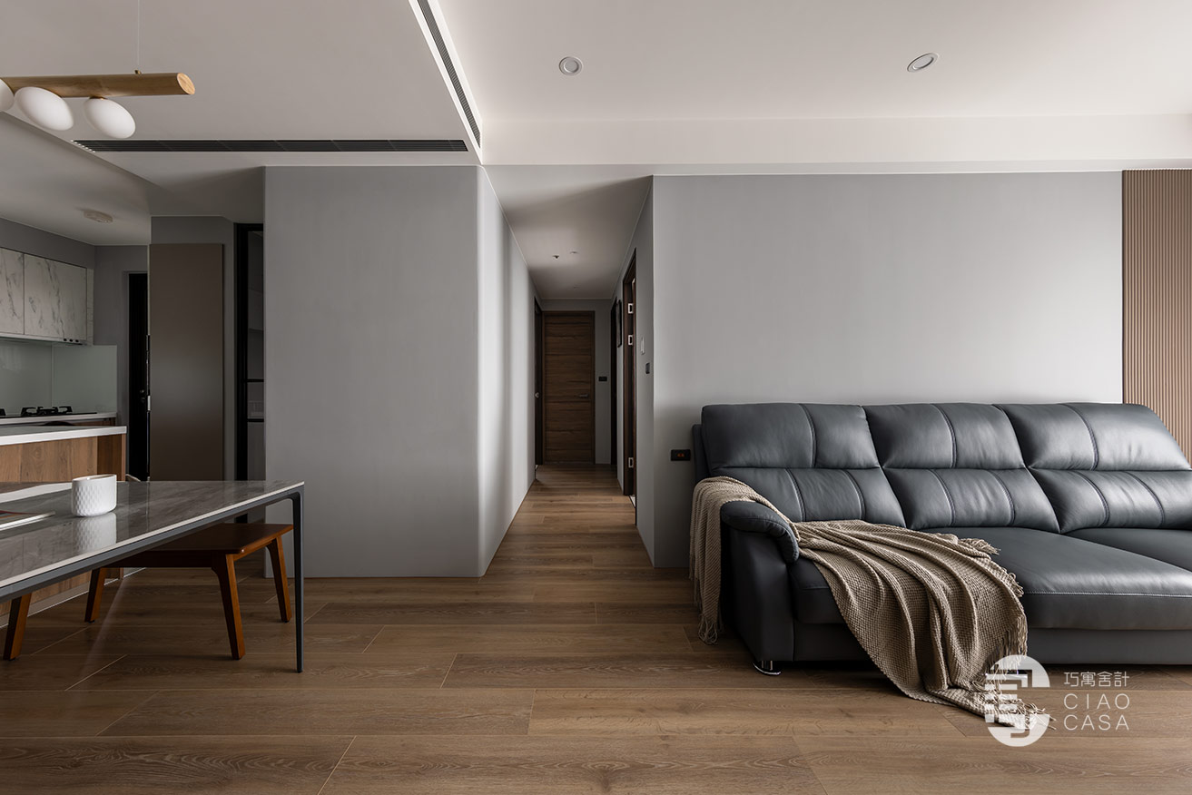 由於吊隱式冷氣的裝設,天花以降板設計自成框景,當視線透過由抑轉揚、由暗向明的變化,逐步展開更為寬廣的視野,在這段小徑中不只感受到情境的遞嬗,亦為「家」的到來埋下細膩且深刻的伏筆。