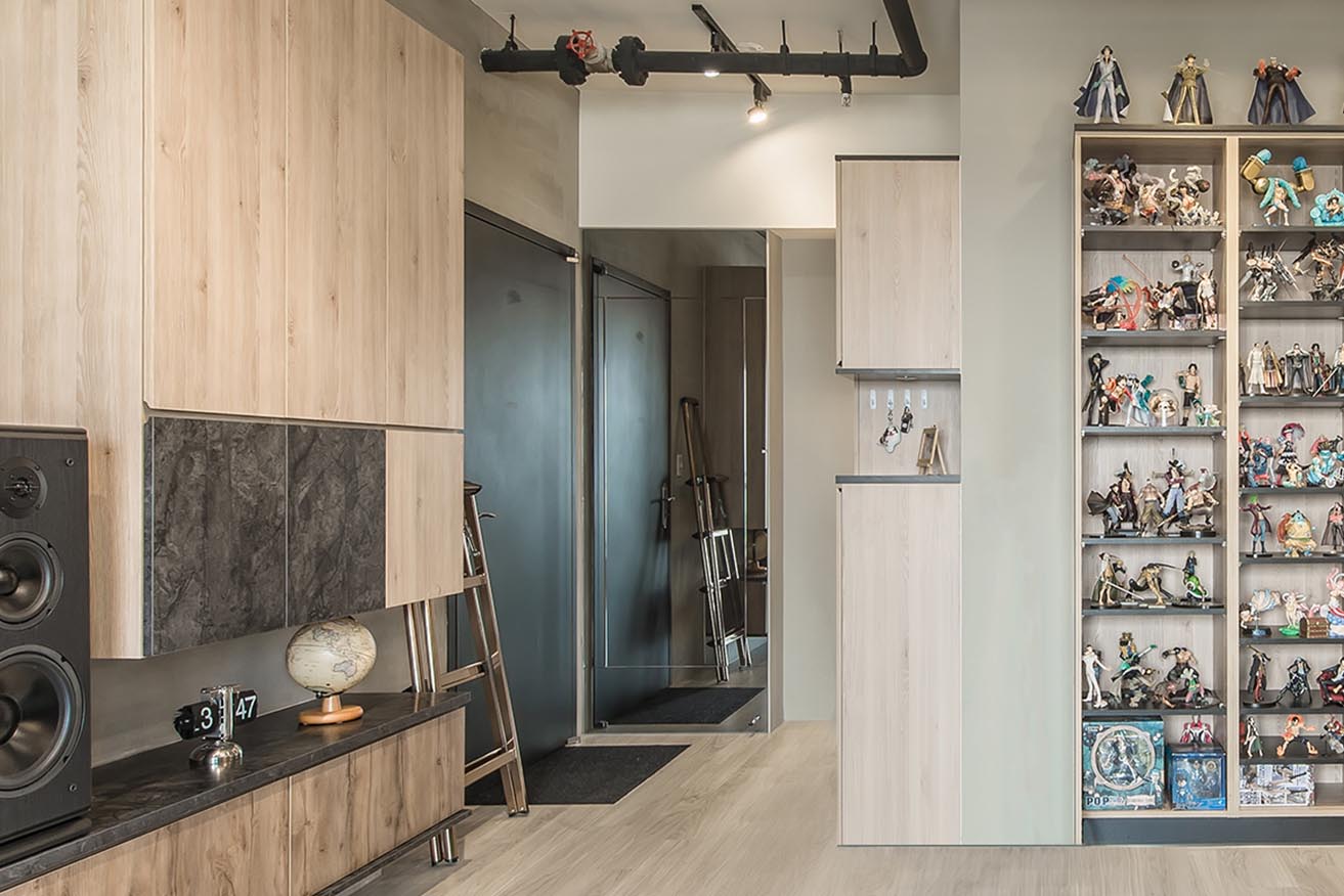全室以率性輕工業風築起基底,揀選未經修飾的樂土、水泥漆刷繪個性面容,同步揉合專屬品味與嗜好,跳脫滿坑滿谷、數不清的散亂印象,活用石紋與清水模板材等靈活可塑性,築起兼具機能與美感的收納層櫃,並客製化框構模型、公仔絕佳的展示舞台,讓興趣化為家中最迷人的一道端景。