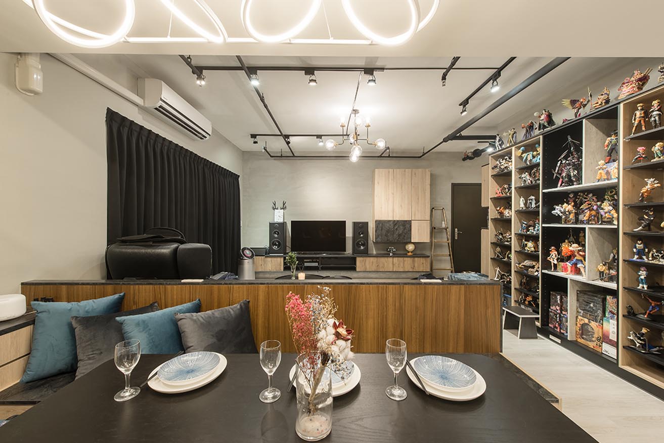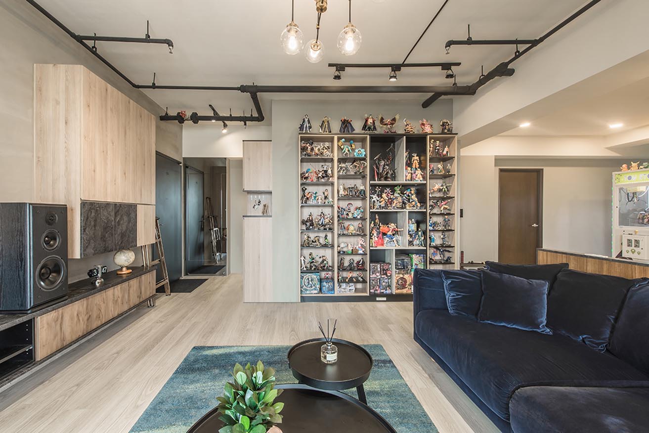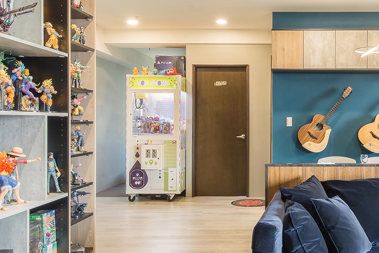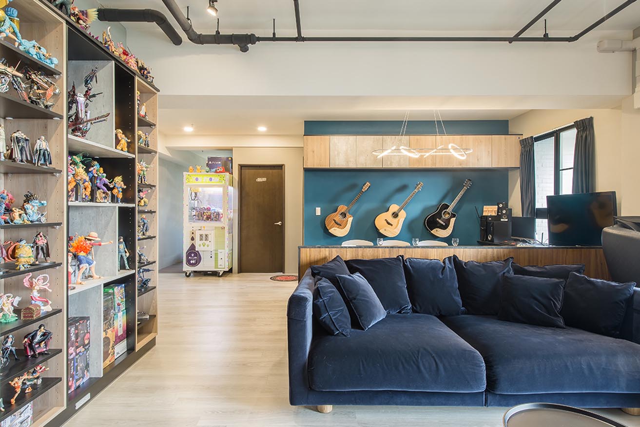 將屋主個人興趣收藏視為規劃主軸,精準拿捏適切的層櫃尺度,使眾多公仔模型得以完美展列,並規劃吉他主題牆,為家揮灑一抹吸睛亮點。