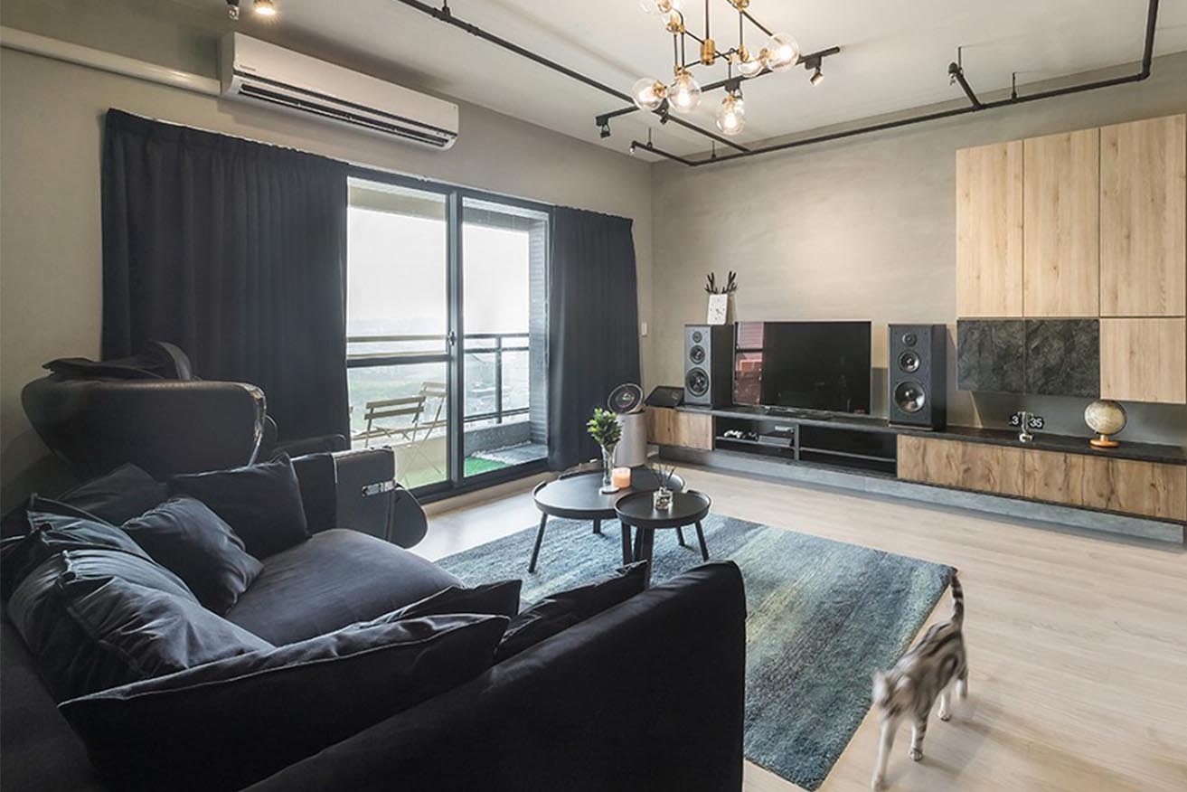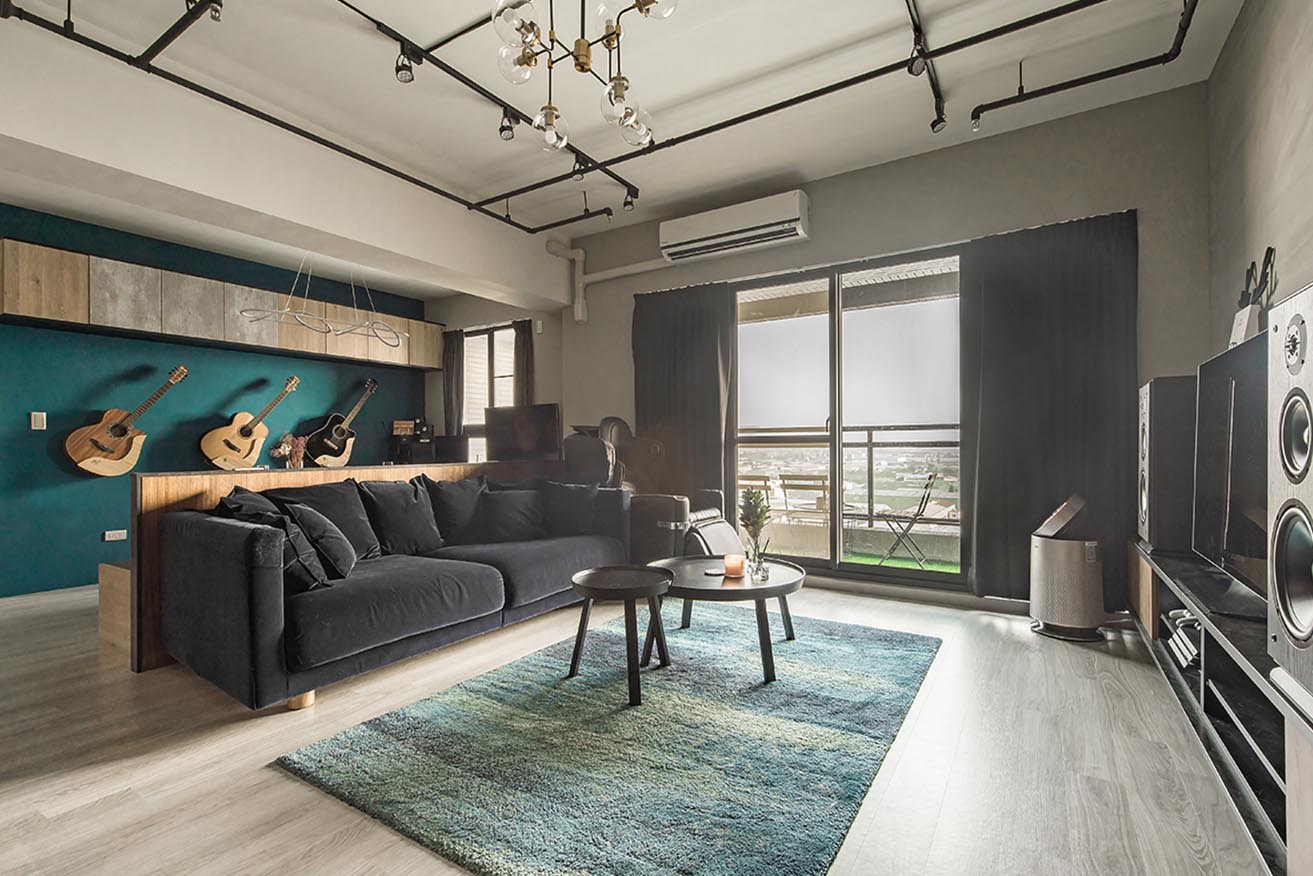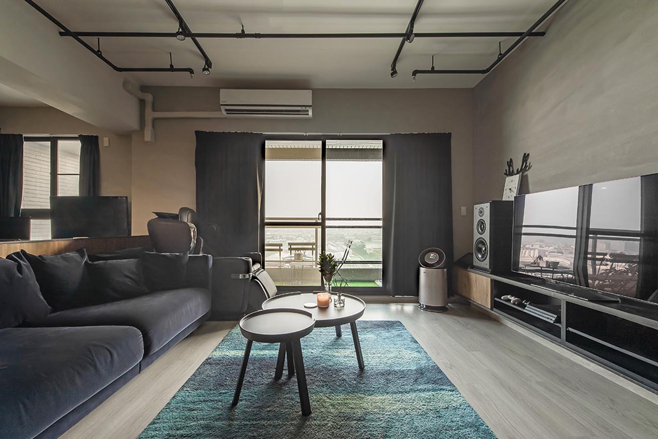 依循超耐磨木紋地板移轉至客廳,主牆以樂土自然塗抹紋理添增率性不羈氣息,並依其除濕透氣效果調節室內濕度,天花刻意敞開樓層淨高,裸露縱橫交錯的深黑明管,當和煦日光無礙流瀉照入,正好映襯剛硬線條的張力效果,窗邊擺脫常規冷氣窗簾盒呈現手法,精準拿捏裸露管槽的排列走向,藉以詮釋工業風不同風貌。