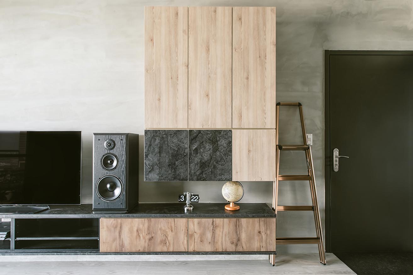 溫潤木質懸空壁櫃基於拿取便利度,精心齊平電器高度刻畫分割線,免於高櫃流於沈重壓迫,並選搭易開闔的斜型門板保持簡淨視感,下側特意植入墨黑石紋門板烘托原始質韻,任其奔放肌理鋪述工業粗獷氣息。
