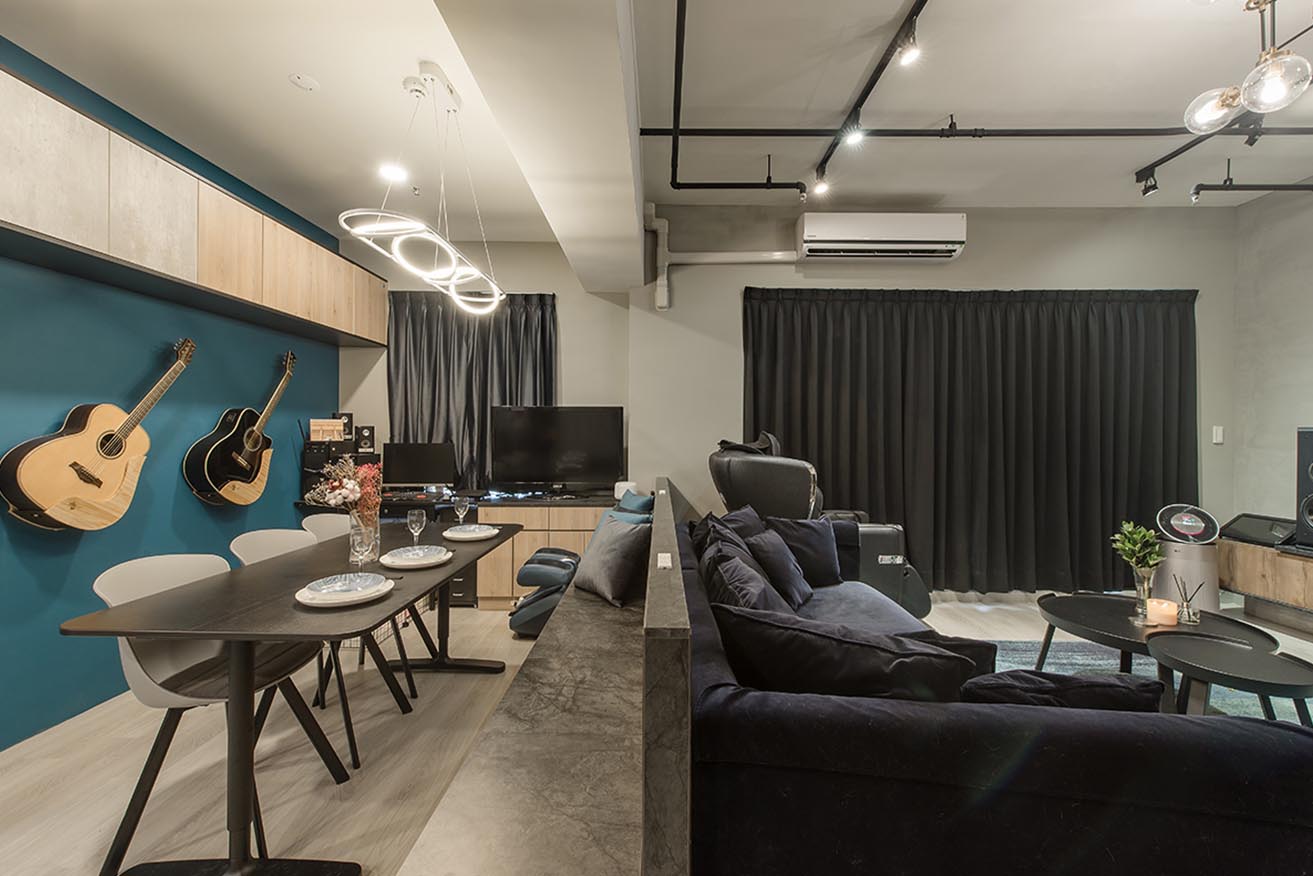餐廳主牆佈染一面莫蘭迪藍綠,奠定內斂沈穩的基底,使屋主吉他完美襯托展示,橫列懸吊壁櫃悉心不置頂,為未來預留擴充彈性,局部門片跳脫木紋質調,穿插清水模紋理添增原始氣息,成為獨具個性品味風格牆。
