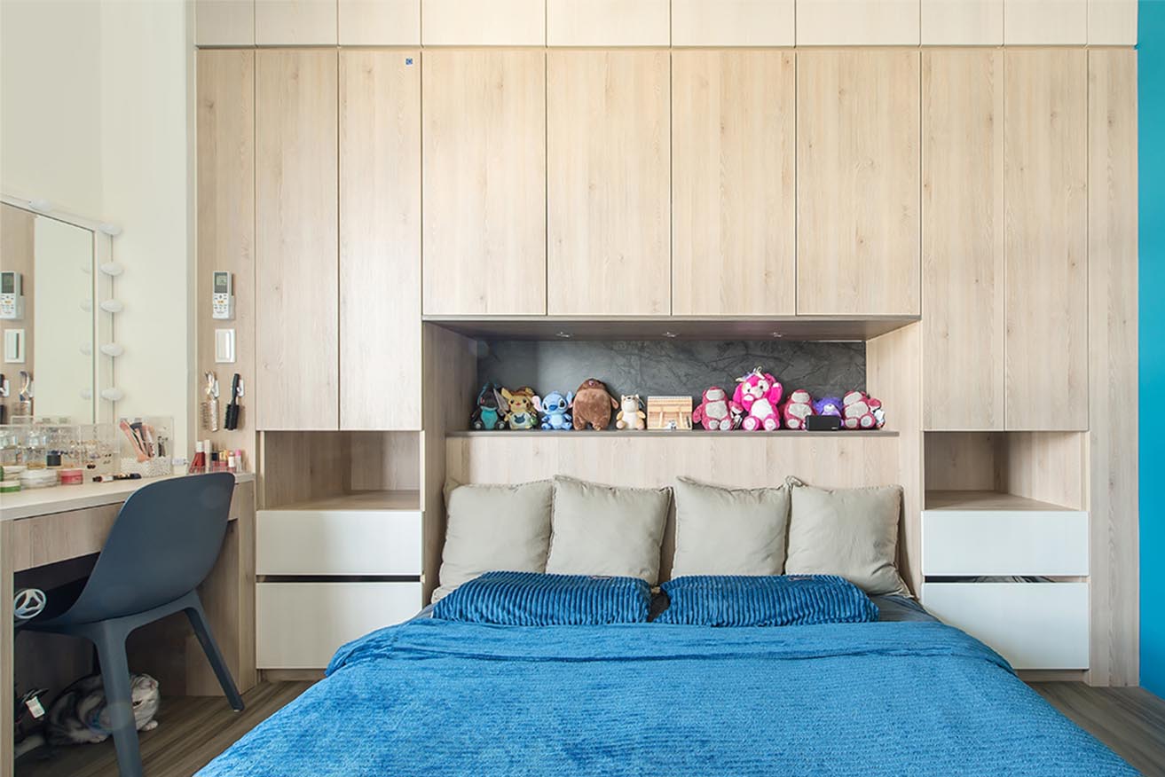 依據日常使用習性,兩端推展對稱式床頭淺台與邊櫃,預先配置插座設備,創造流暢順手動線,後側背牆內嵌上掀式石紋飾板,蘊藏換季衣物與寢具的大容量空間,閉闔時,得以適切擺放絨毛玩具,更隱藏柔光嵌燈,隨時切換小夜燈光氛情境。