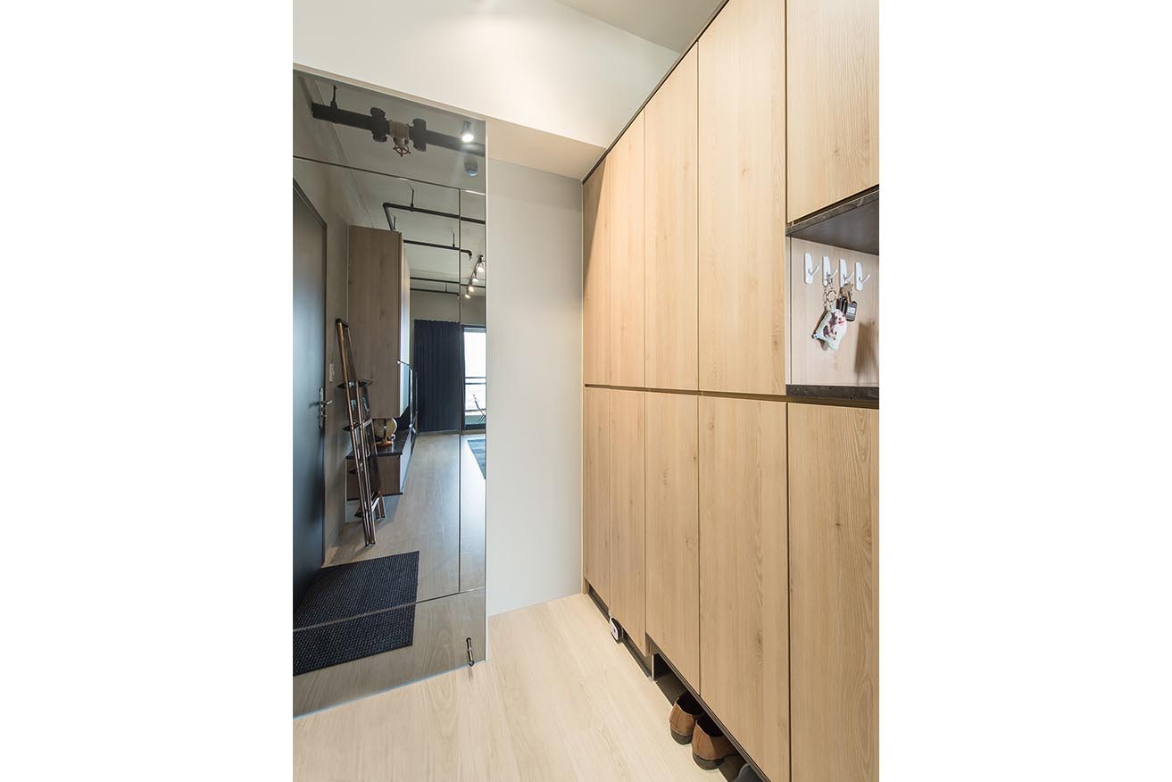 舉步踏入玄關,即可一眼望穿連續面收納鞋櫃,考量公空間天花並無封板設計,特意捏塑樑下恰如其分的尺度,維持櫃體高度一致的視野,藉以整合簡潔和諧的視覺水平,入門左側以拍拍手黑鏡門片遮飾變電箱,閉闔時搖身一變為整裝鏡,經由鏡面明亮、放大緊促落塵區。