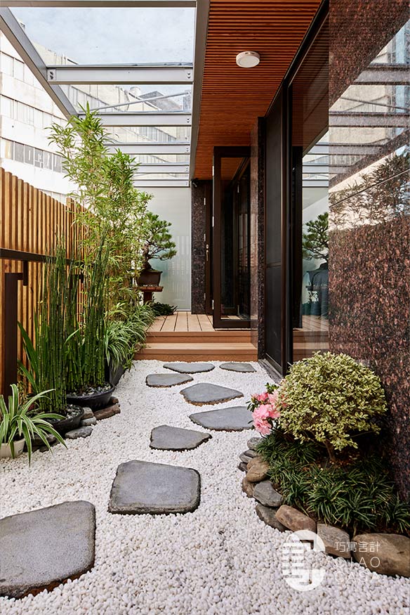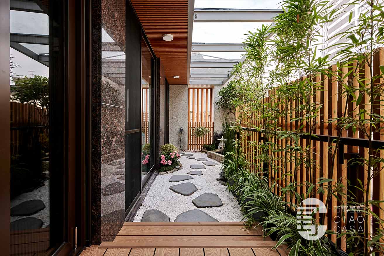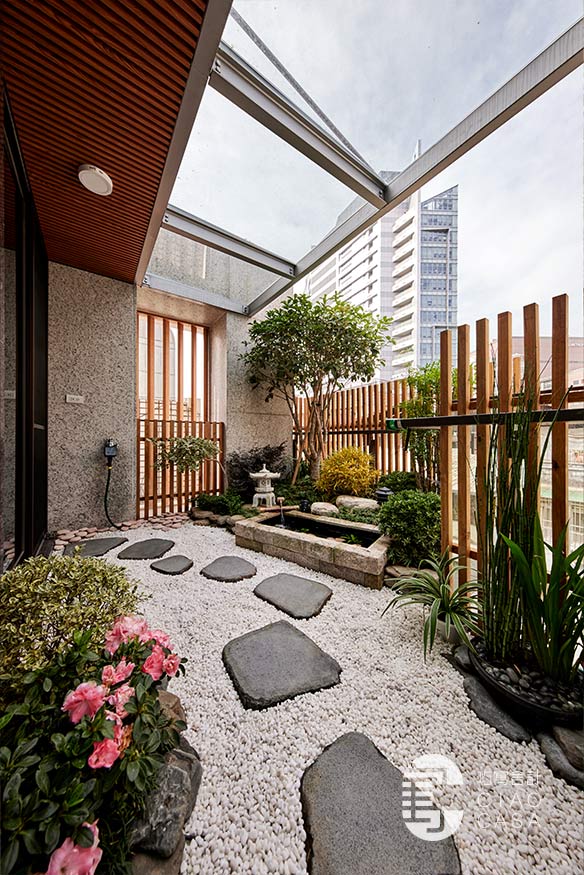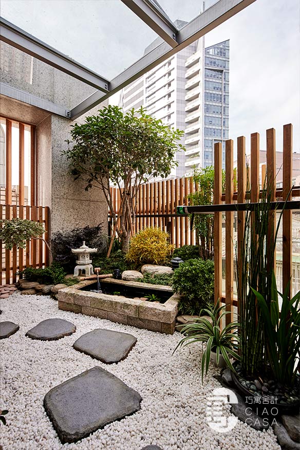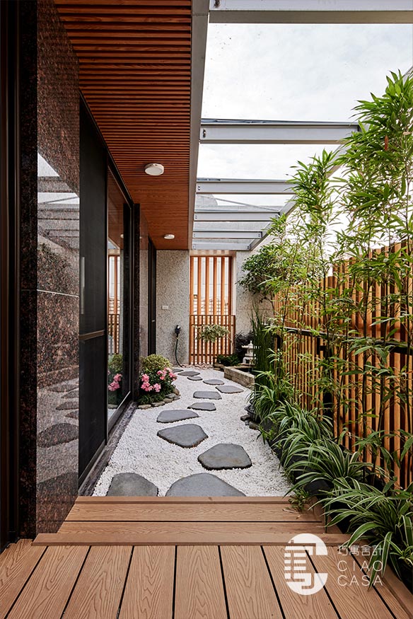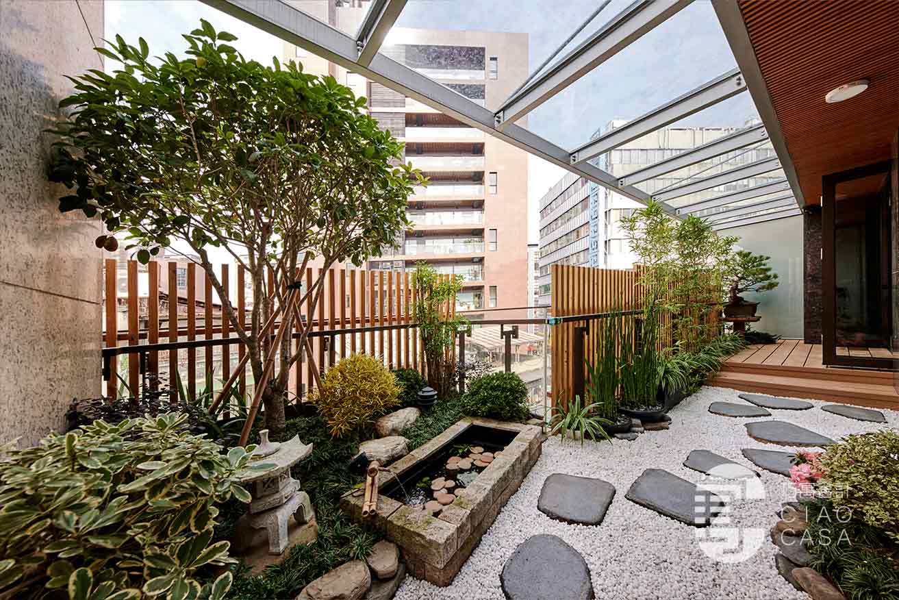 日式庭院以手鑿面花崗岩石踏板、卵石鋪於地面,保留地面排水性,造景以唐竹、桂花樹為主體,不僅能防突風,搭配上南方松屏風,作為隔屏保有隱私,更有淡淡清香繚繞,與景觀生態水池結合,與客廳相連處,更選栽種了日式老松樹盆作為視覺主體,為空間醞釀愜意閒適的氛圍。