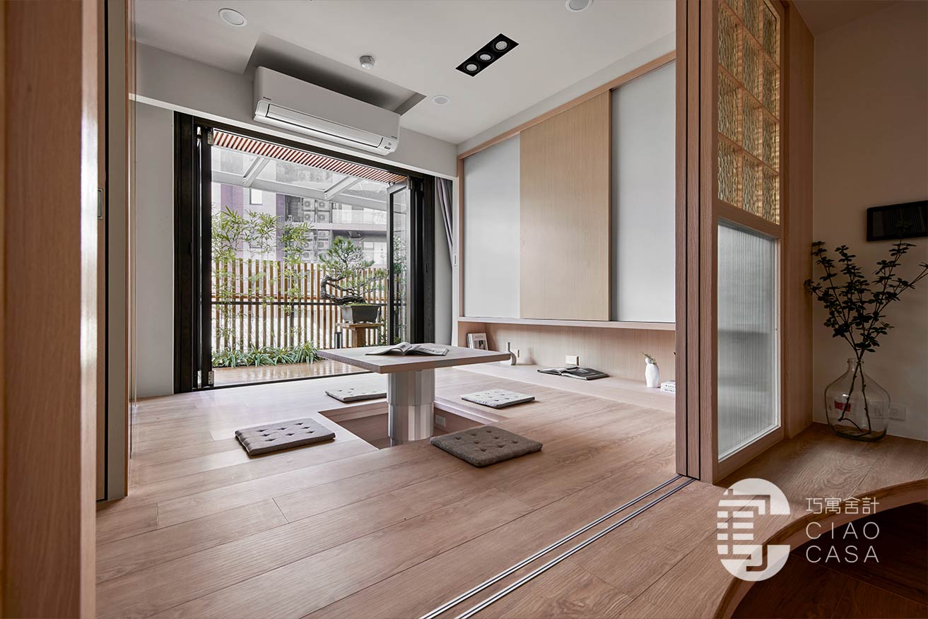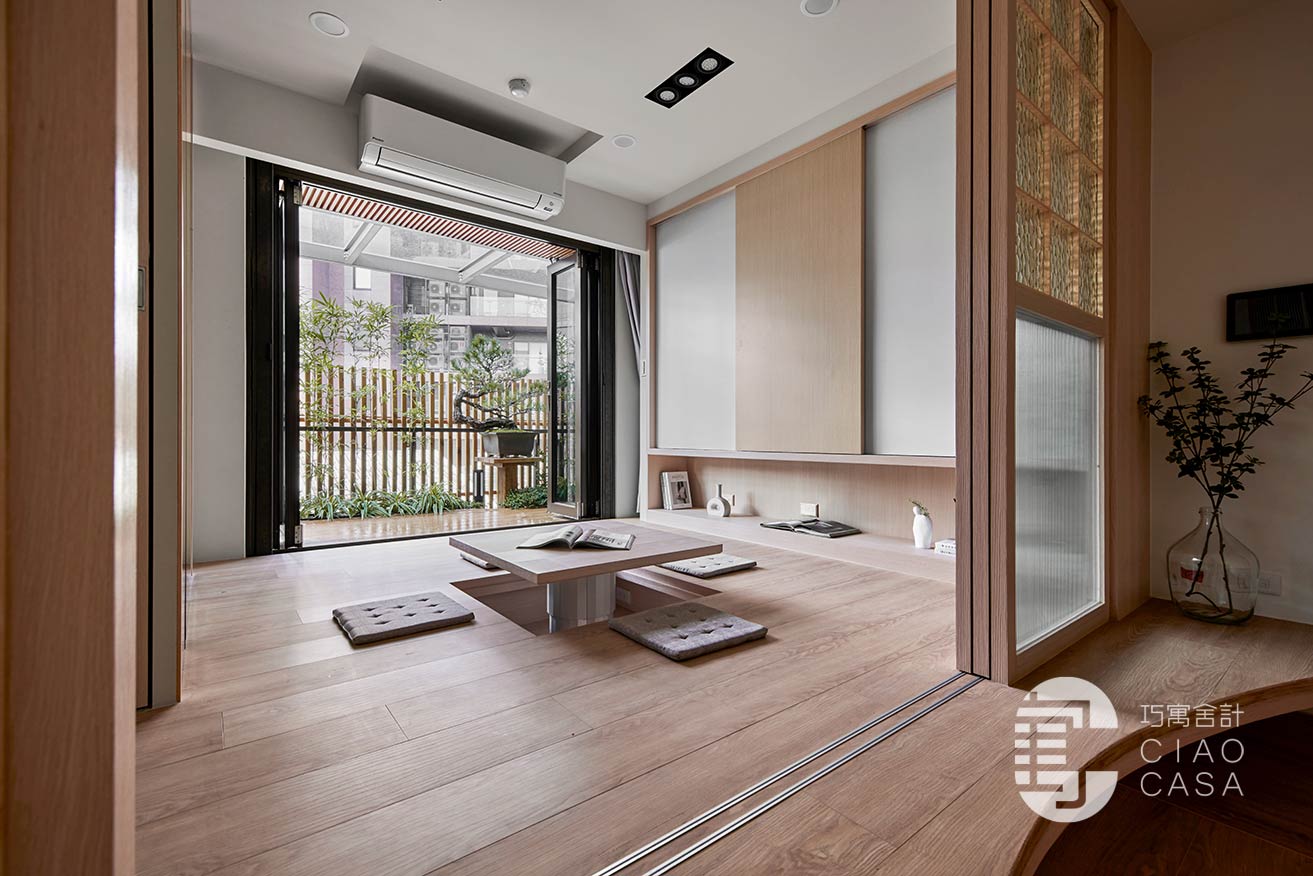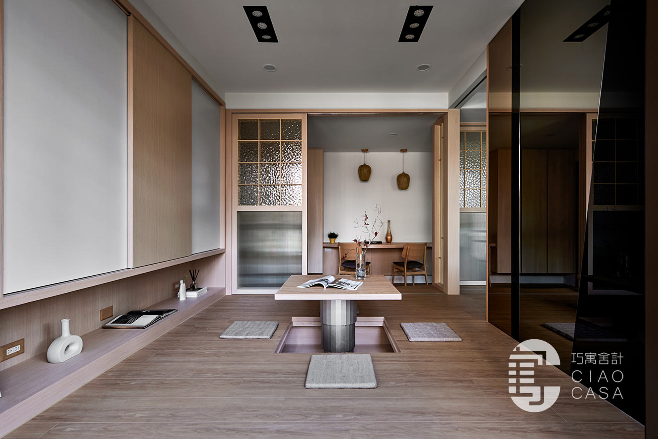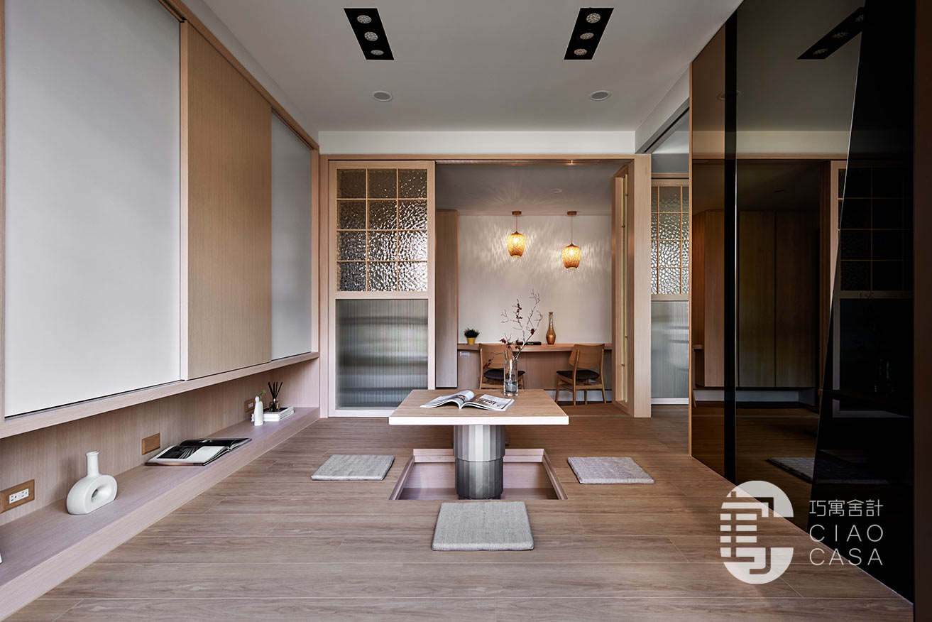 設計師以木質材料作為空間主軸,結合地台設計,以及打造正統日式庭園造景,共同形塑出濃厚的日式氛圍。並根據業主的家庭成員,重新規劃空間格局與動線,將空間巧妙串連,提供居者多重的場域用途,築構出美觀與實用兼具的機能美宅。