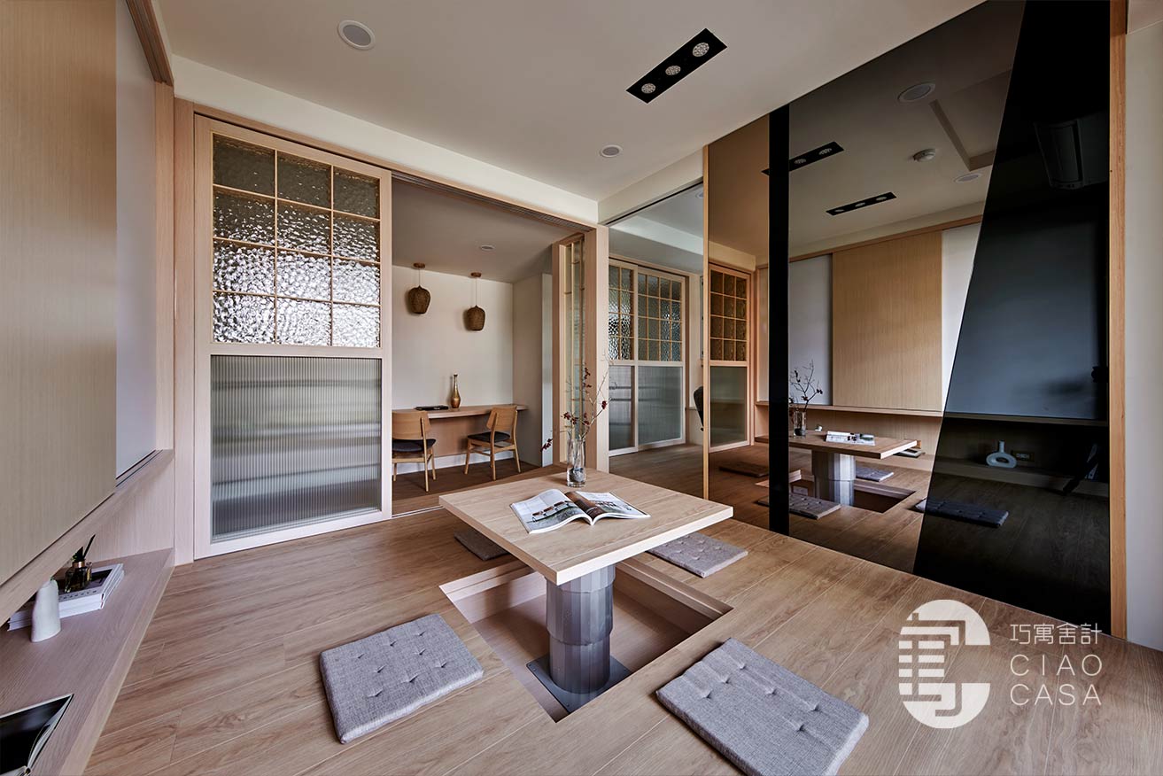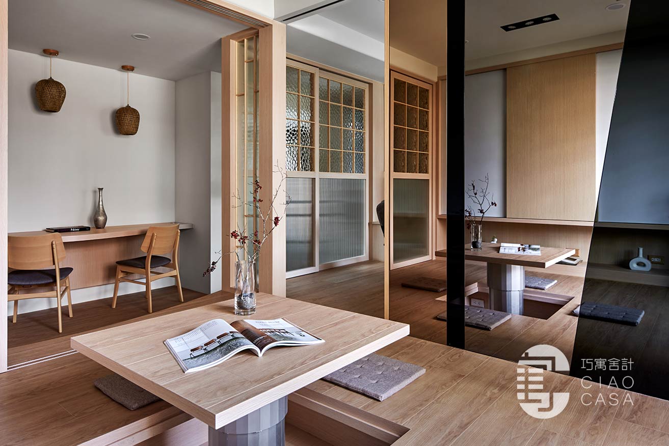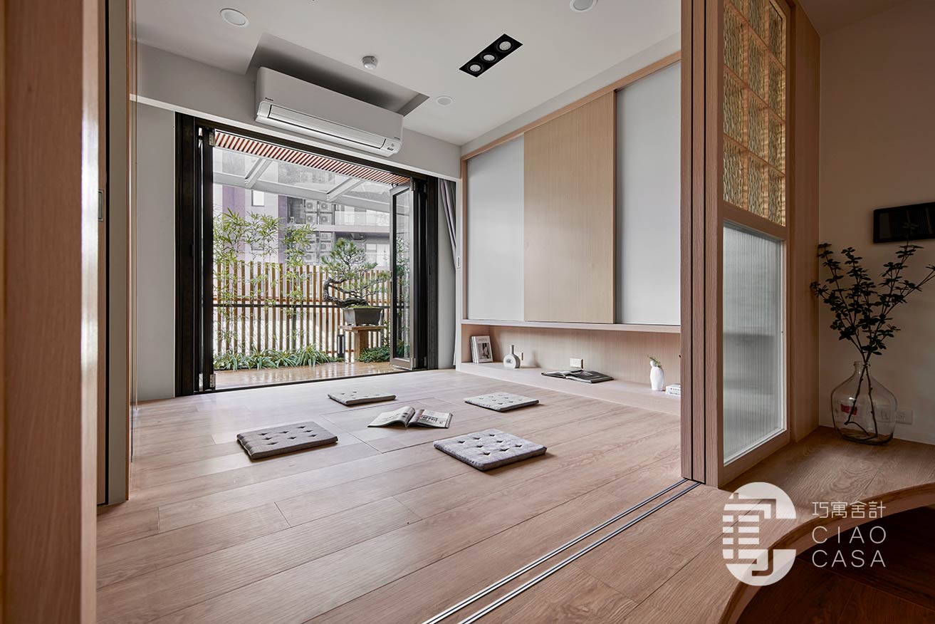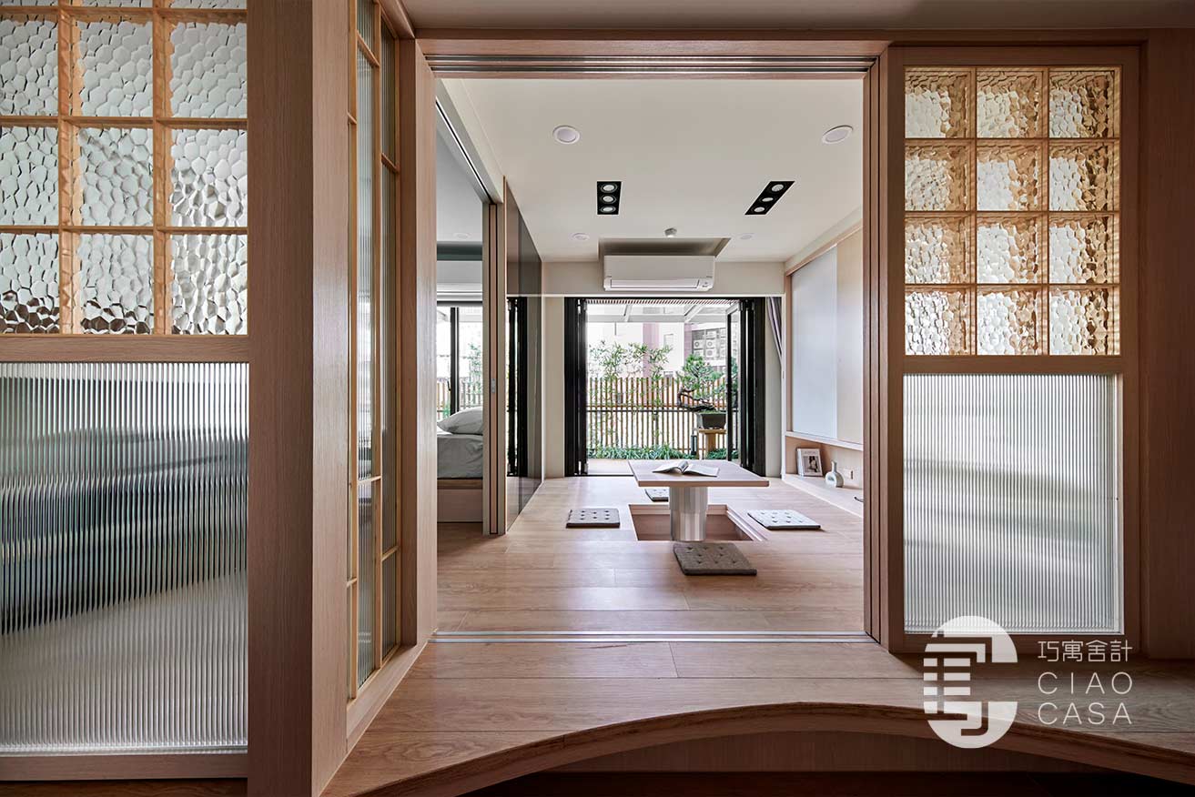 設計師以木質材料作為空間主軸,結合地台設計,以及打造正統日式庭園造景,共同形塑出濃厚的日式氛圍。並根據業主的家庭成員,重新規劃空間格局與動線,將空間巧妙串連,提供居者多重的場域用途,築構出美觀與實用兼具的機能美宅。