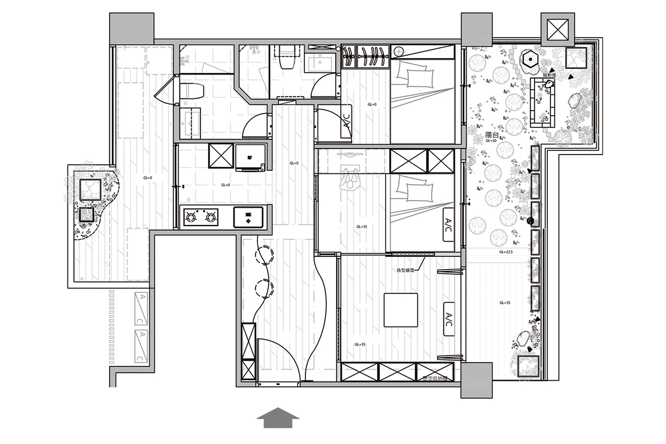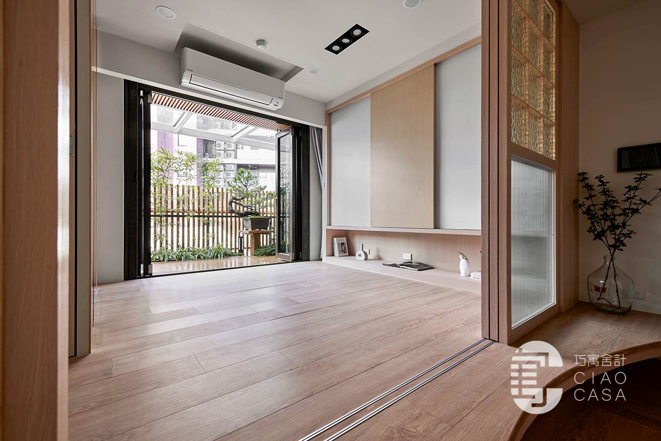 在客廳與陽台的銜接處設有全開式鋁窗拉門,作為架高木地板客廳與陽台間的接壤。待鋁窗拉門推開之際,便能將視界從室內空間延伸至室外的景觀庭院,讓即使位處於高樓層的住宅也能擁抱綠意。
