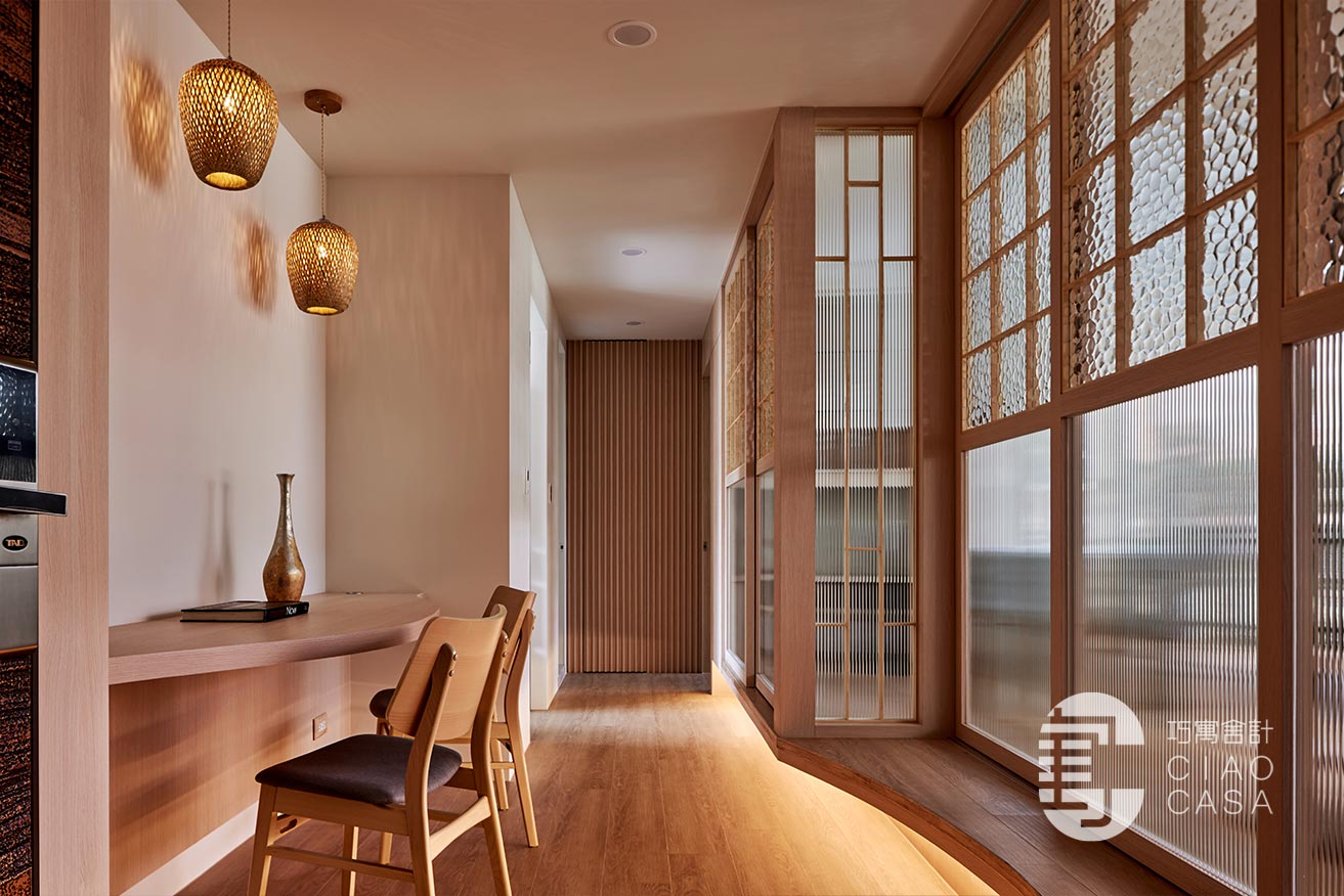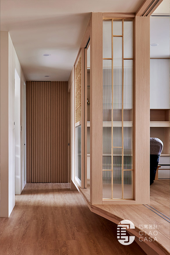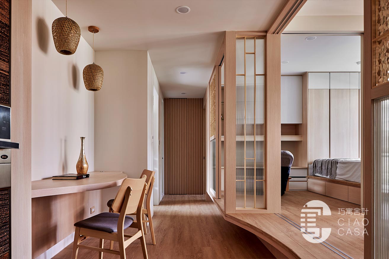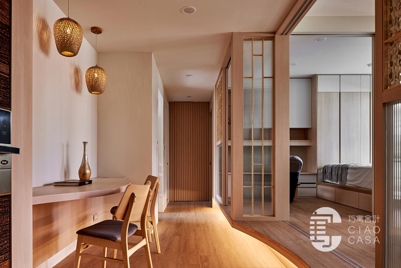 甫入屋內,以流線型的設計延展視野範圍。並獨具匠心地將書桌設於長廊側邊,善用每一隅場域,提高空間使用性。在公領域及私領域,採用地台設計與拉門做界定。