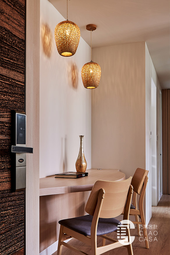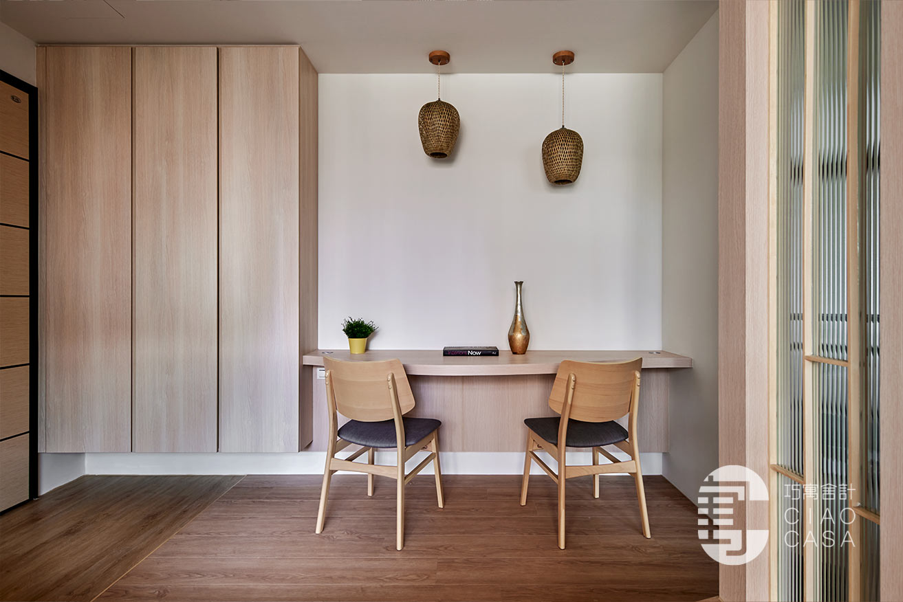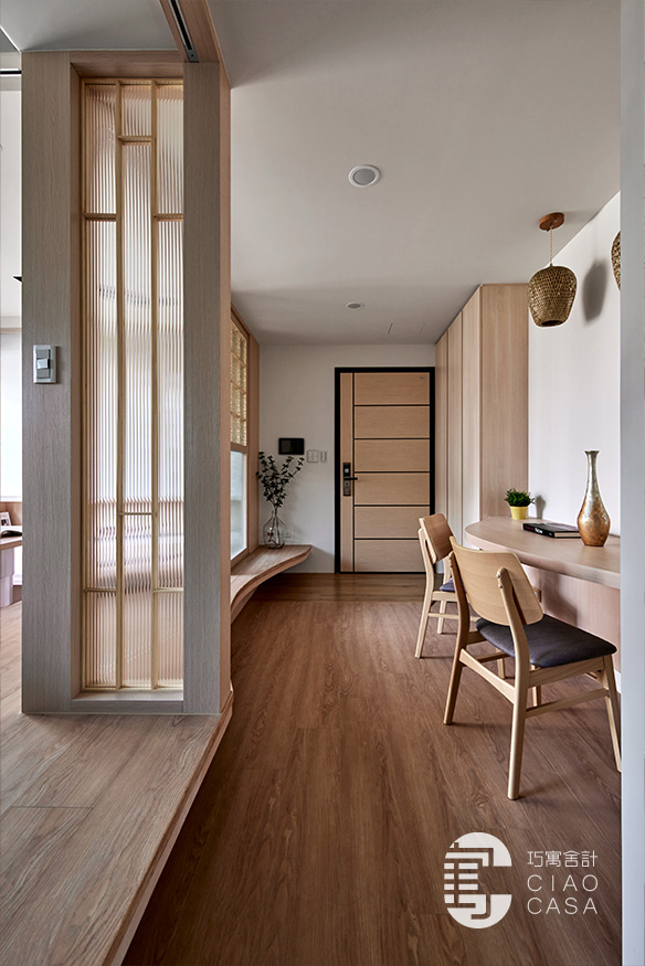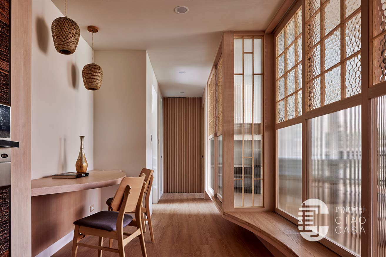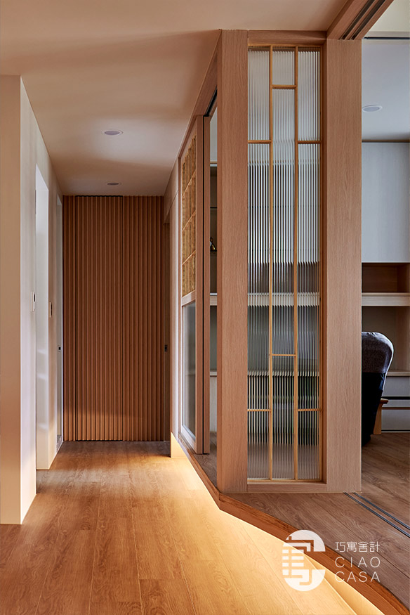 甫入屋內,以流線型的設計延展視野範圍。並獨具匠心地將書桌設於長廊側邊,善用每一隅場域,提高空間使用性。在公領域及私領域,採用地台設計與拉門做界定。