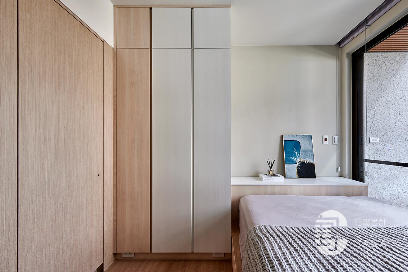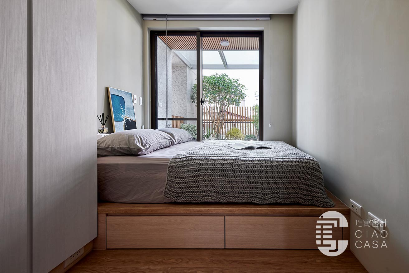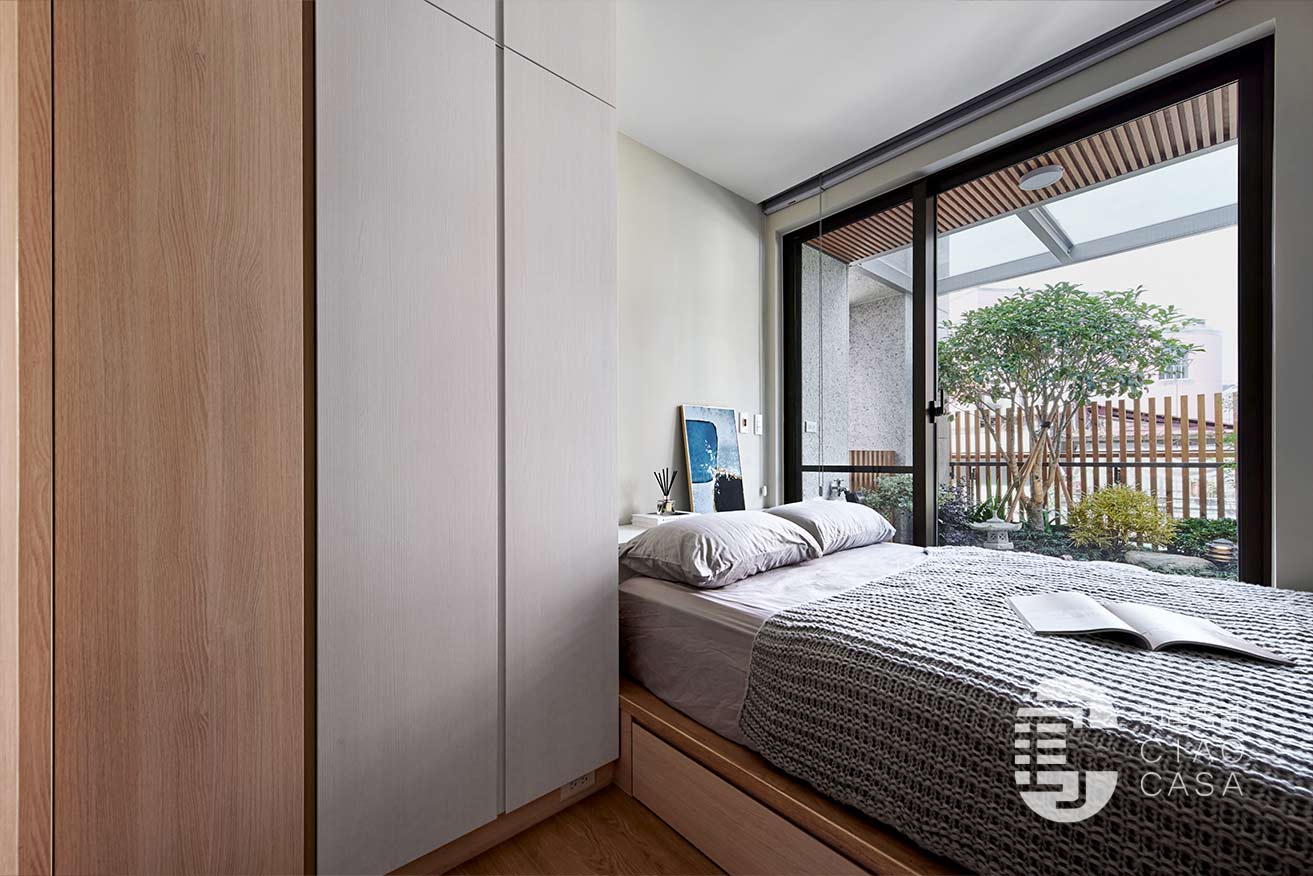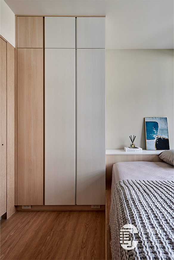 緩步移動至臥室,在木質基底中添以灰色調,營造舒適靜謐的休憩環境,令居者從容享受日常時光。