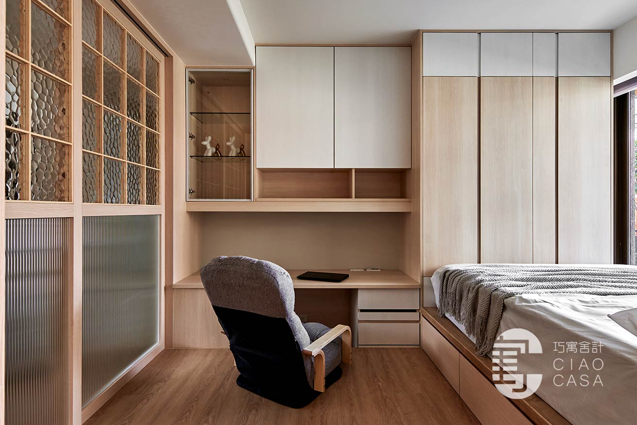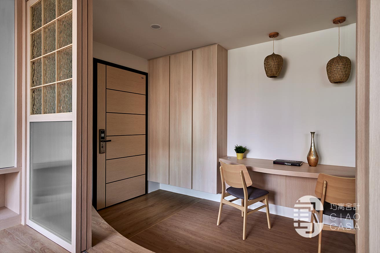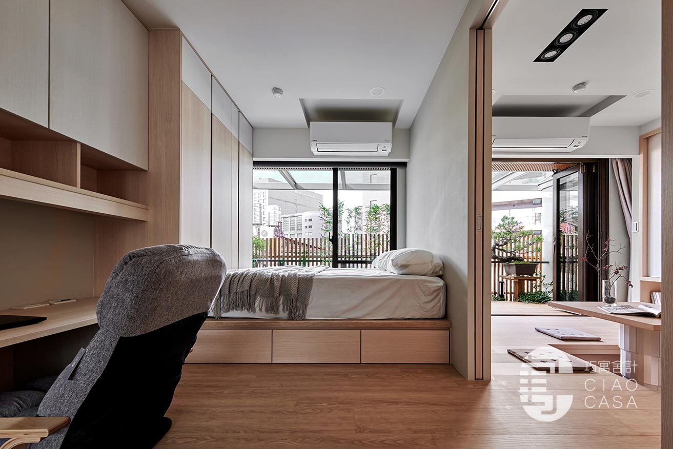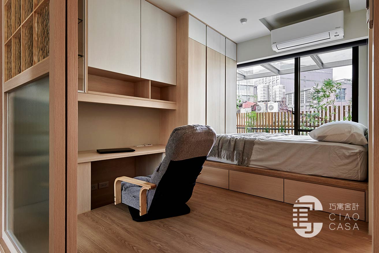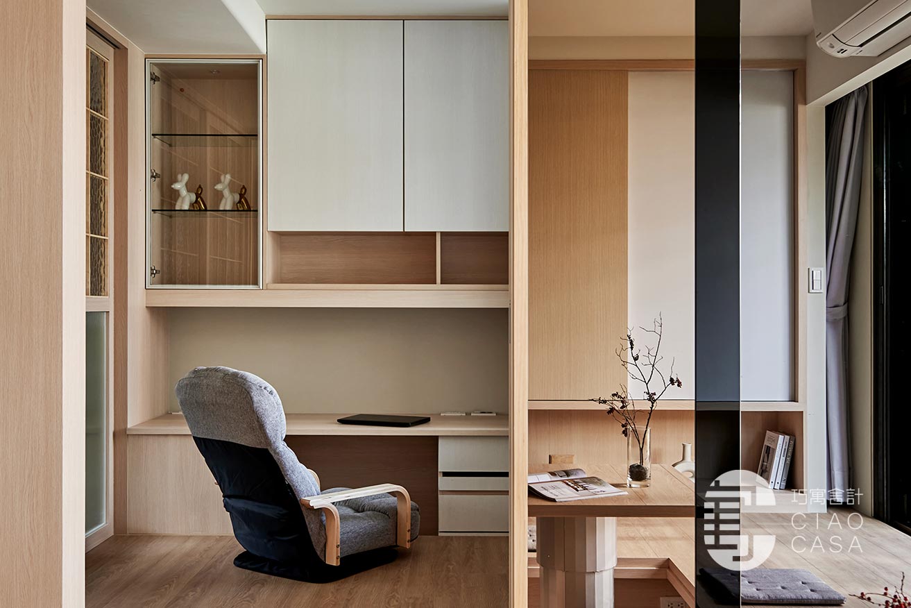 日式風格獨有的寧靜、簡約感,設計師將原有小兩房侷促格局重新規劃,將墊高的和室與臥室空間,以日式拉門作為隔斷,再將玄關、廊道與工作桌統合在同一動線上,靈活運用增添空間彈性。都會鬧區中獨享大面積前陽台,設計了天人合一的日式造景,將日式風格延續至戶外空間。