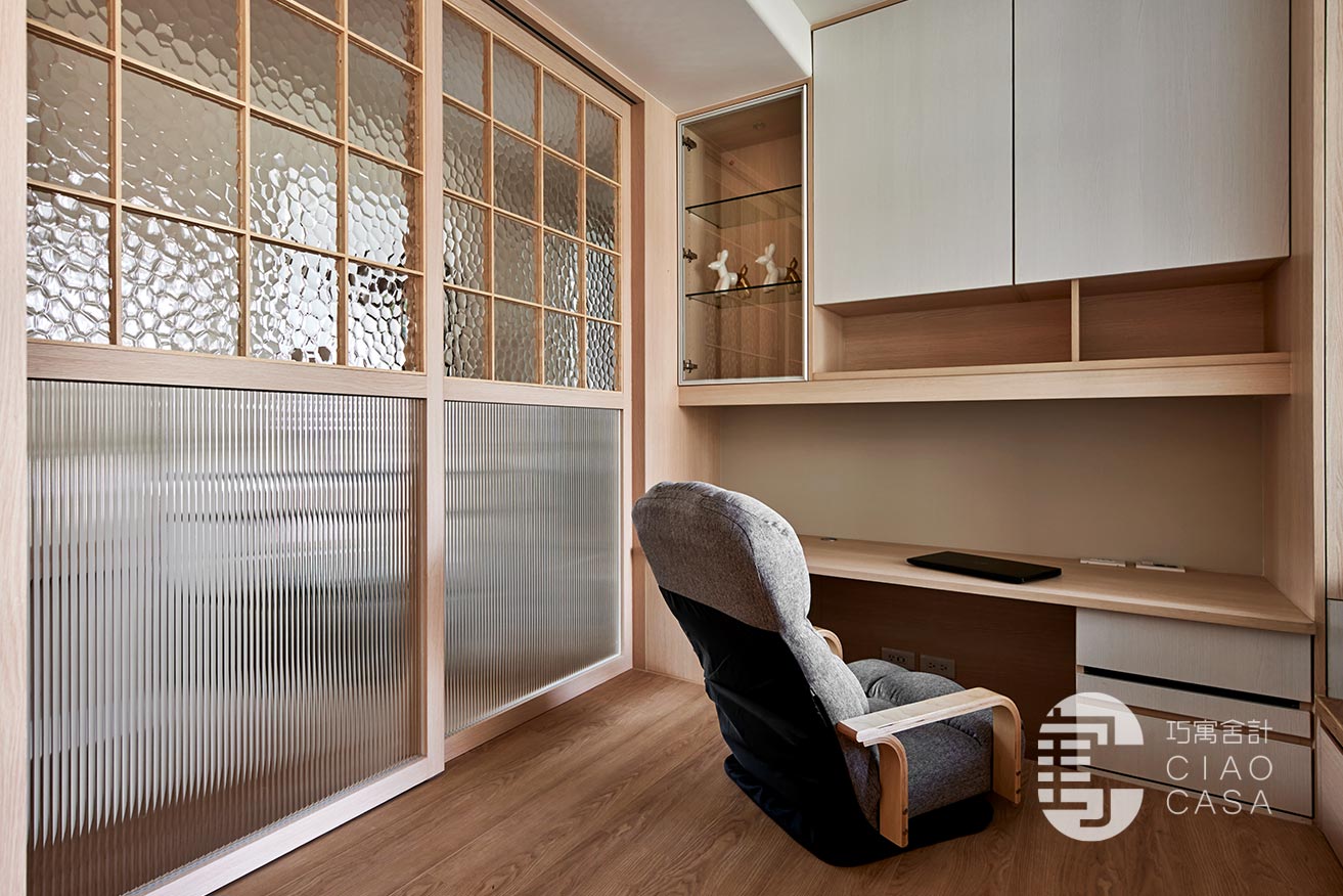 拉門利用兩種紋理的玻璃片增添層次感,同時,亦讓光線得以恣意穿透。此外,拉門可依照使用者需求做調整,讓空間能在寬敞與獨立之間作轉換。走向客廳,設置一電動升降桌於中央,賦予多元的使用機能,滿足不同情境需求。