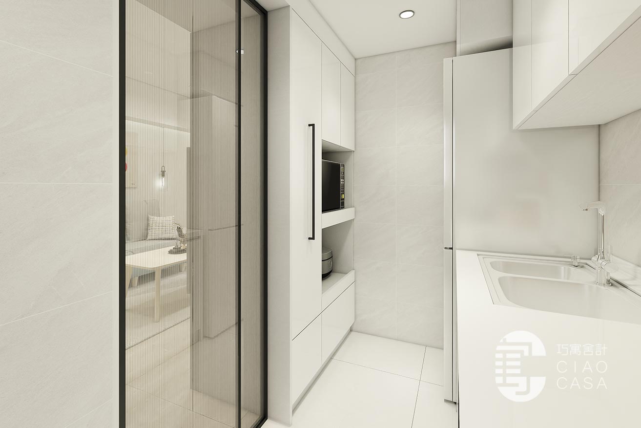在不影響結構安全下,設計師將主臥分間牆局部切割拆除,形成一個細長的小窗,窗內崁入半透明的長虹玻璃,將光線引入沒有窗戶的客廳並兼具隱私性,也因為居住成員比較單純,這樣的採光巧思才不會因為隔音性能下降而影響客廳的使用者。