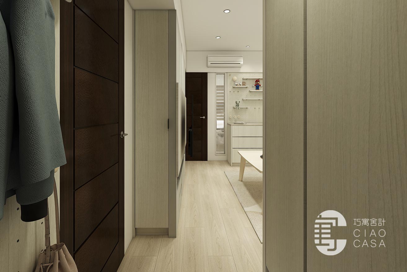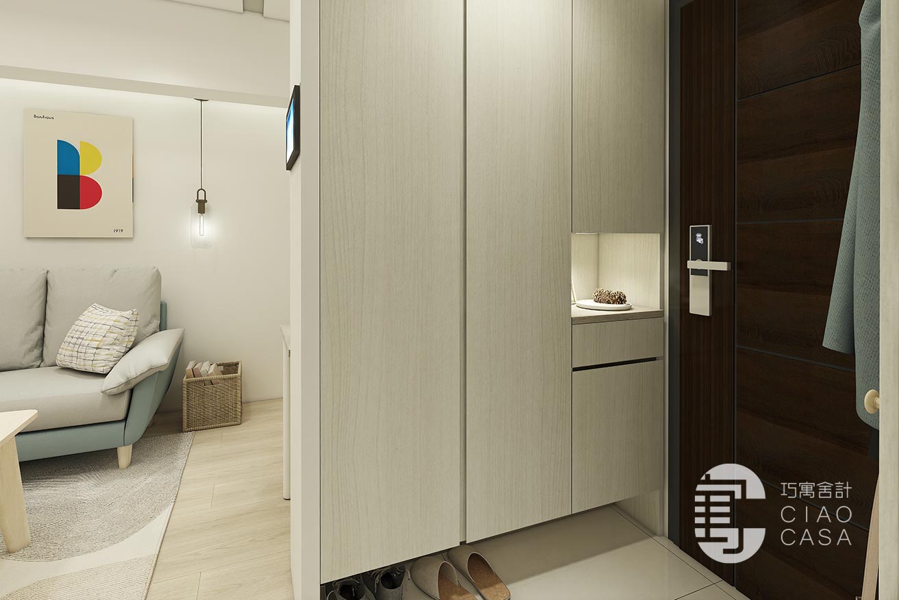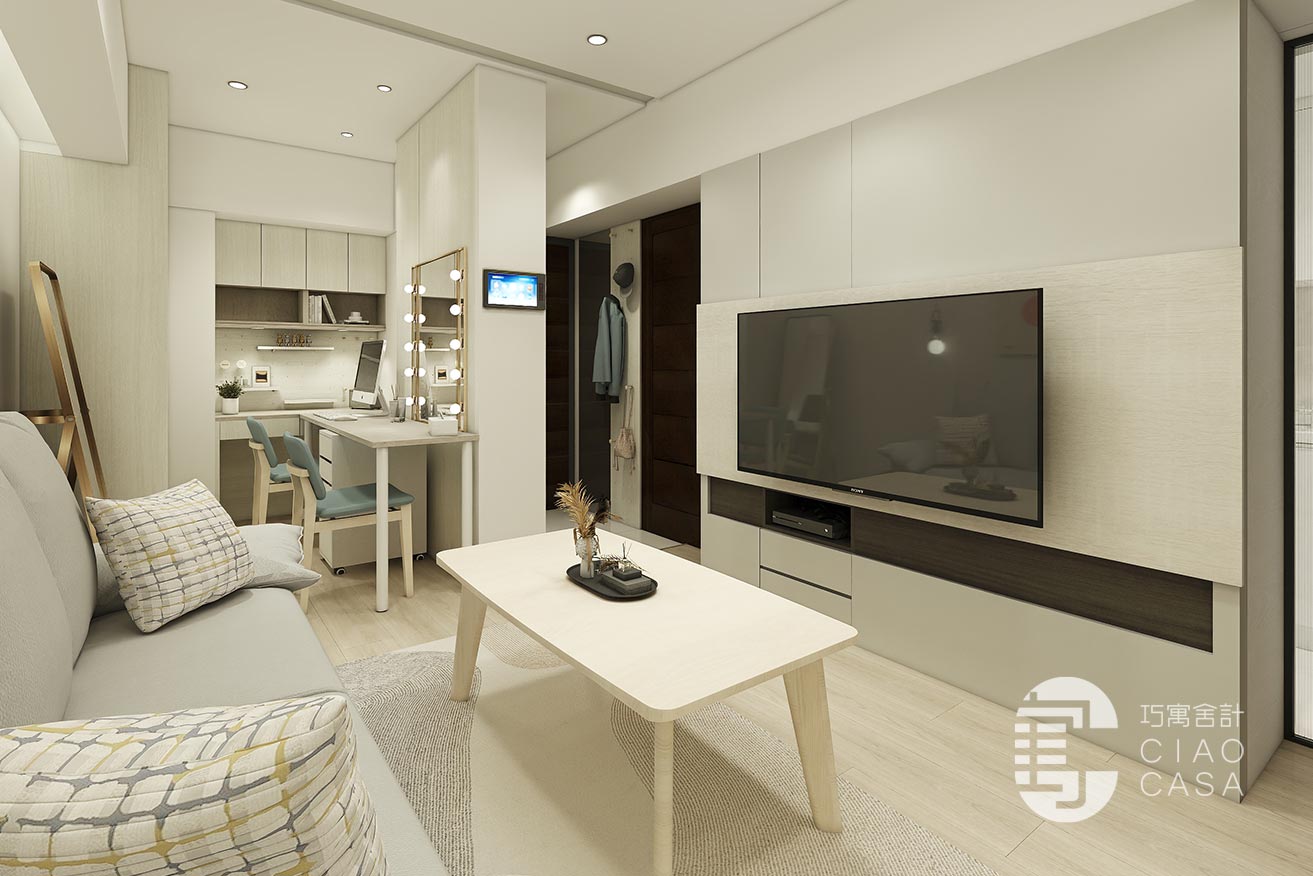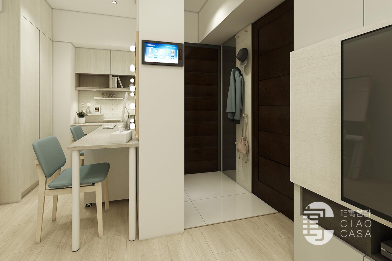 玄關後方的區域,是兩人的工作空間,大面的化妝鏡是美妝師女主人夢美以求的配件,全屋選用淺色、白色為主的系統門板,是為了凸顯兩人繽紛的公仔、噴漆畫等等收藏品,讓空間退居配角,將主角還給屋主。