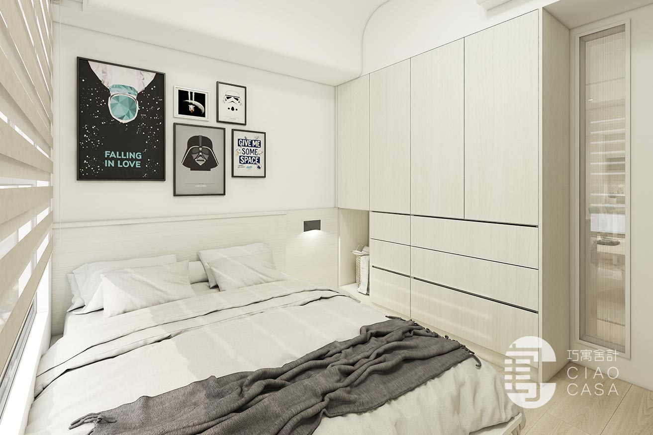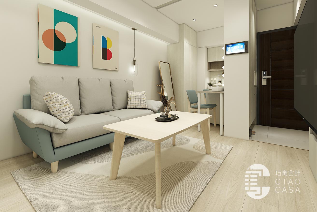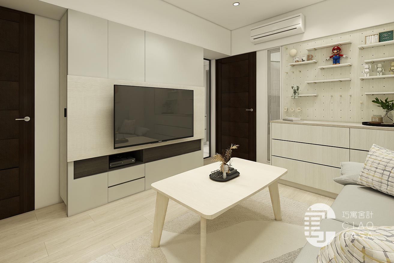 玄關後方的區域,是兩人的工作空間,大面的化妝鏡是美妝師女主人夢美以求的配件,全屋選用淺色、白色為主的系統門板,是為了凸顯兩人繽紛的公仔、噴漆畫等等收藏品,讓空間退居配角,將主角還給屋主。