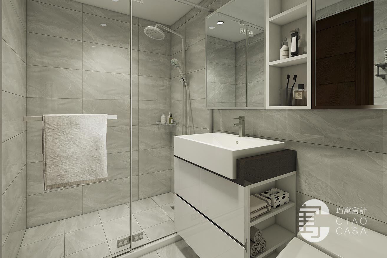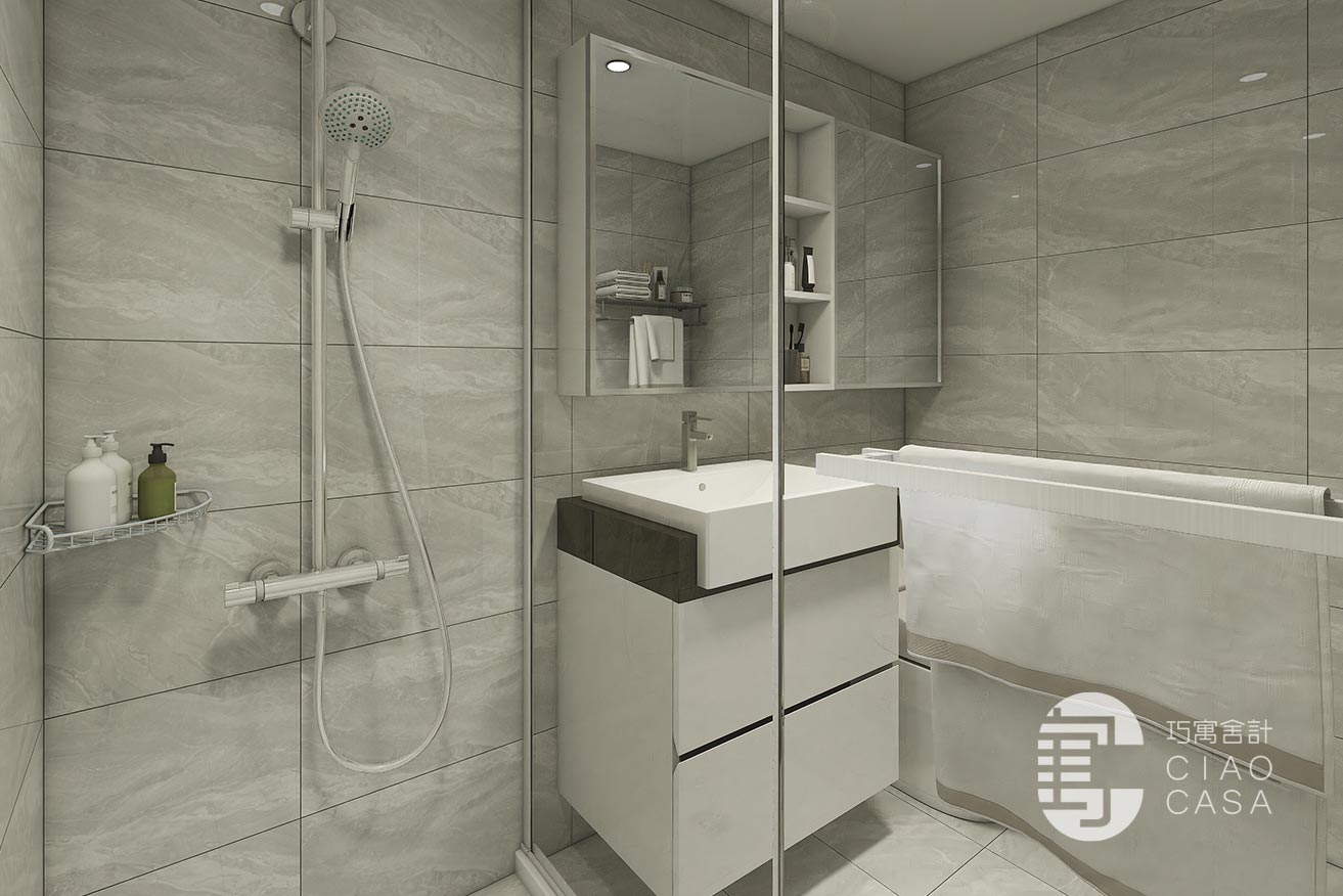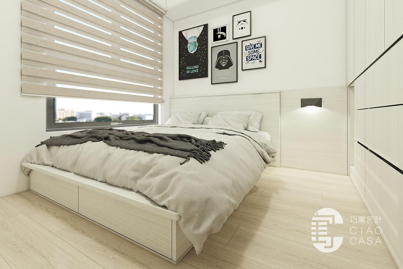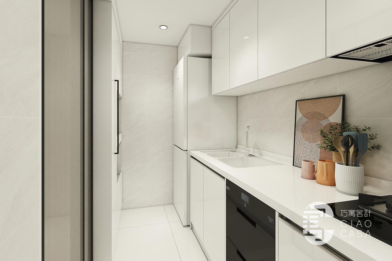 玄關後方的區域,是兩人的工作空間,大面的化妝鏡是美妝師女主人夢美以求的配件,全屋選用淺色、白色為主的系統門板,是為了凸顯兩人繽紛的公仔、噴漆畫等等收藏品,讓空間退居配角,將主角還給屋主。