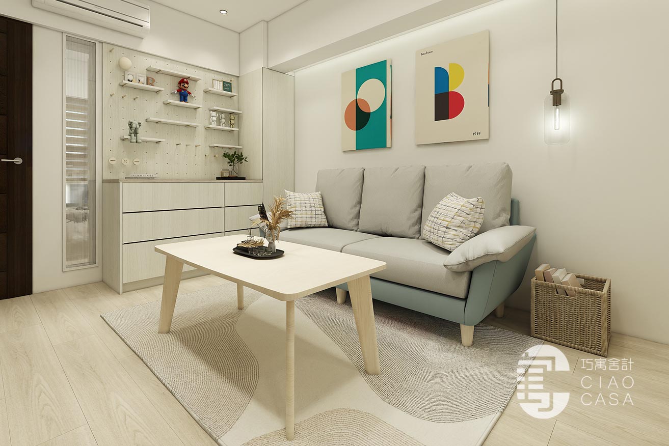 展示空間主要利用洞洞板設計,增添空間趣味性,屋主可以自由調整層架位置,搭配各式洞洞板配件,還能在書桌上方吊掛耳機、3C配件,兼具展示與收納。